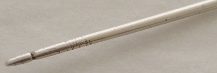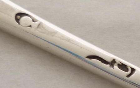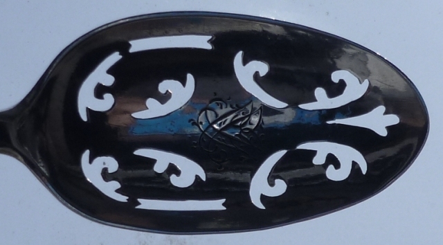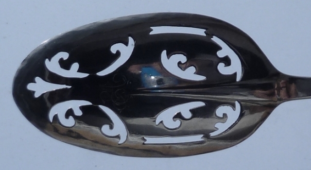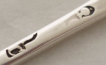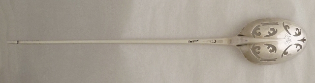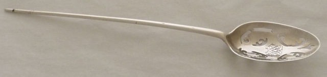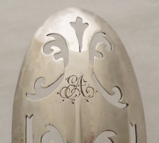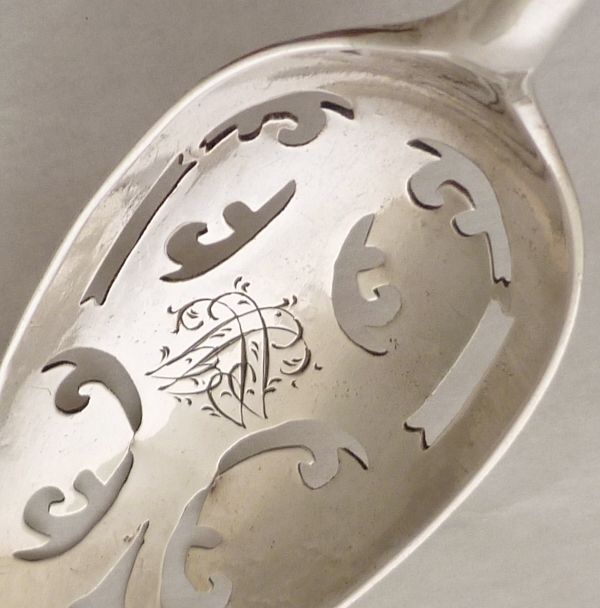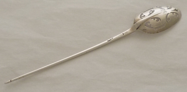Original Georgian silver mote spoon with a long rat tail, the pale and scroll pierced bowl later engraved 'EA' to the bowl back and within the bowl with the earlier and original reversed initials 'LL'. Correctly marked twice to the bottom of the stem with the maker's punch twice. |