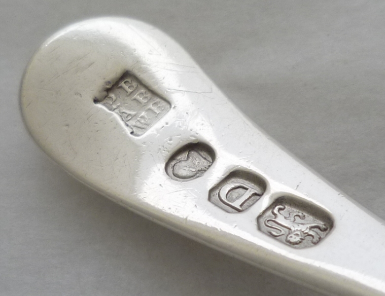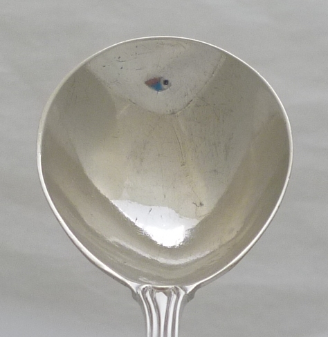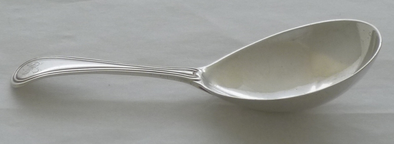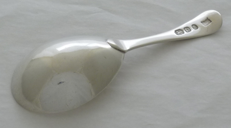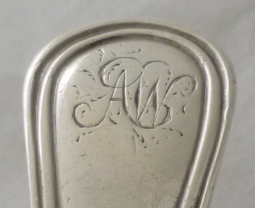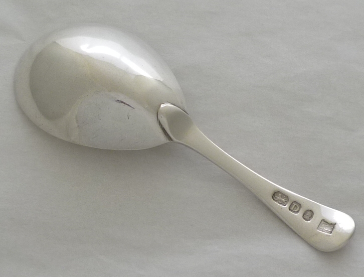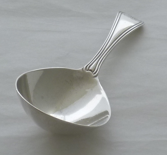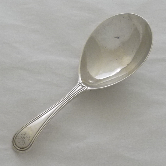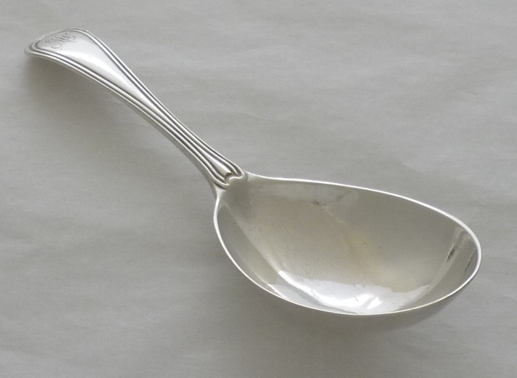 Larger Georgian silver Old English & Thread pattern caddy spoon with a deep, pear shaped bowl and original engraving to the terminal. |