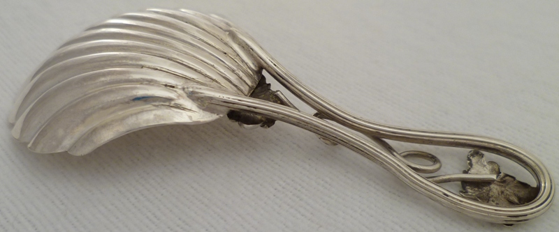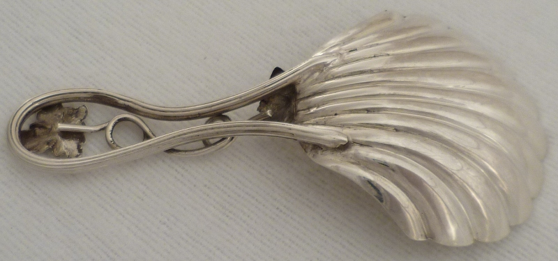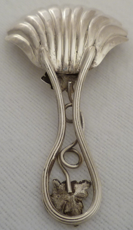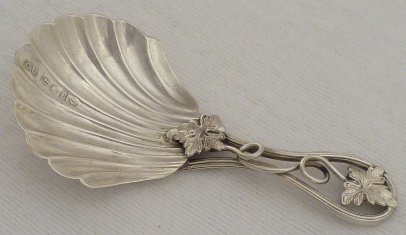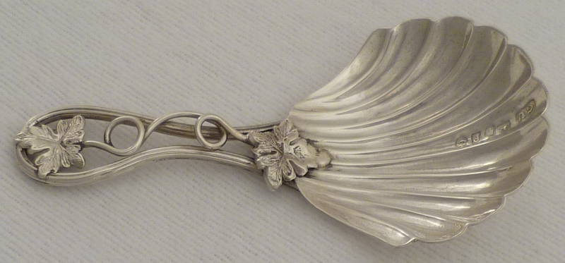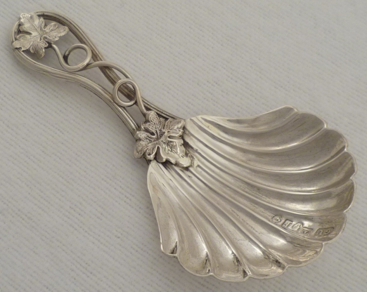 Victorian silver shell bowl caddy spoon with a trailing vine stem. |