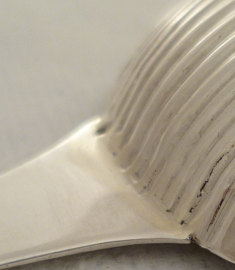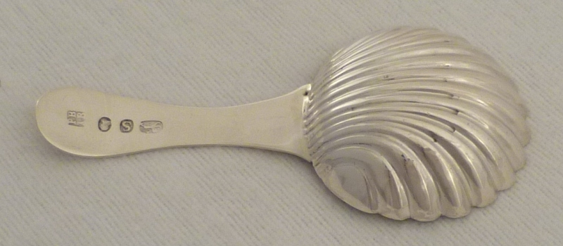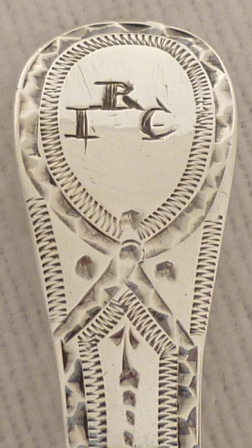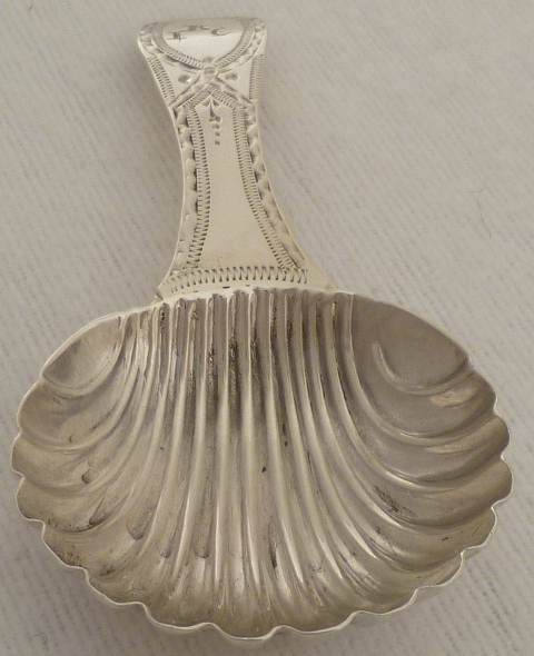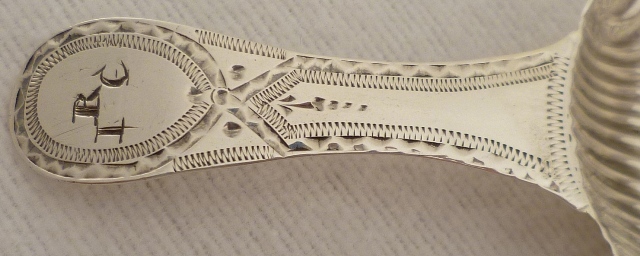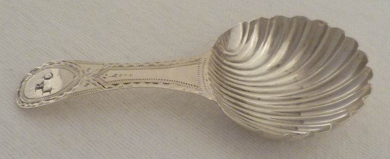 Georgian silver caddy spoon with a fluted circular bowl and bright cut stem with the original initials, very likely commemorating a wedding, engraved within the terminal's cartouche. |