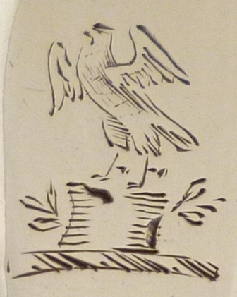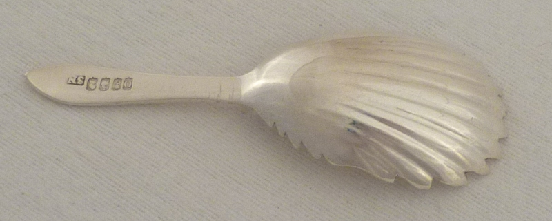 Substantial Irish Georgian silver caddy spoon with a crest engraved Pointed Old English pattern handle and a large, fluted bowl with a serrated edge. |