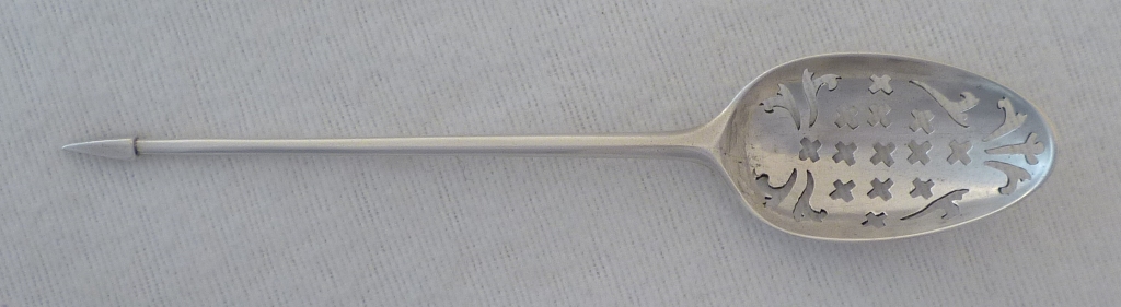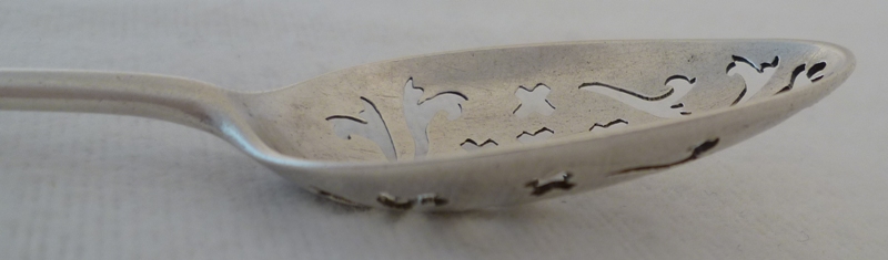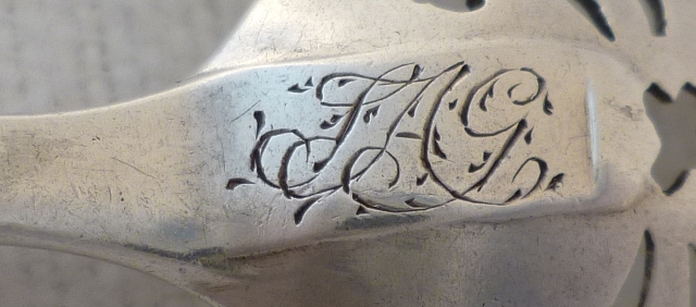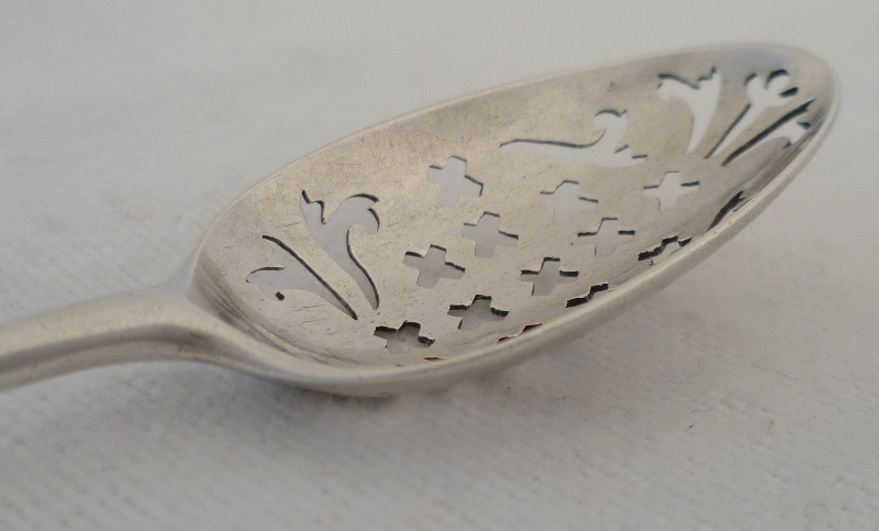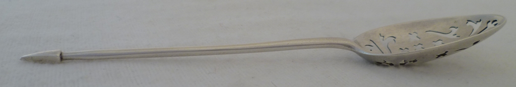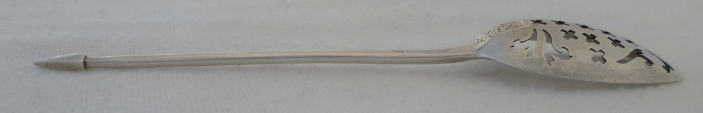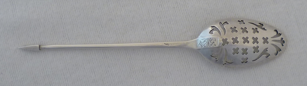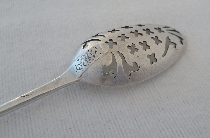DESCRIPTION | Typical Georgian silver mote spoon in exceptionally good condition. Long single drop to the bowl back engraved with the original monogram and a diamond point to the stem that although bumped at the very tip is not rubbed or scarred and is almost exactly as it was made. Stem struck once with the makers' mark only which is usual for mote spoons of this period. |