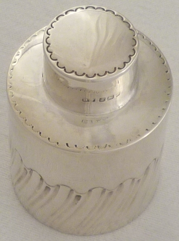 DESCRIPTION | Good quality Victorian silver circular tea caddy with part spiral fluted decoration, engraved borders and a pull off lid that doubles as a measure. |