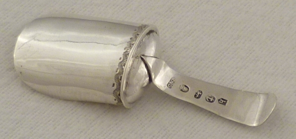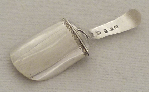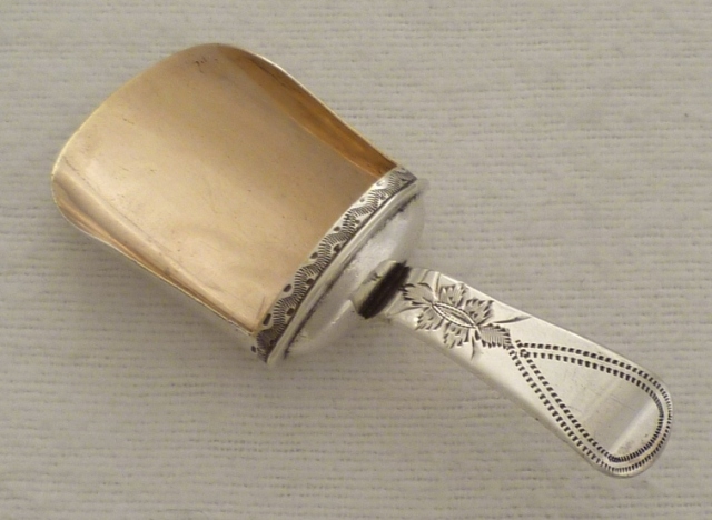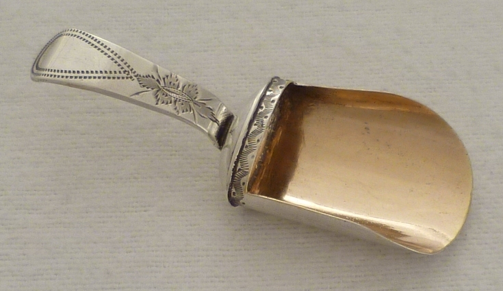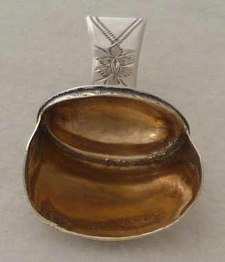 DESCRIPTION | Superb little Georgian silver bright cut Old English pattern caddy shovel with a blank cartouche that has not been erased and a gilded bowl interior. |