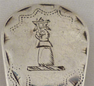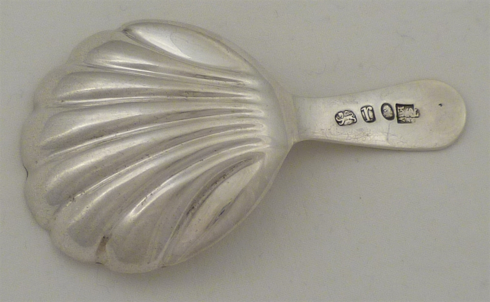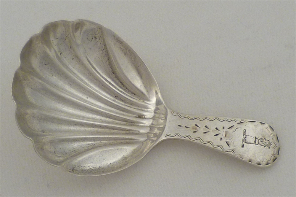DESCRIPTION | Very good Georgian solid silver caddy spoon with a shell bowl and frontal bright cut engraving and crest. |