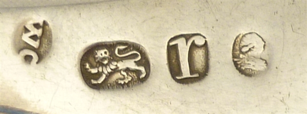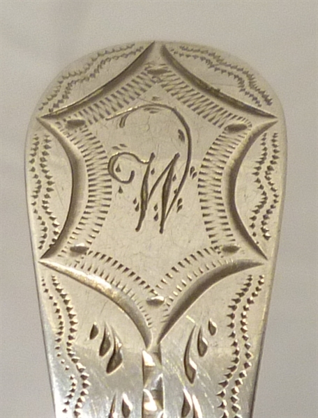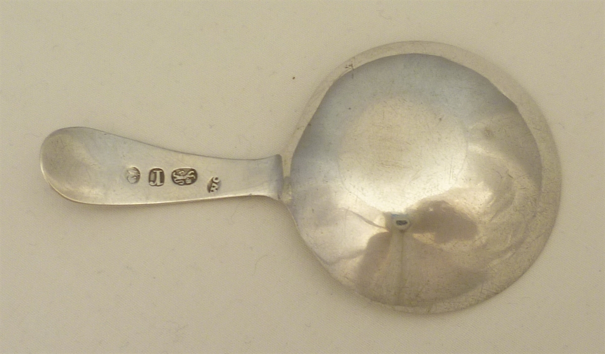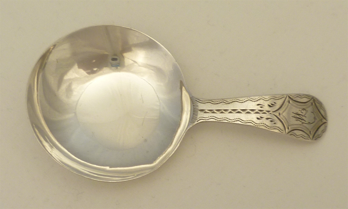 DESCRIPTION | Georgian solid sterling silver bright cut Old English pattern tea caddy spoon with a round bowl, initial engraved cartouche, and good hallmarks. |