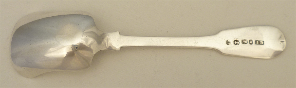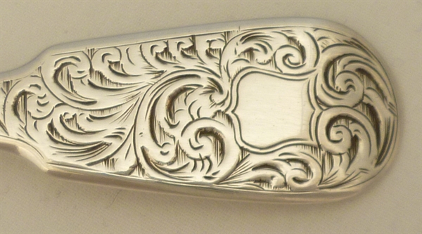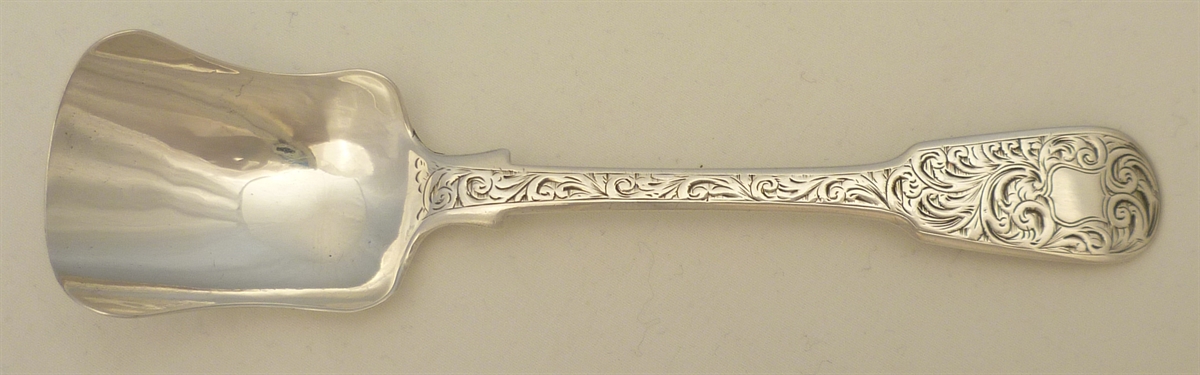 DESCRIPTION | Good Victorian solid sterling silver Fiddle pattern sugar shovel with engraved decoration and a blank cartouche. |