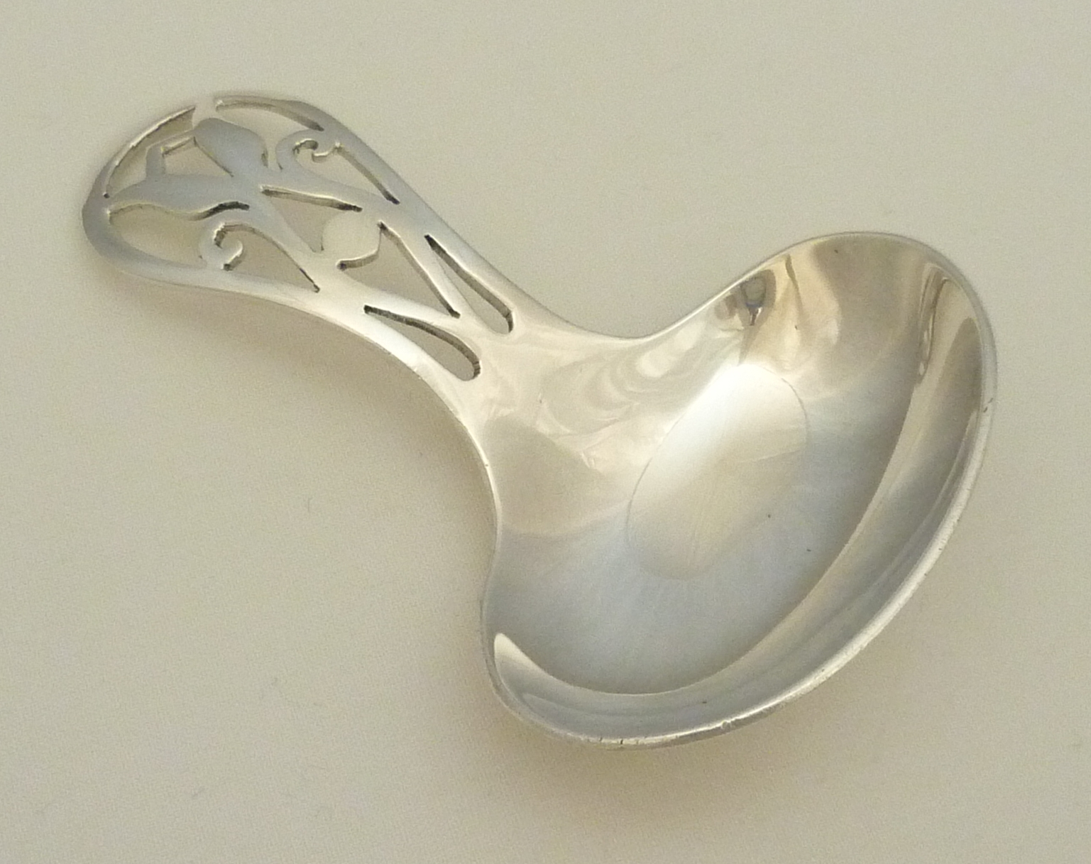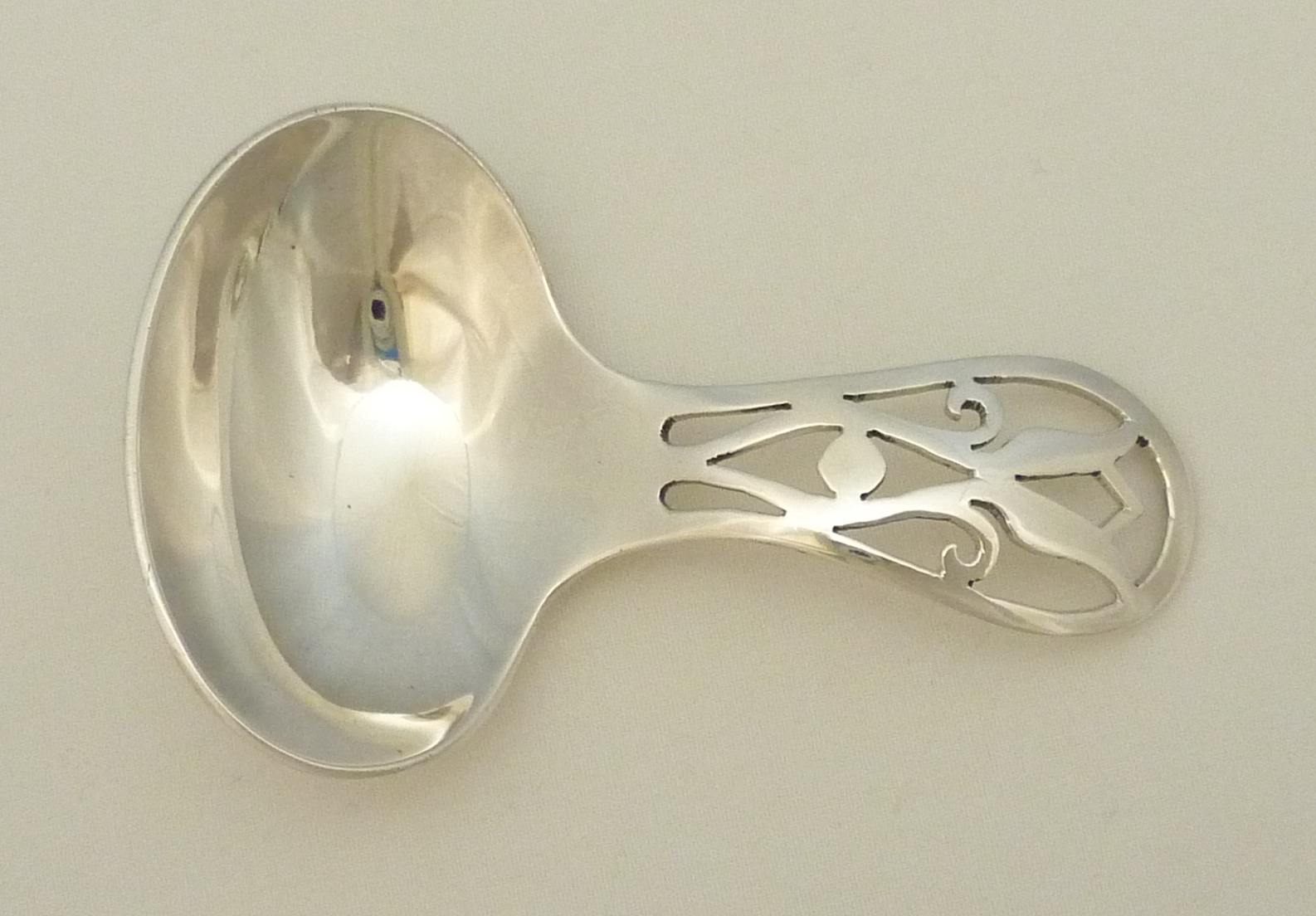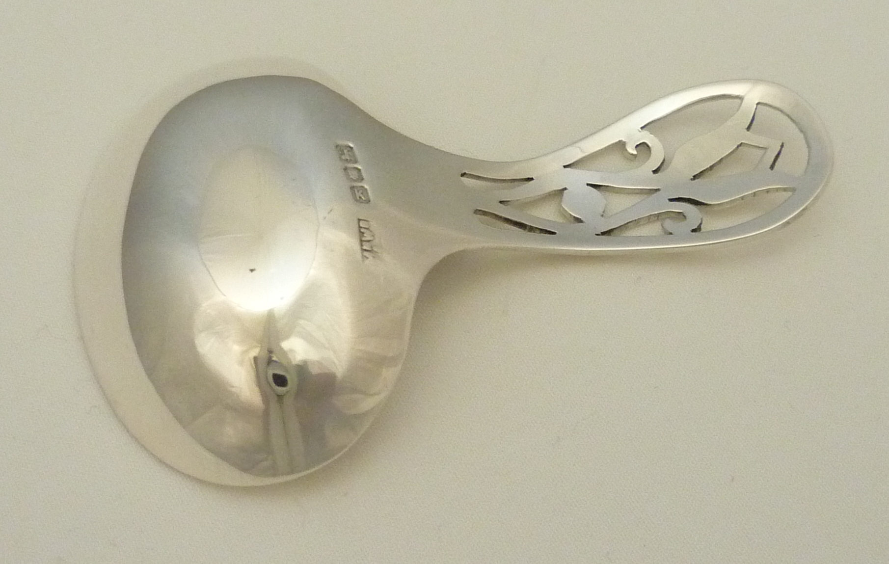 DESCRIPTION | English solid sterling silver caddy spoon with a hand pierced stem and made from surprisingly thick metal. |