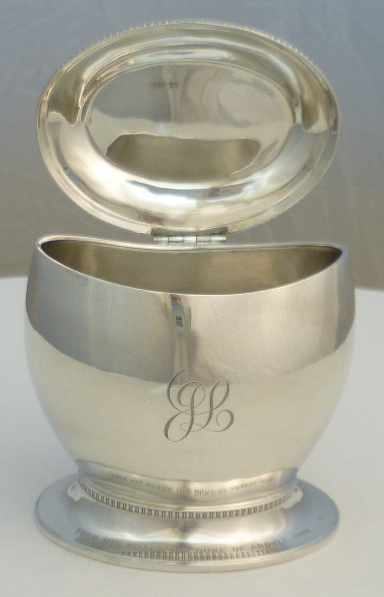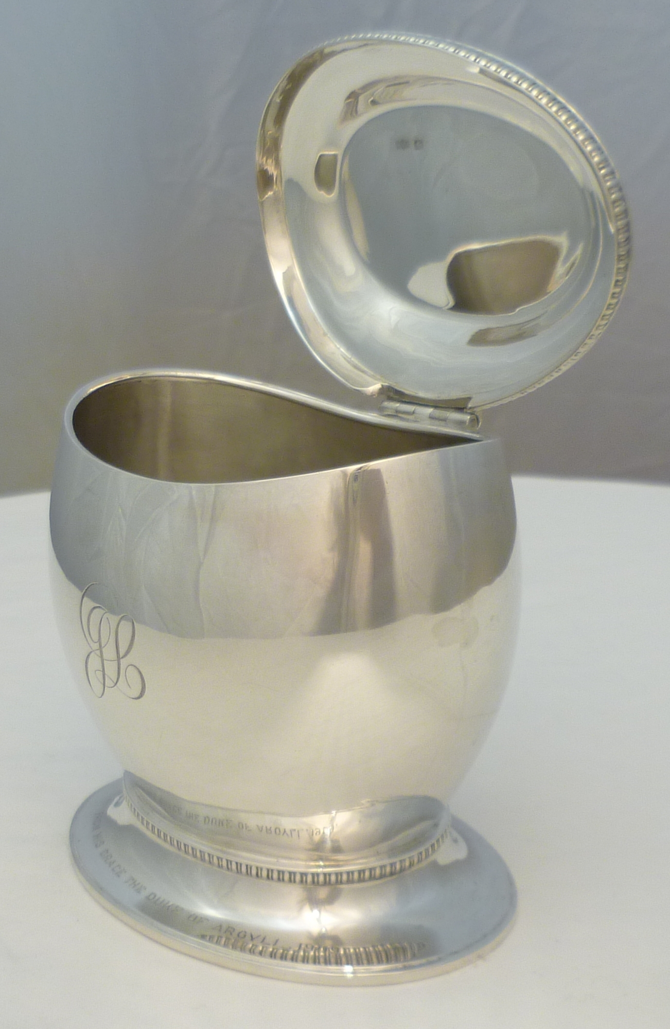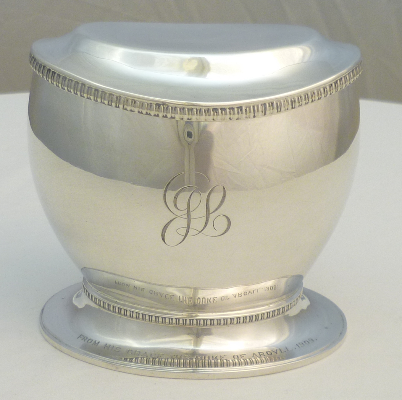 DESCRIPTION | High quality Edwardian solid sterling silver tea caddy with a hinged lid, gadroon decoration, frontal monogram engraving and a ducal presentation engraving to the foot rim. A quick google reveals this Duke as something of a dullard but his slutty wife sounded a riot. |