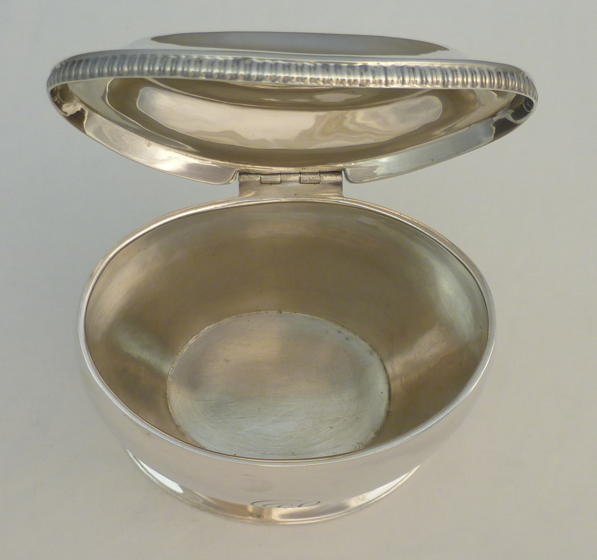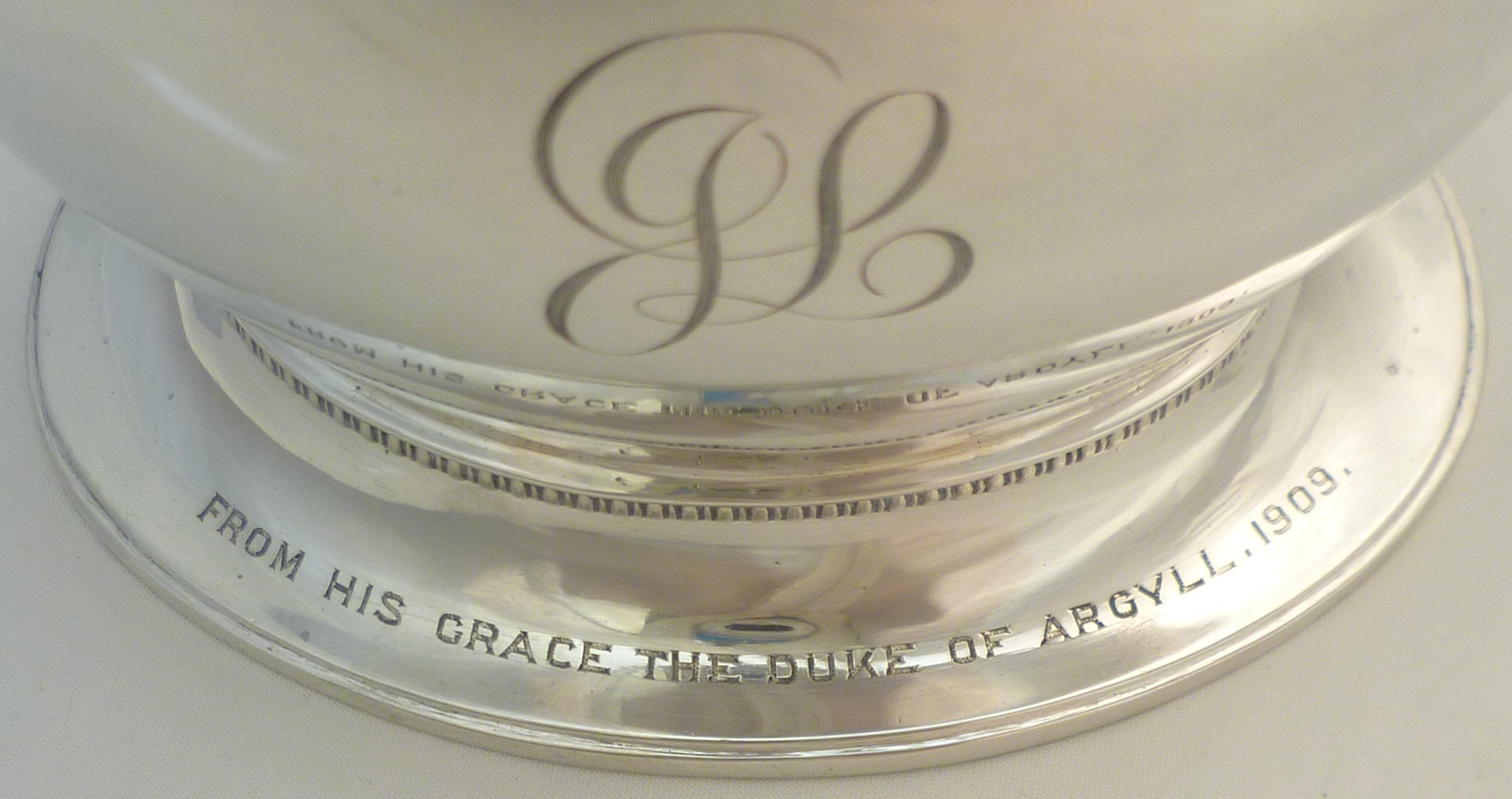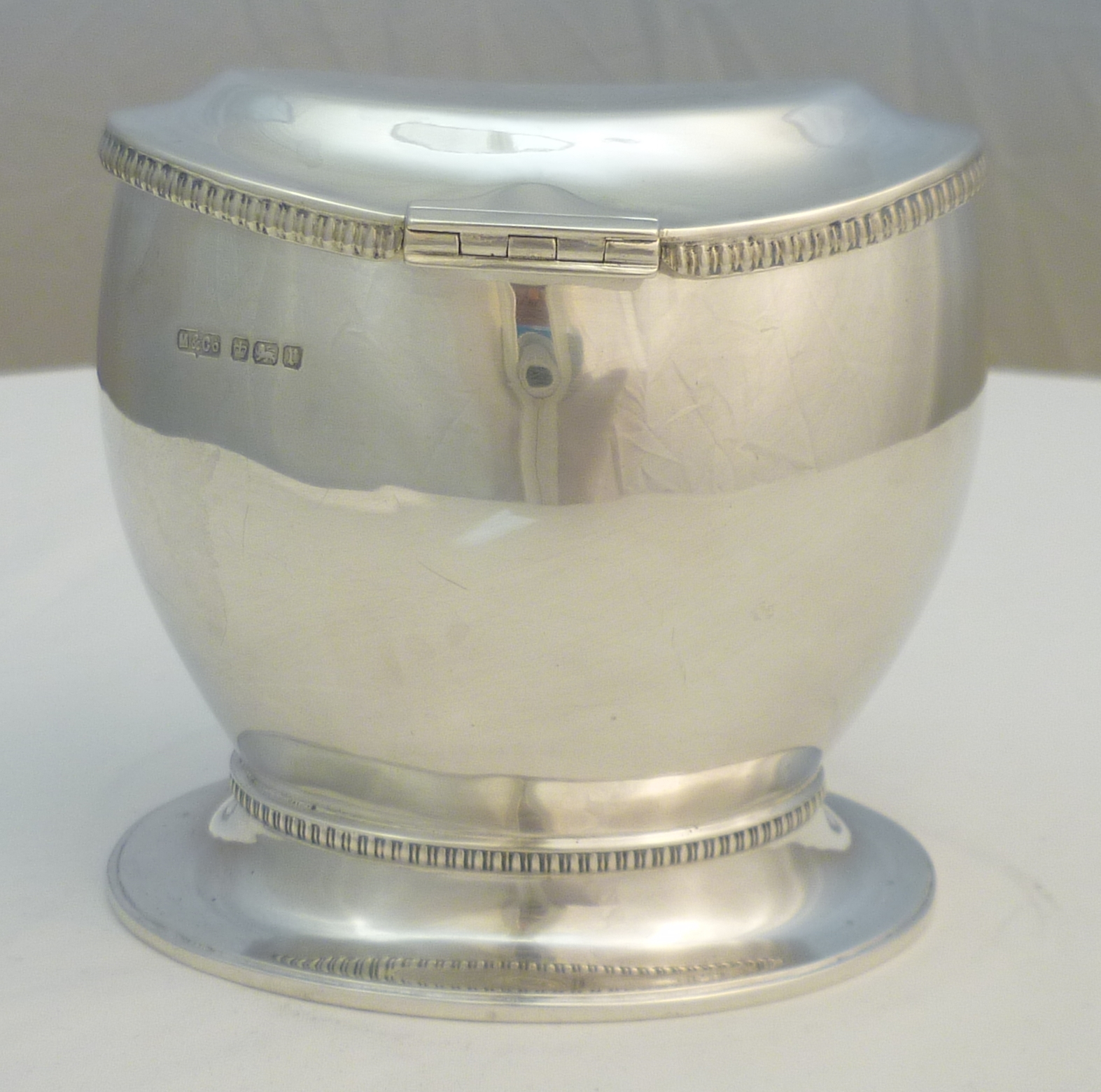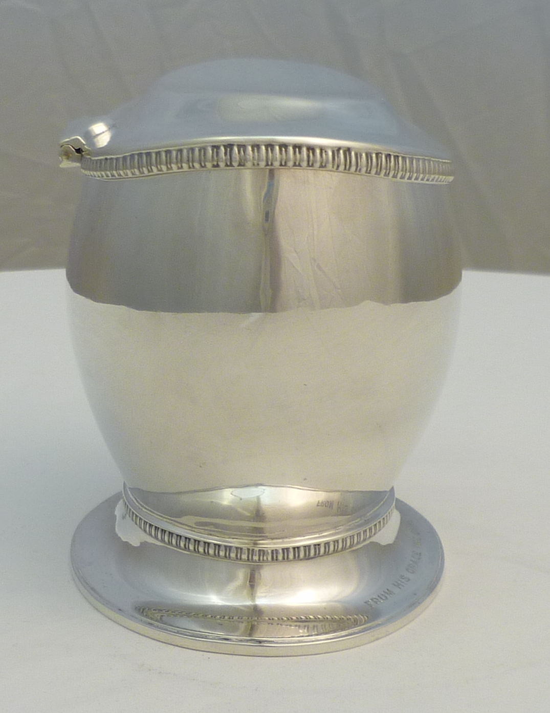 DESCRIPTION | High quality Edwardian solid sterling silver tea caddy with a hinged lid, gadroon decoration, frontal monogram engraving and a ducal presentation engraving to the foot rim. A quick google reveals this Duke as something of a dullard but his slutty wife sounded a riot. |
