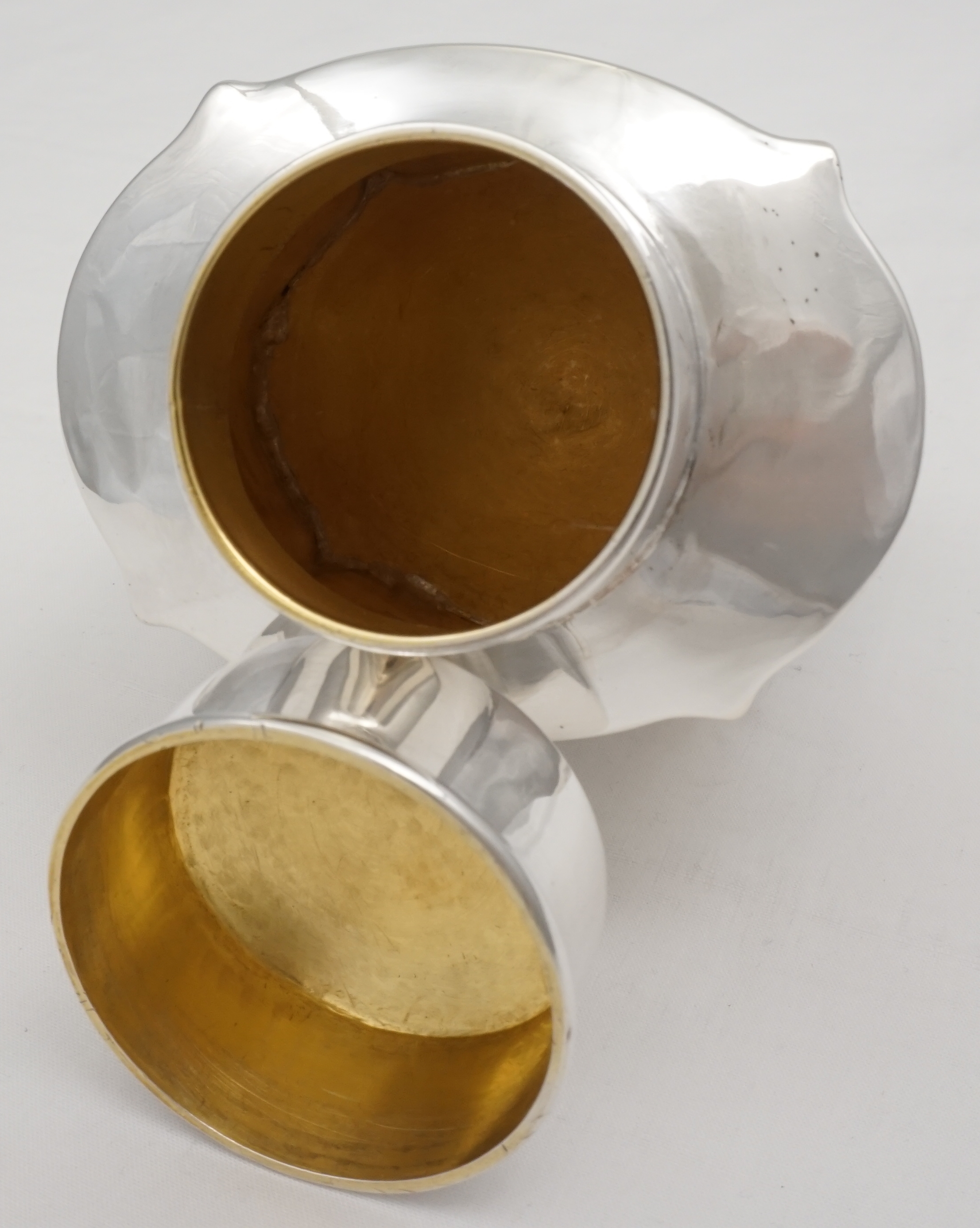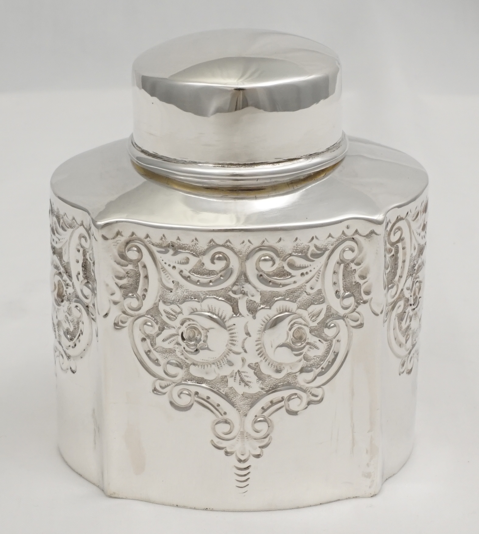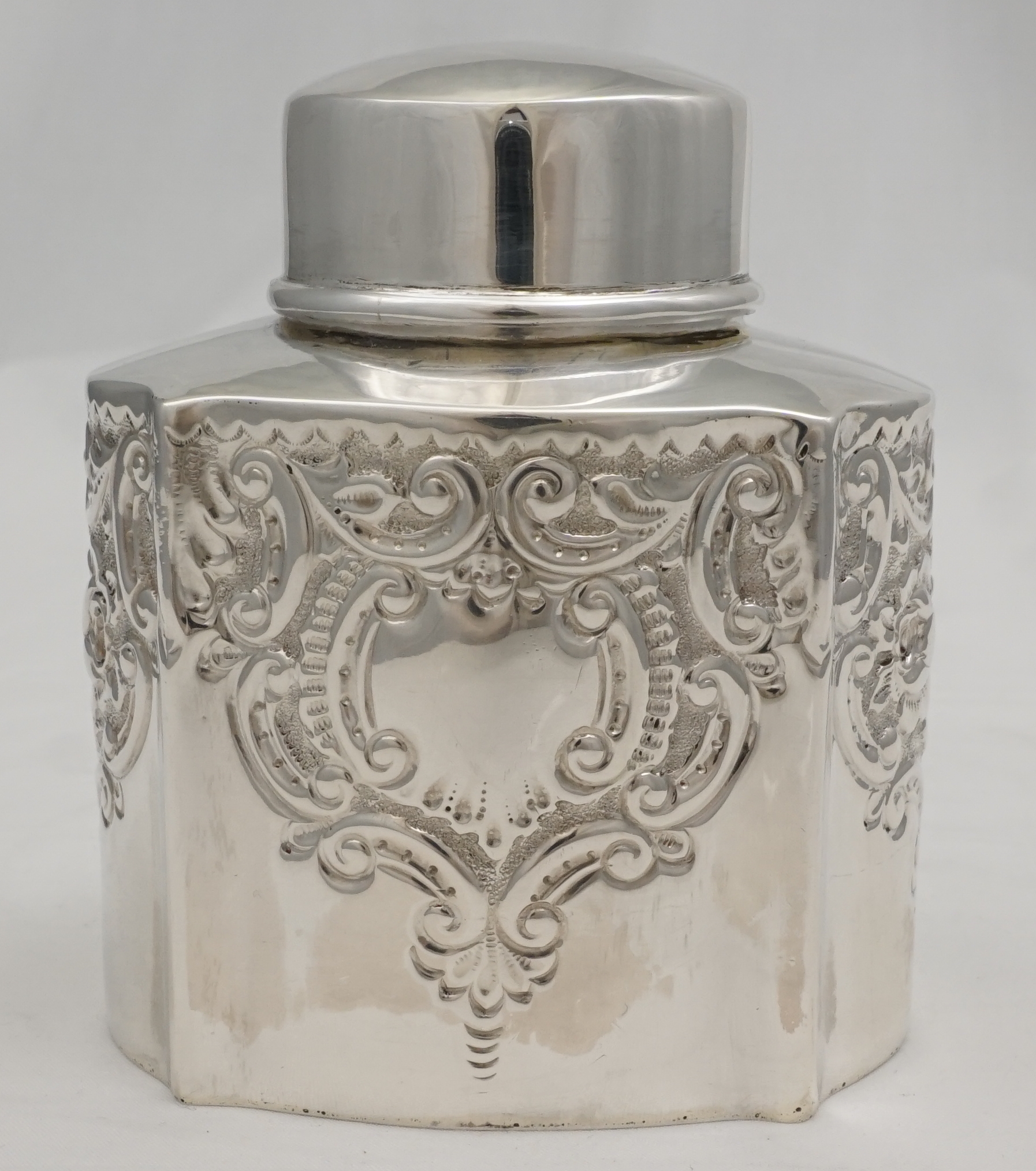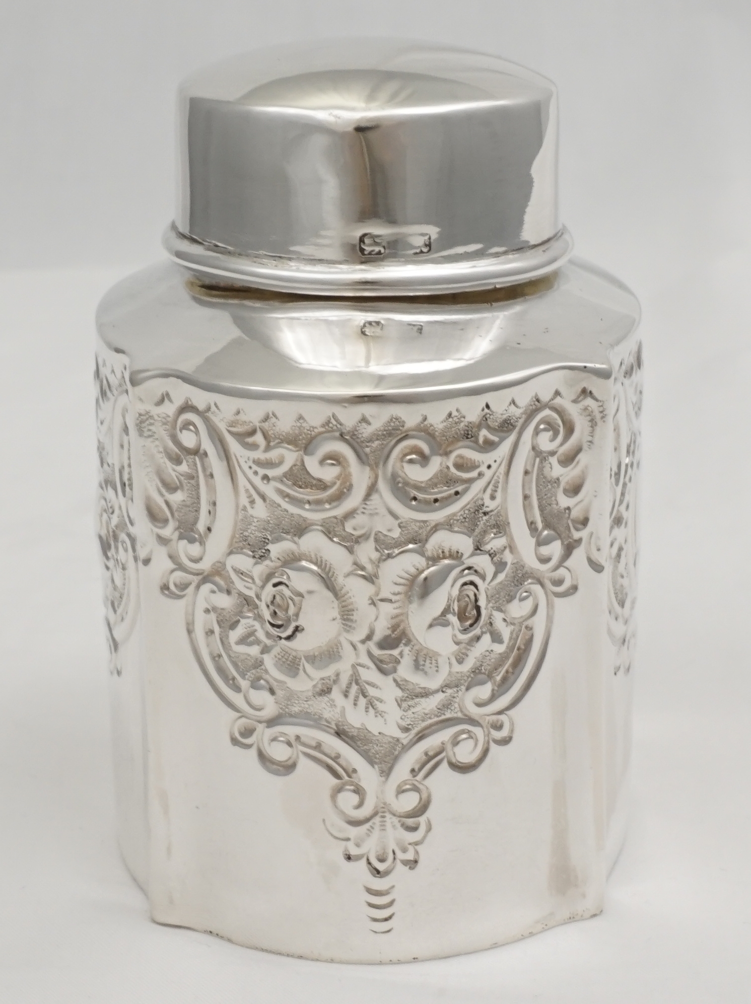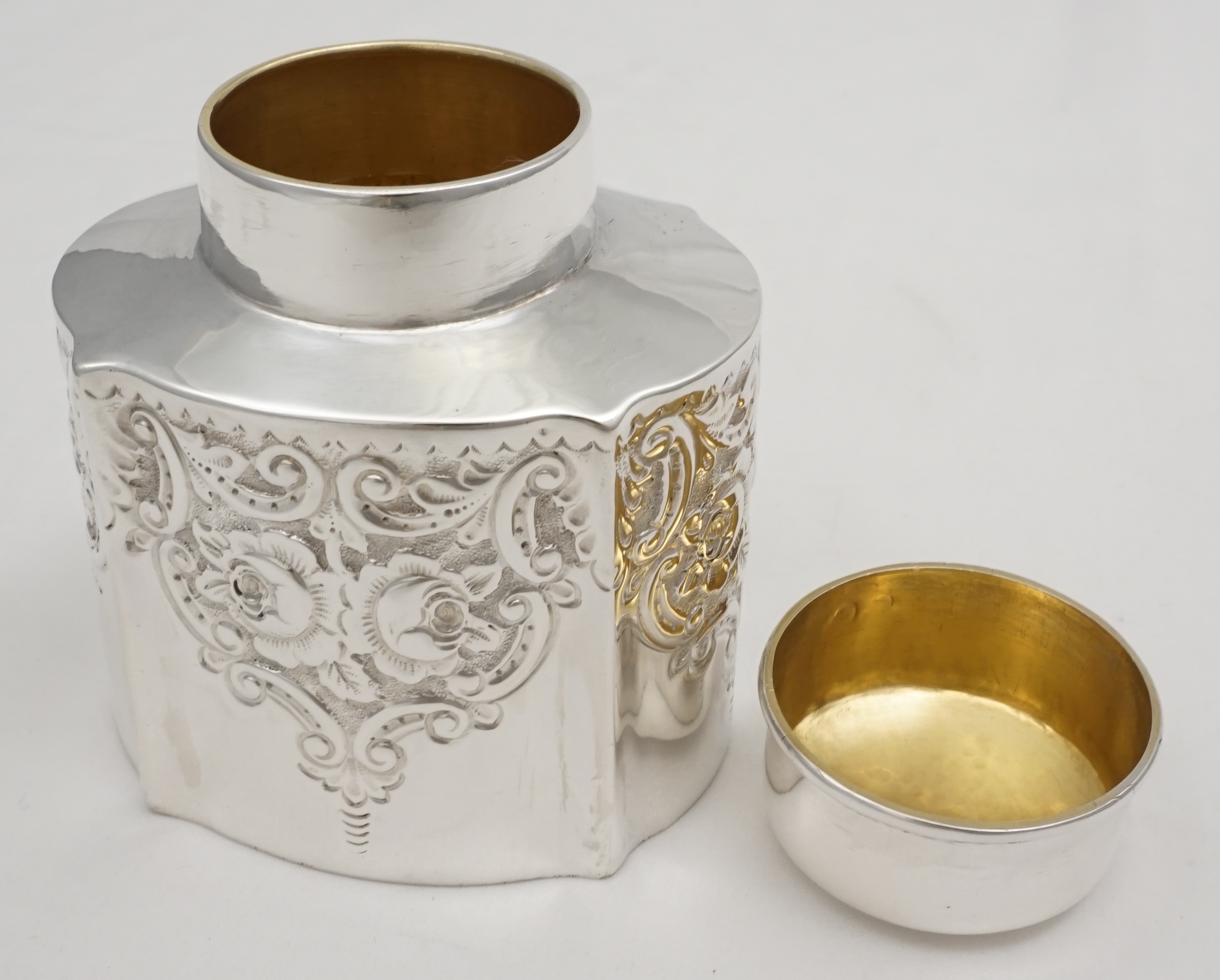 DESCRIPTION | Very pretty, diminutive, high quality antique English Victorian solid sterling silver tea caddy with a sumptuously gilded interior, embossed and engraved rococo decoration including a blank shield form cartouche and a pull off cap that doubles as a measure. Correctly hallmarked with full set to base and partial to cap. |