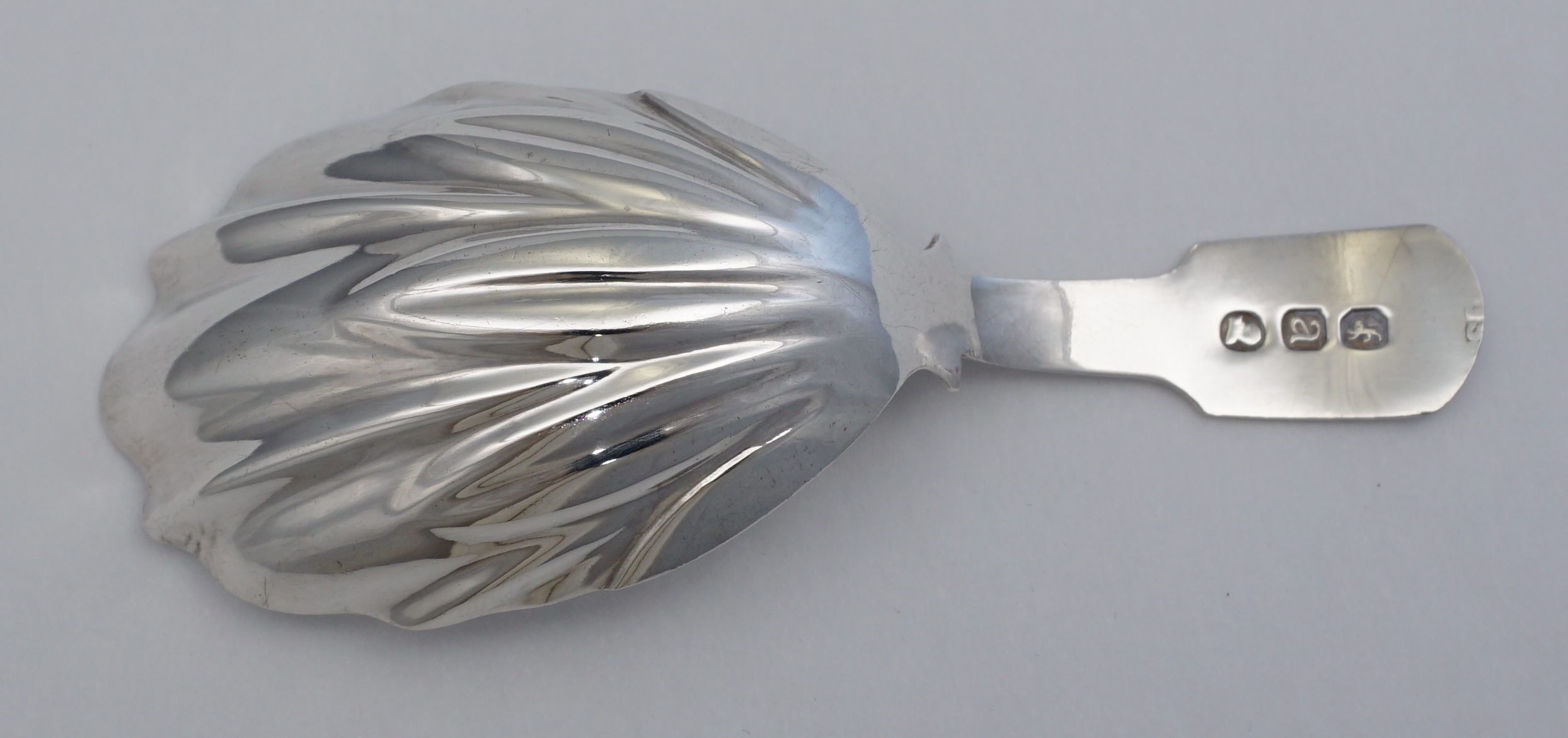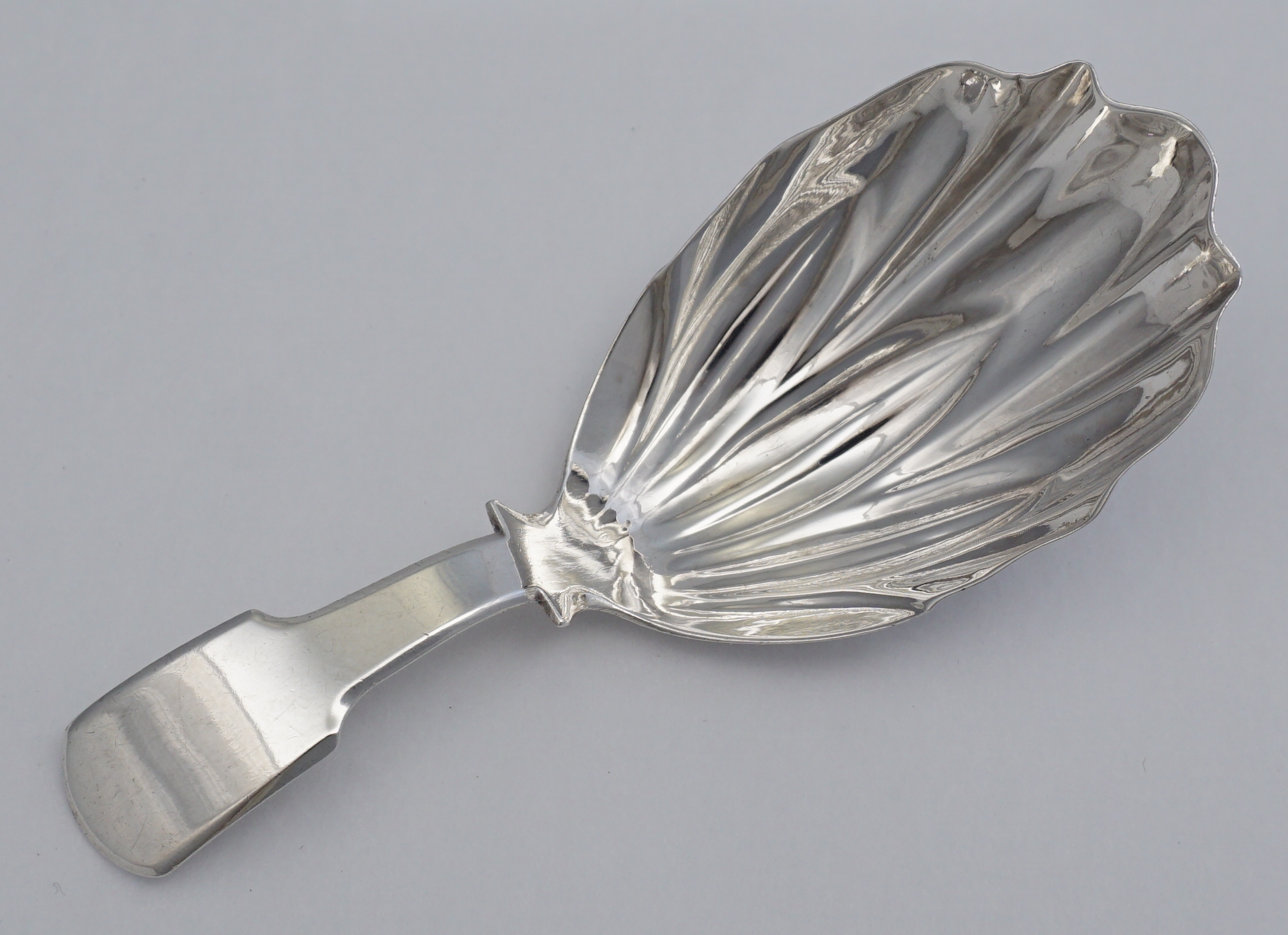 DESCRIPTION | Antique English Georgian solid sterling silver Fiddle pattern tea caddy spoon with no engraving or erasure. |