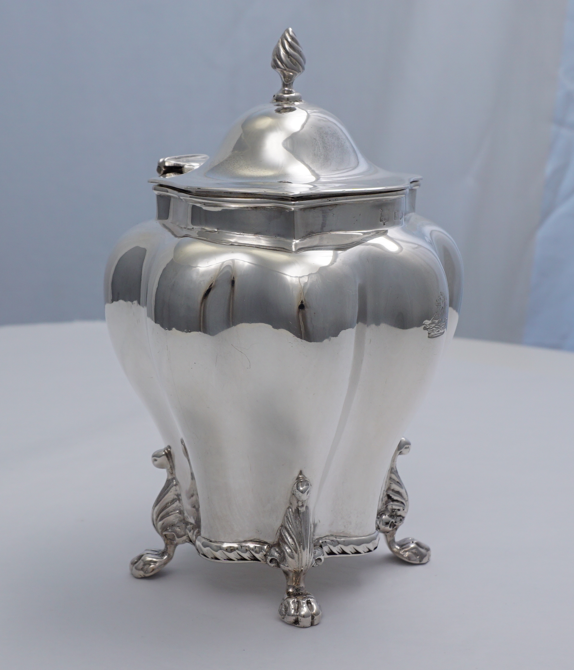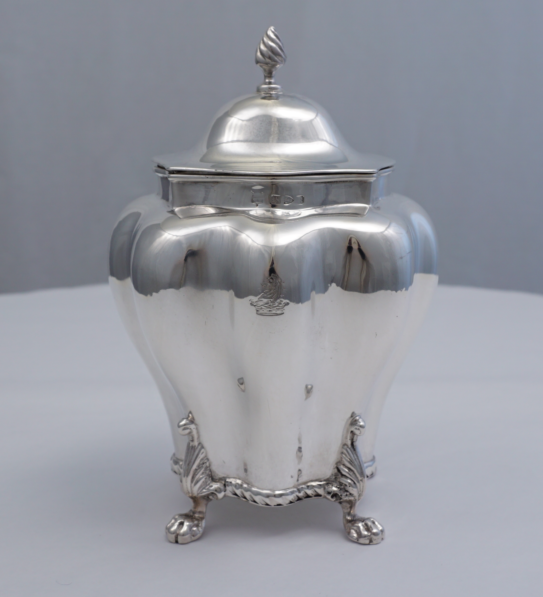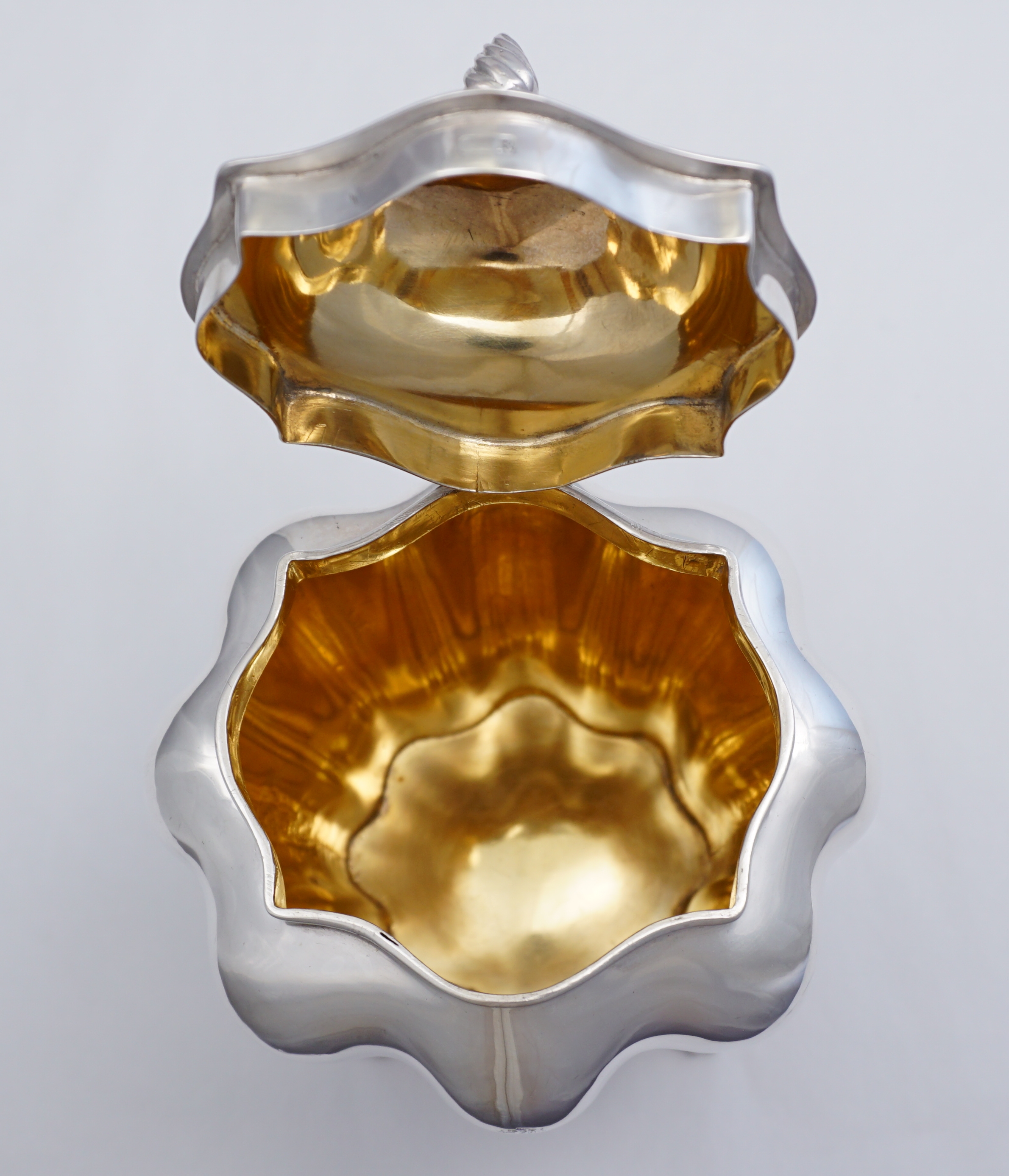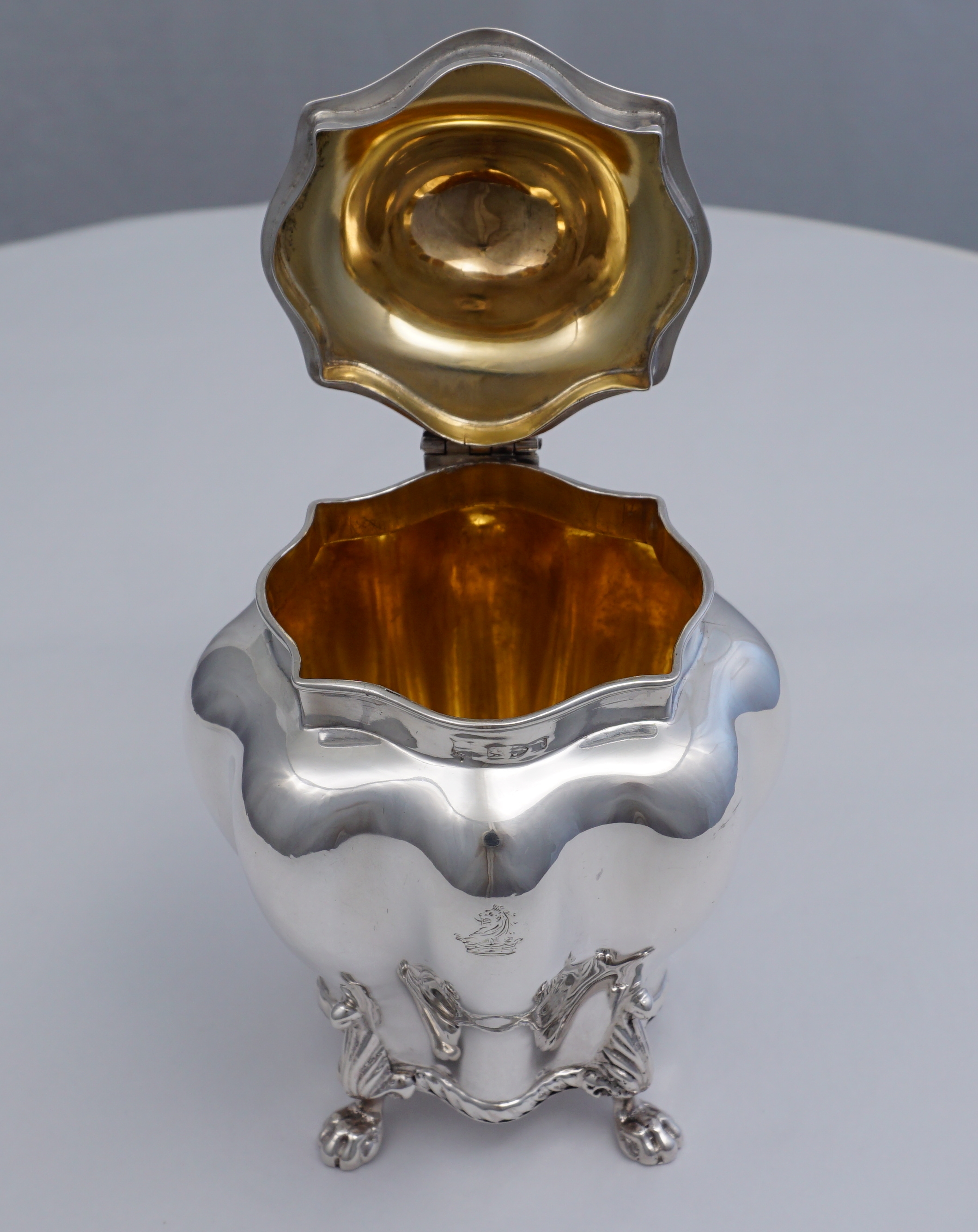 DESCRIPTION | Beautiful antique English Victorian solid sterling silver bombe form tea caddy with a discreet frontal crest engraving and a fully gilded interior. |
