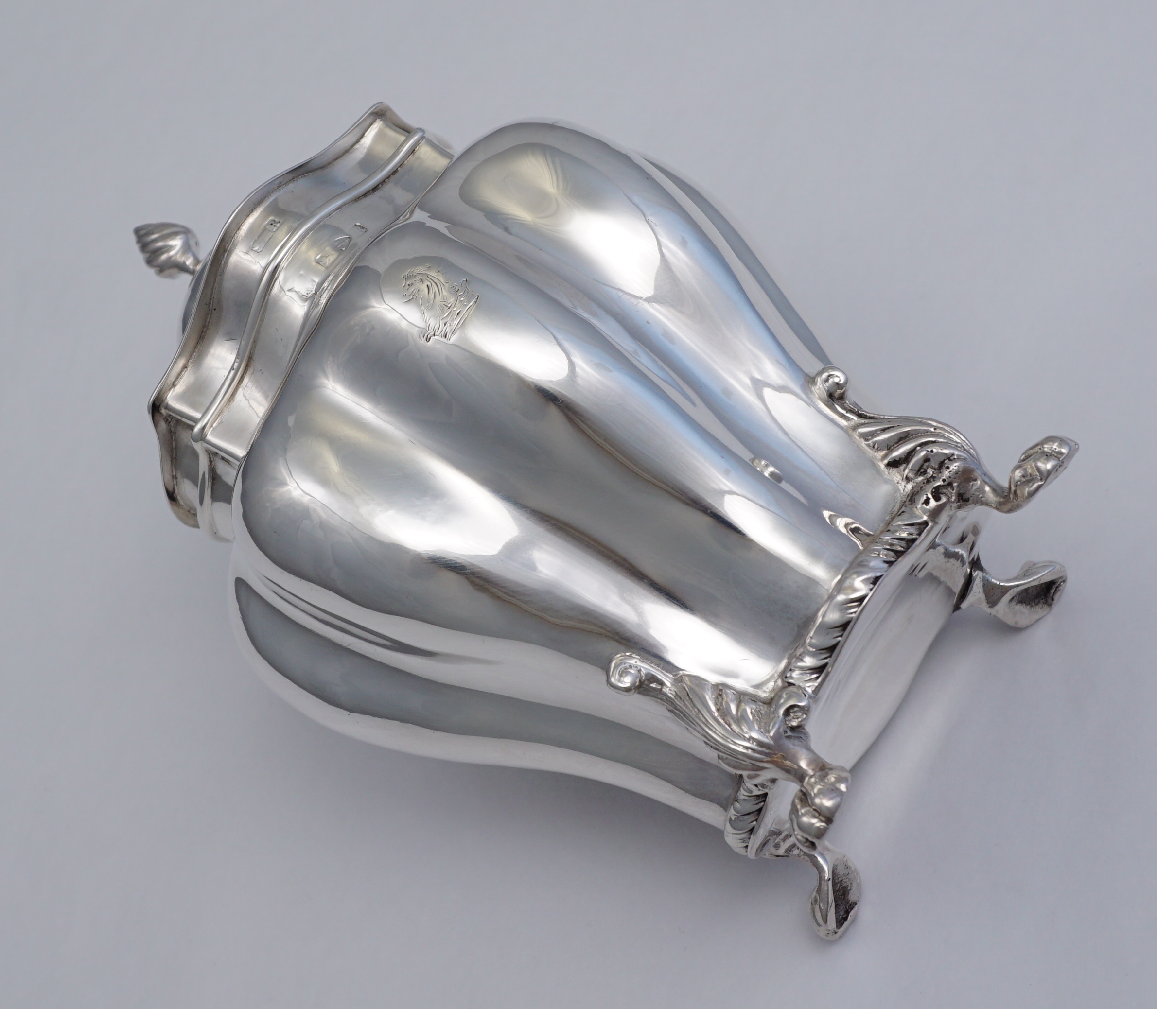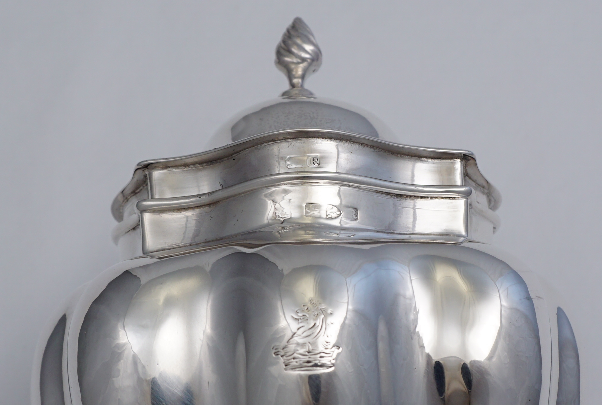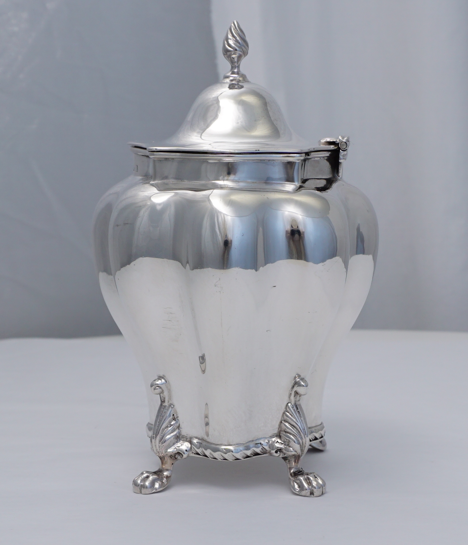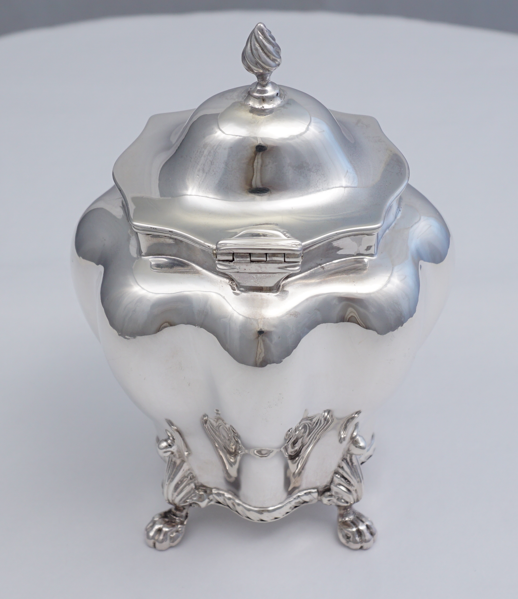 DESCRIPTION | Beautiful antique English Victorian solid sterling silver bombe form tea caddy with a discreet frontal crest engraving and a fully gilded interior. |