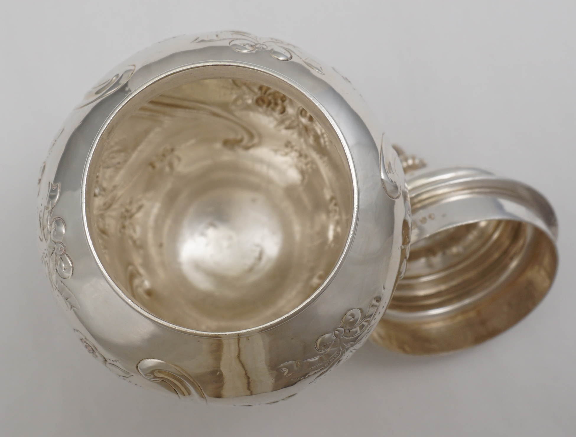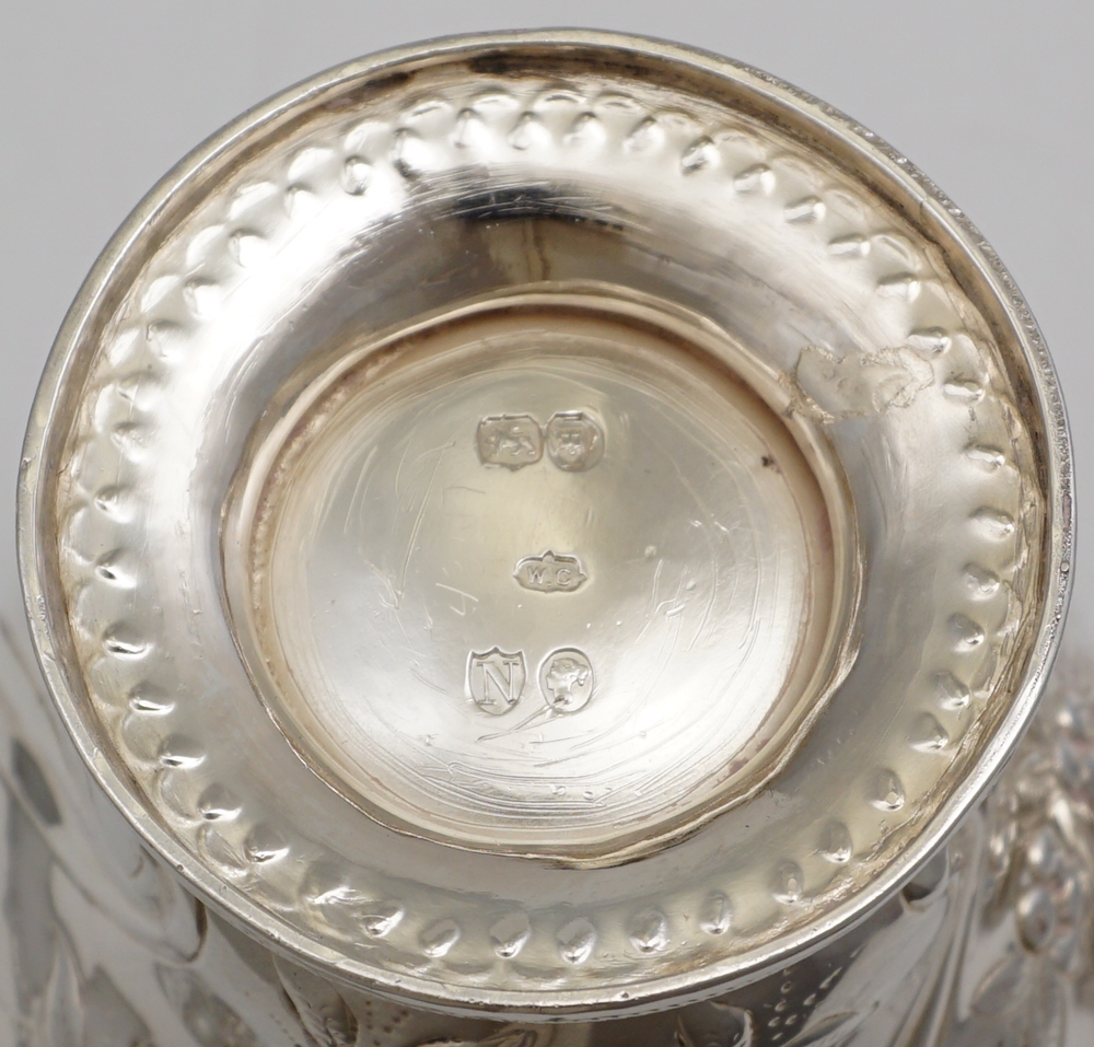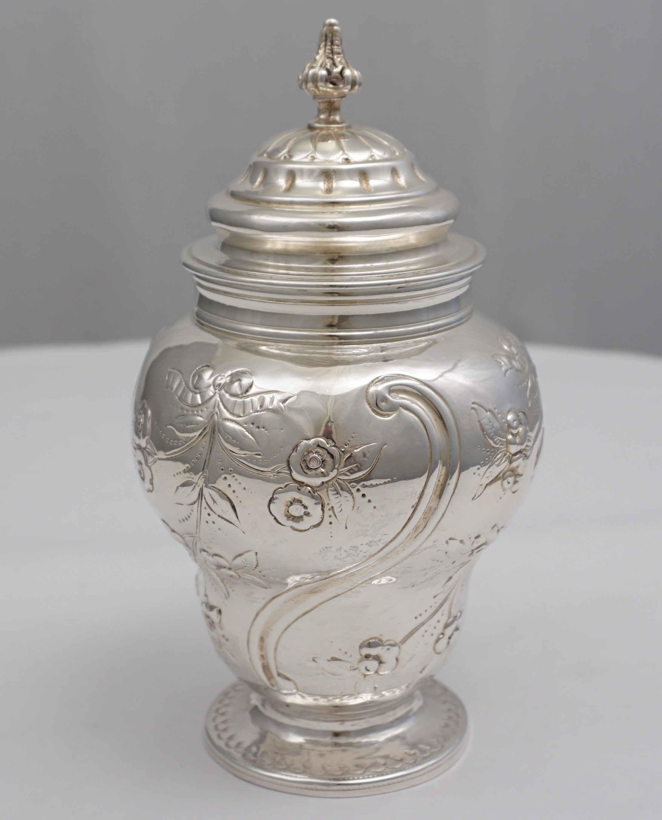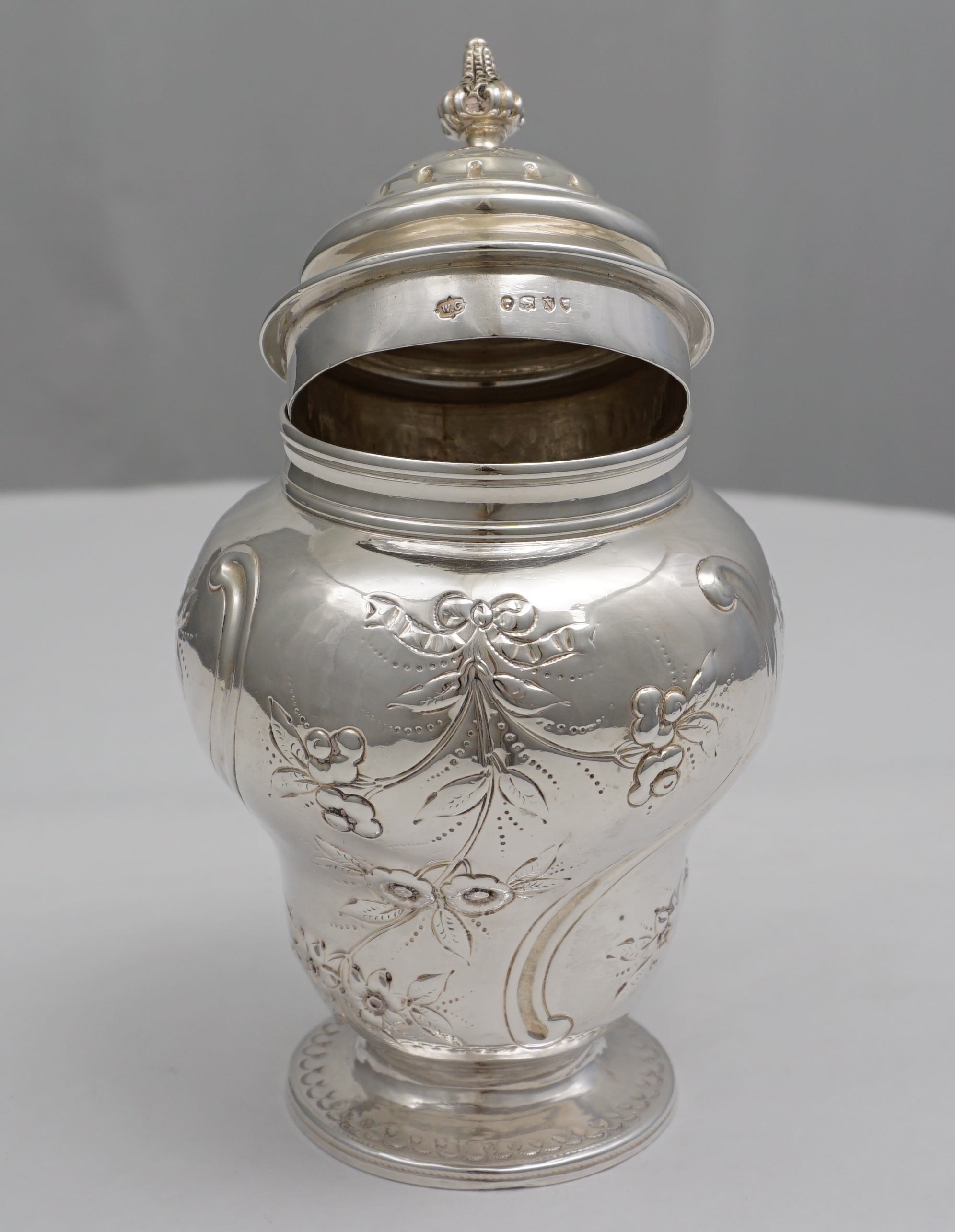 DESCRIPTION | Good quality antique English Victorian solid sterling silver inverted pear form tea caddy with embossed and engraved decoration and well fitting pull off top with unusual cast finial. |