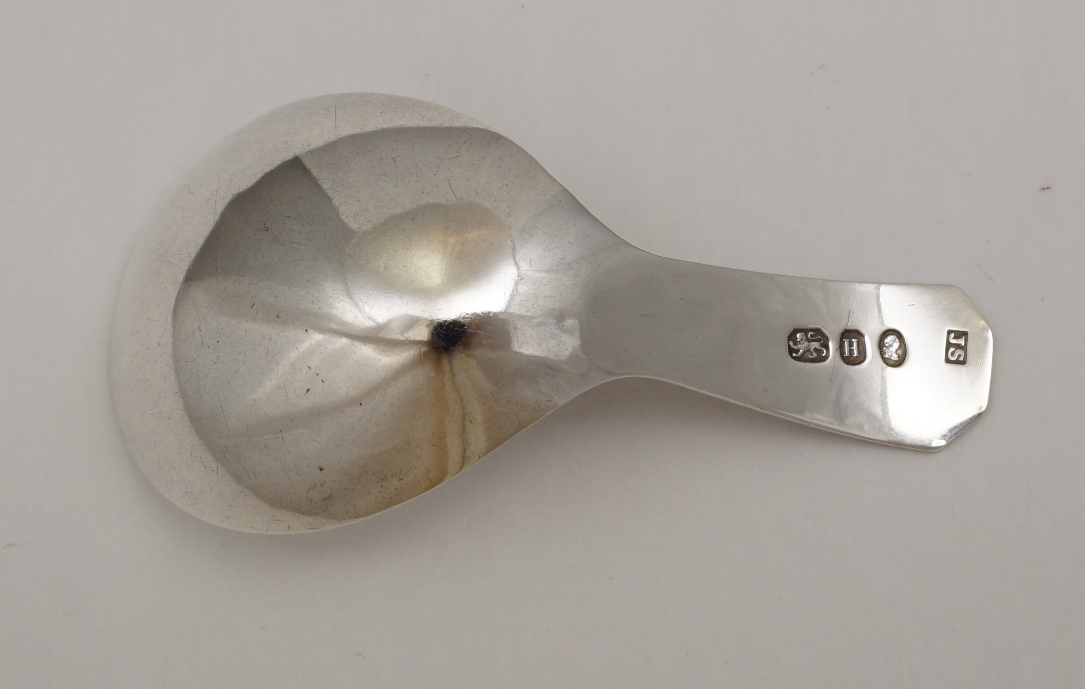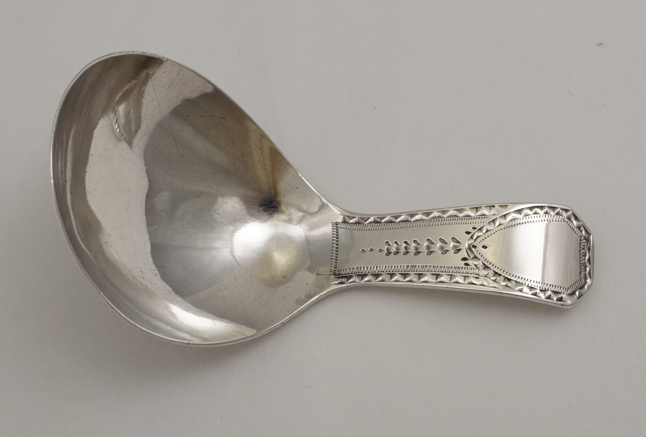 DESCRIPTION | Superb antique English Georgian solid sterling silver Old English Bright-cut edge caddy spoon with a pear form bowl, upright handle with a coffin form terminal and a blank cartouche. |