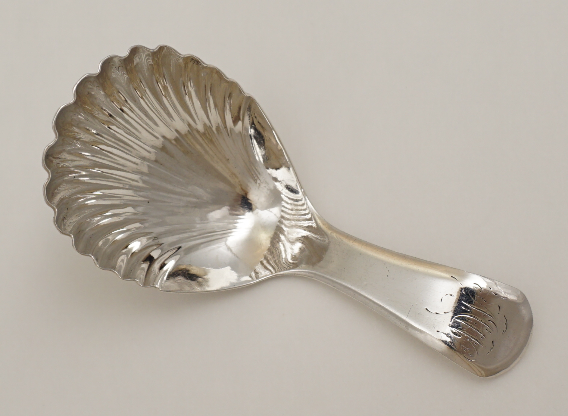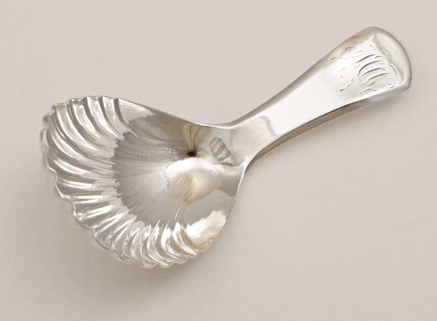 DESCRIPTION | Antique English Georgian solid sterling silver Old English pattern tea caddy spoon with a shell bowl and engraved monogram 'MW'. |