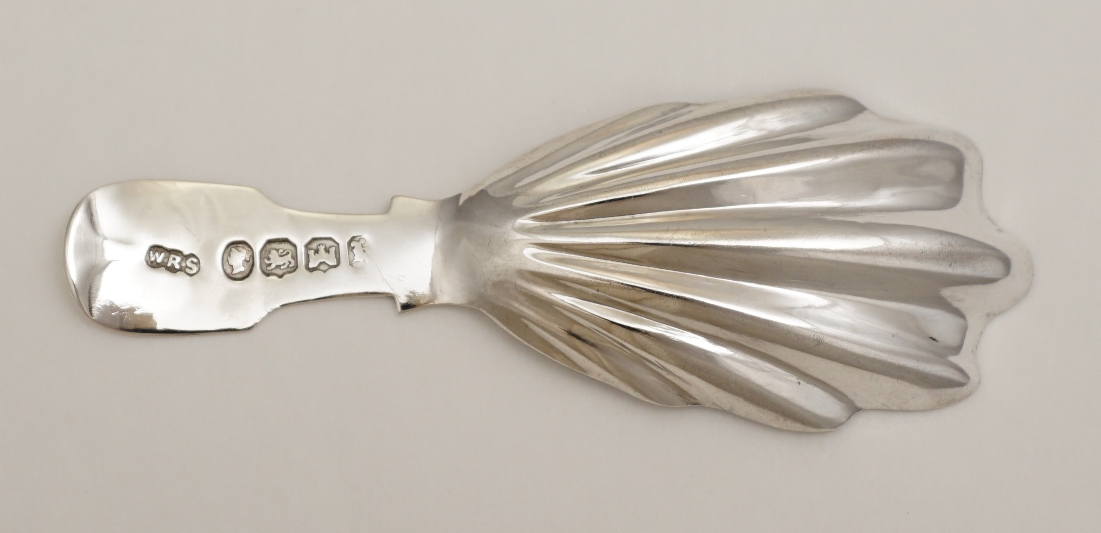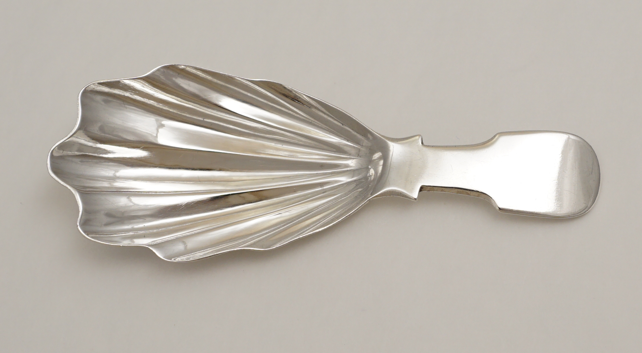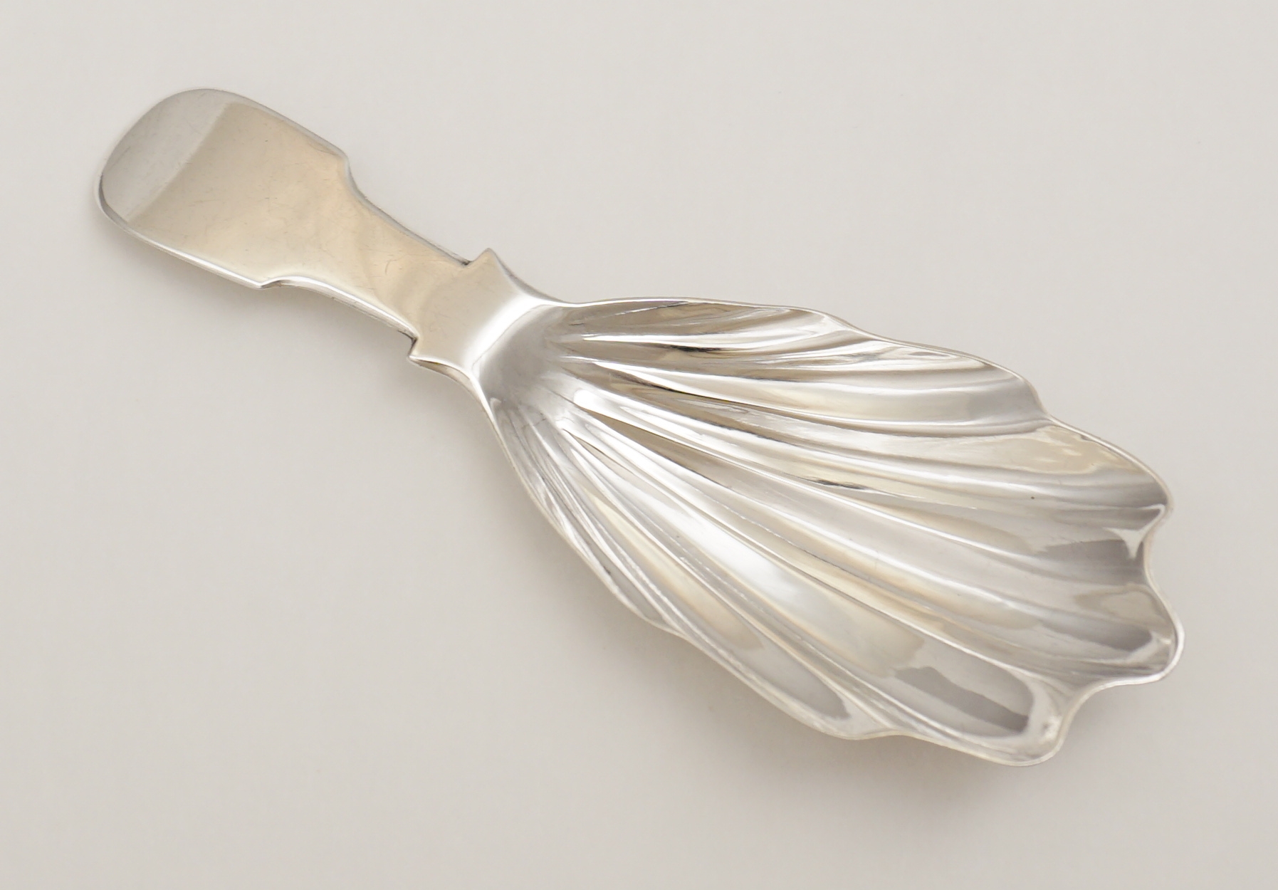 DESCRIPTION | Antique English early Victorian solid sterling silver Fiddle pattern tea caddy spoon with a shell bowl and no engraving or erasure. |