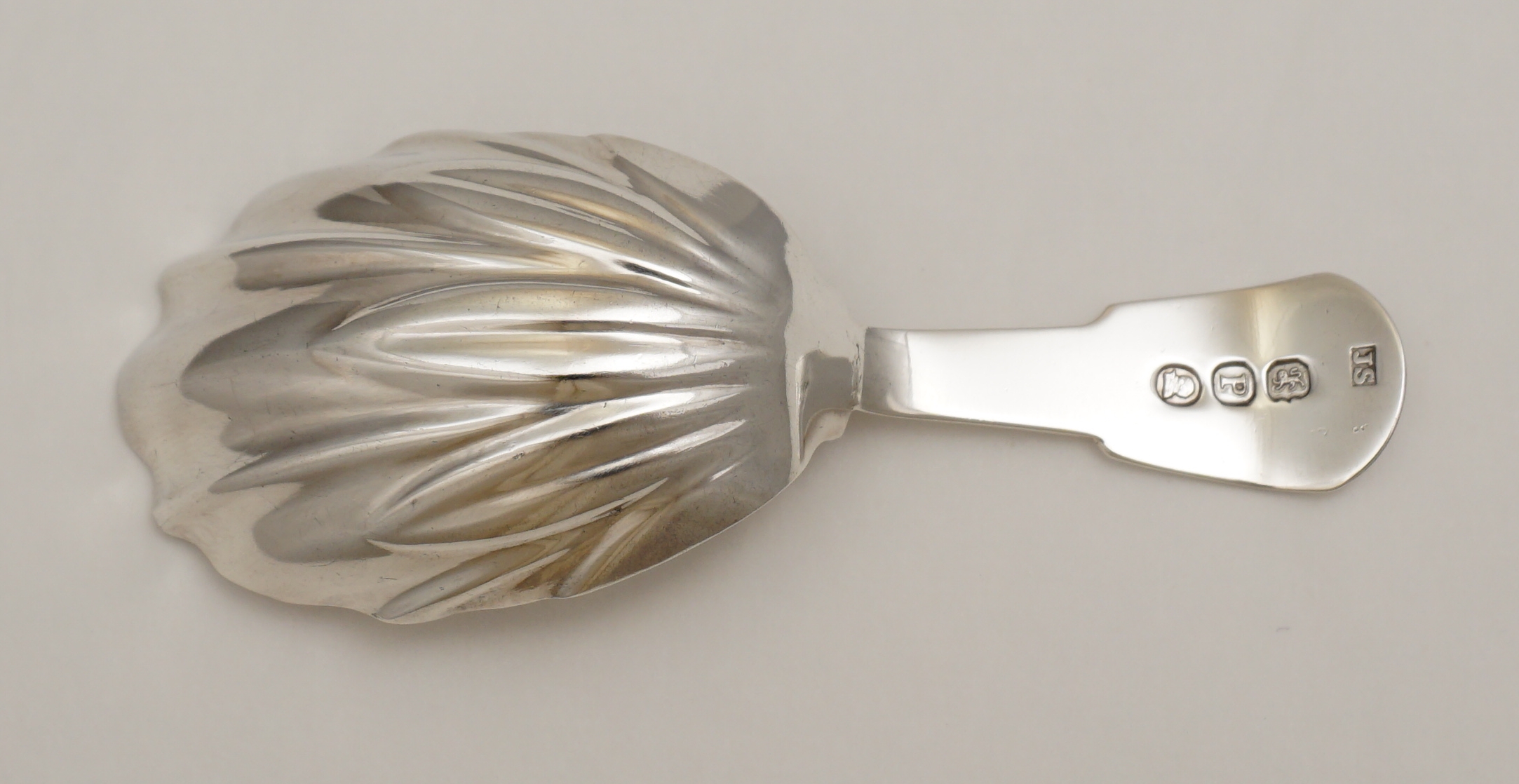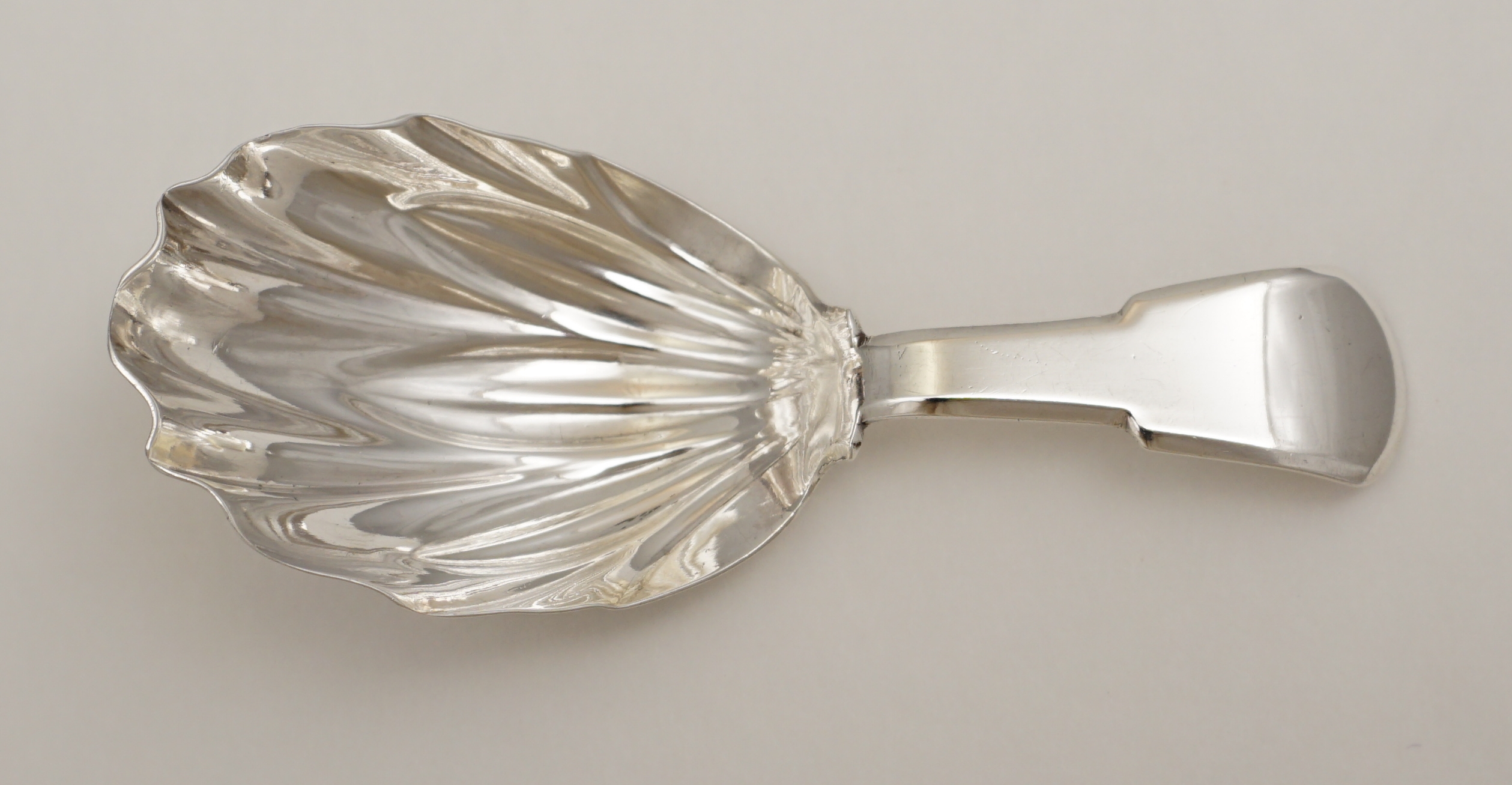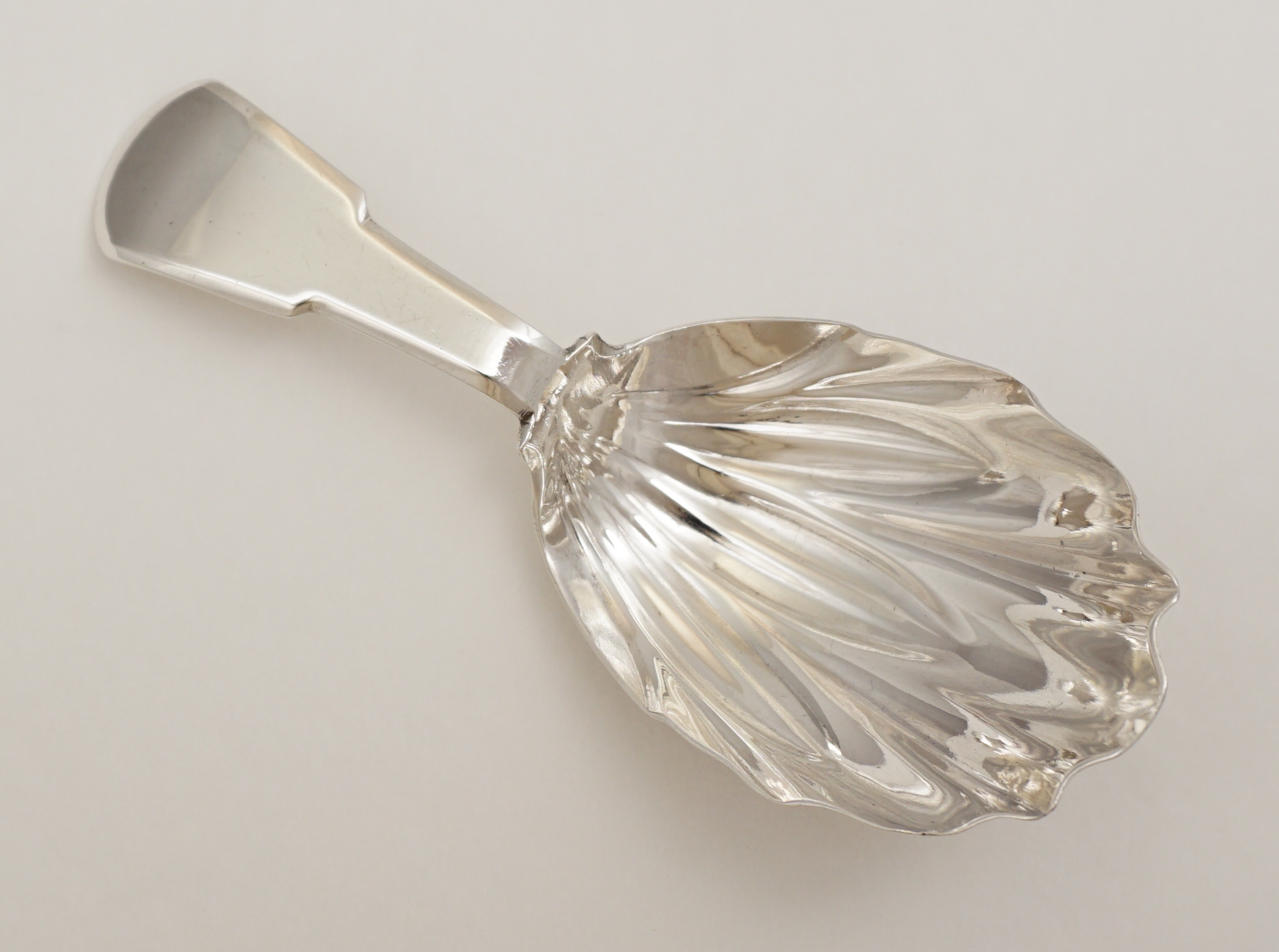 DESCRIPTION | Antique English Georgian solid sterling silver Fiddle pattern tea caddy spoon with a shell bowl and no engraving. |