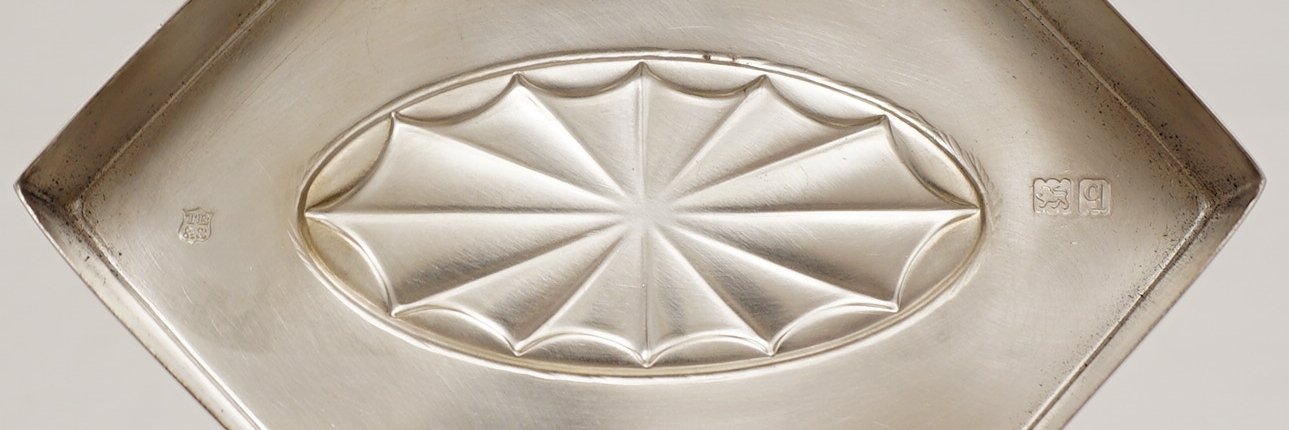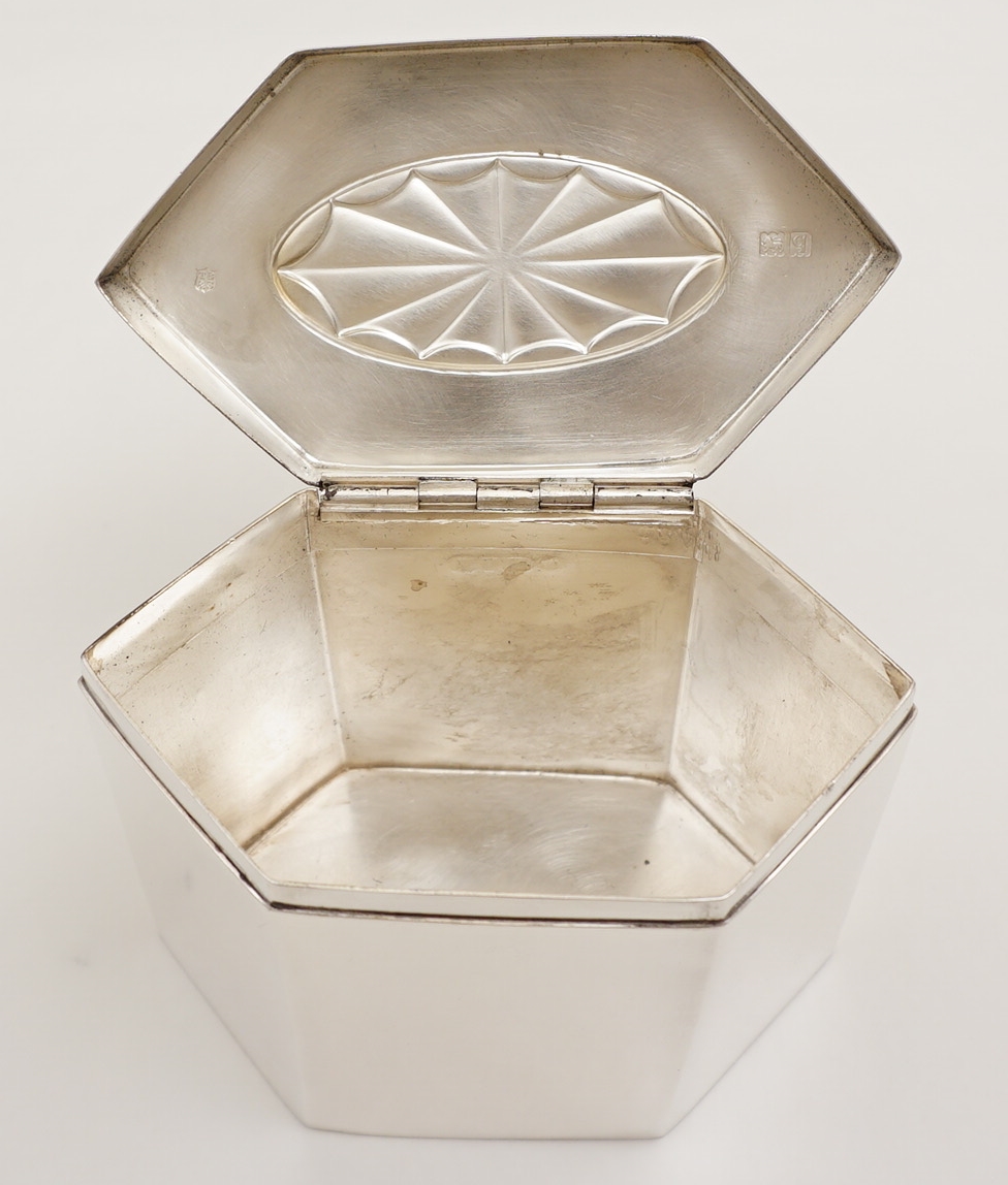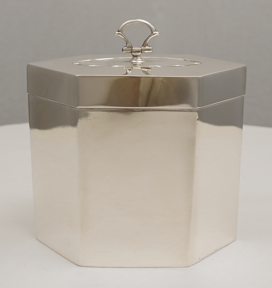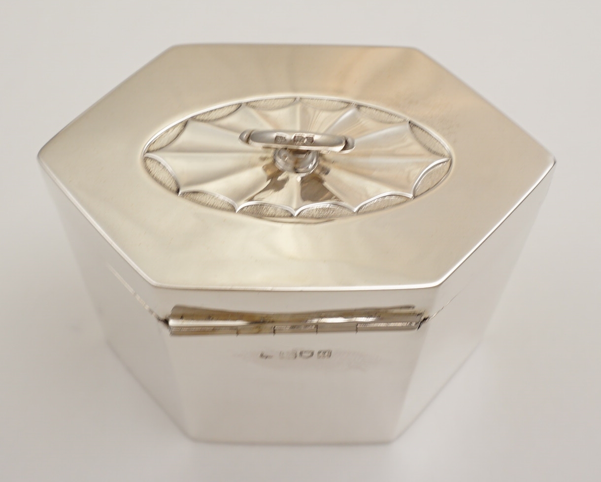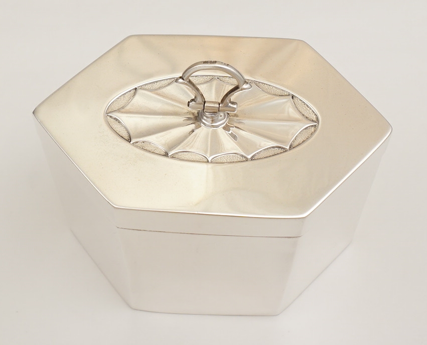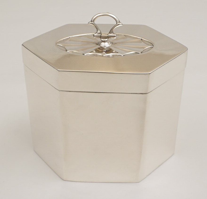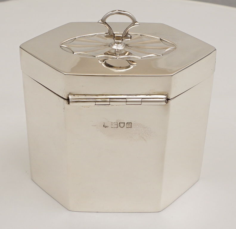 DESCRIPTION | Good quality antique English Georgian style solid sterling silver tea caddy with bat's wing decoration to the hinged lid. Nicely hallmarked to body, lid and handle. |