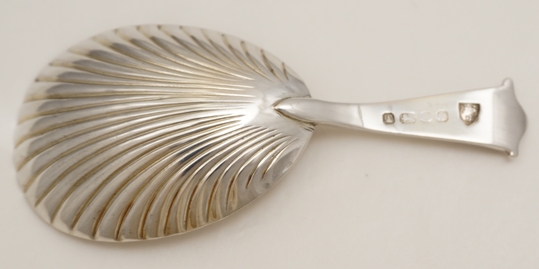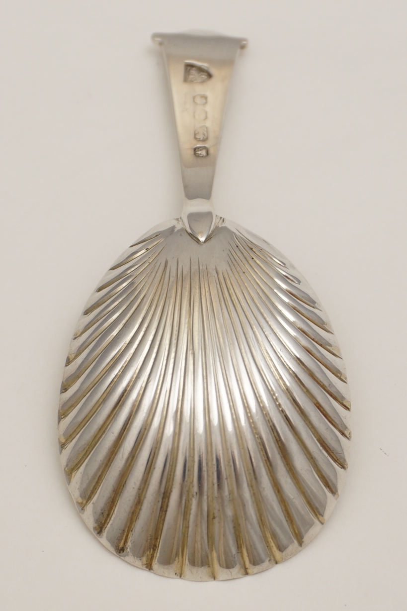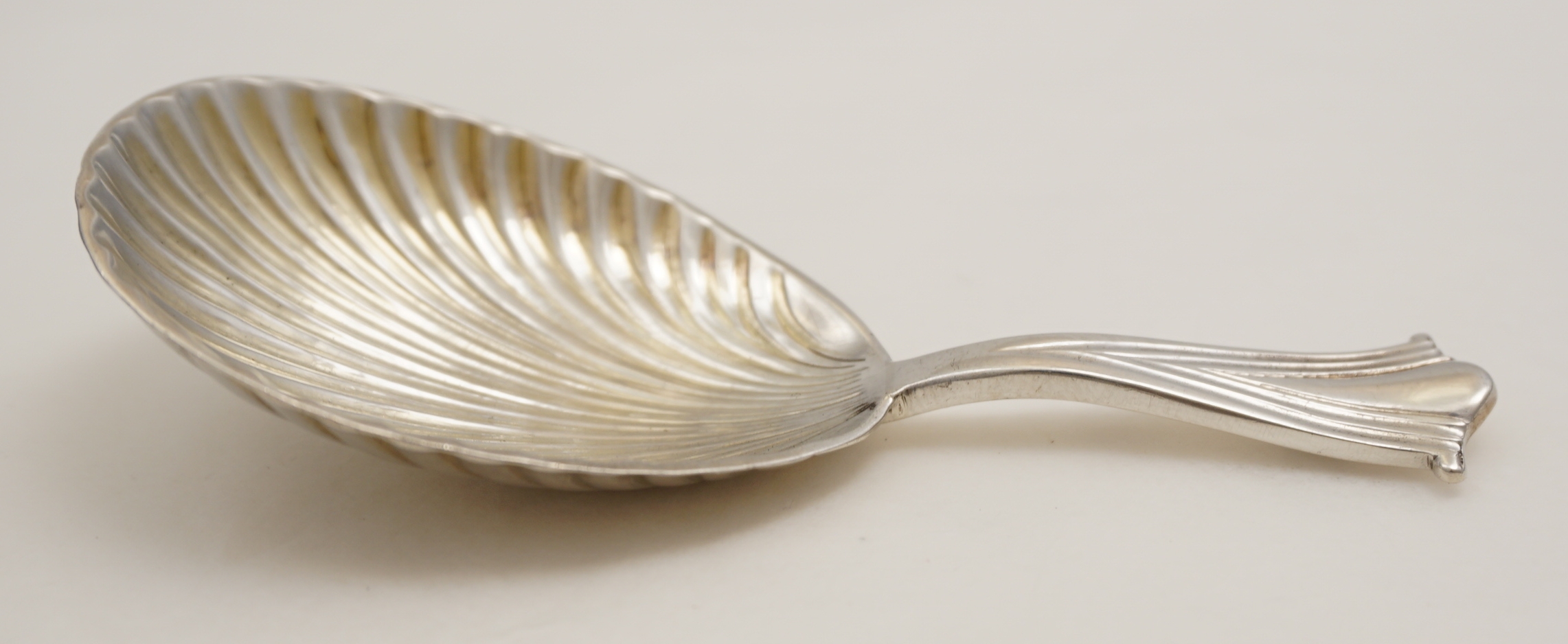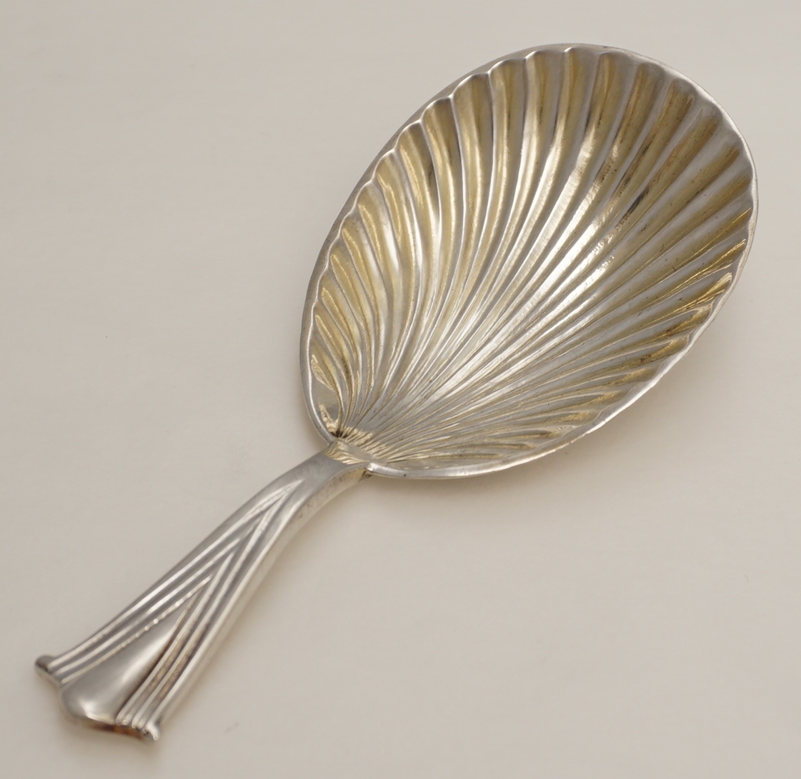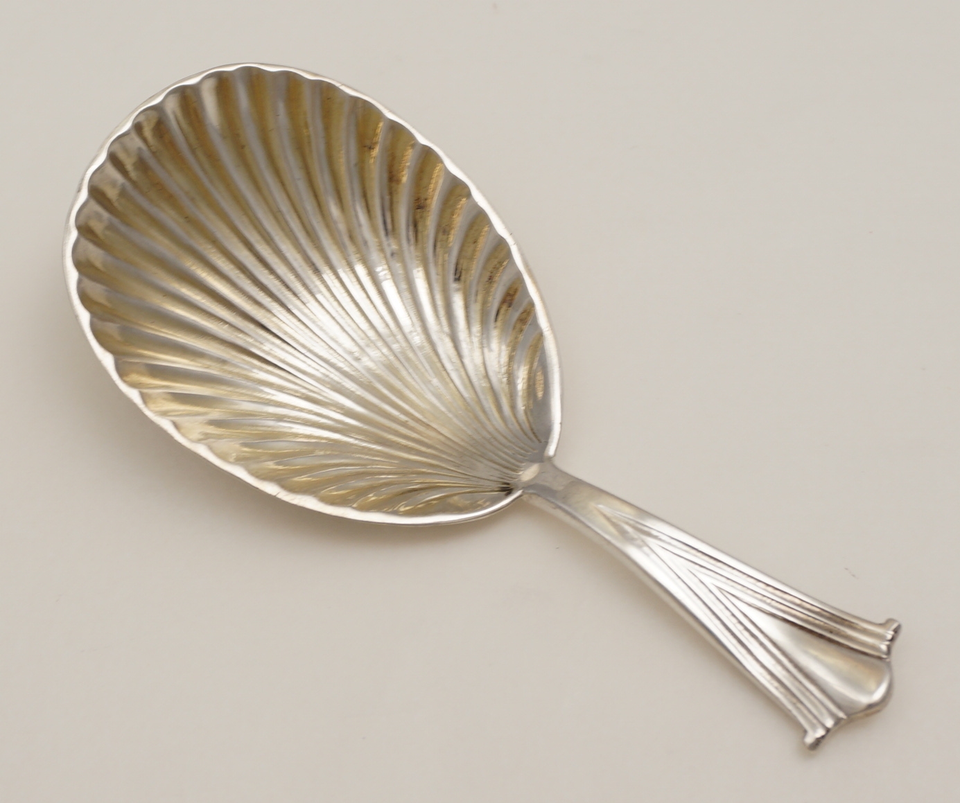 DESCRIPTION | Heavy antique English Victorian solid sterling silver tea caddy spoon with a gilded shell bowl. |