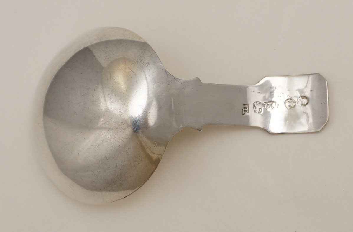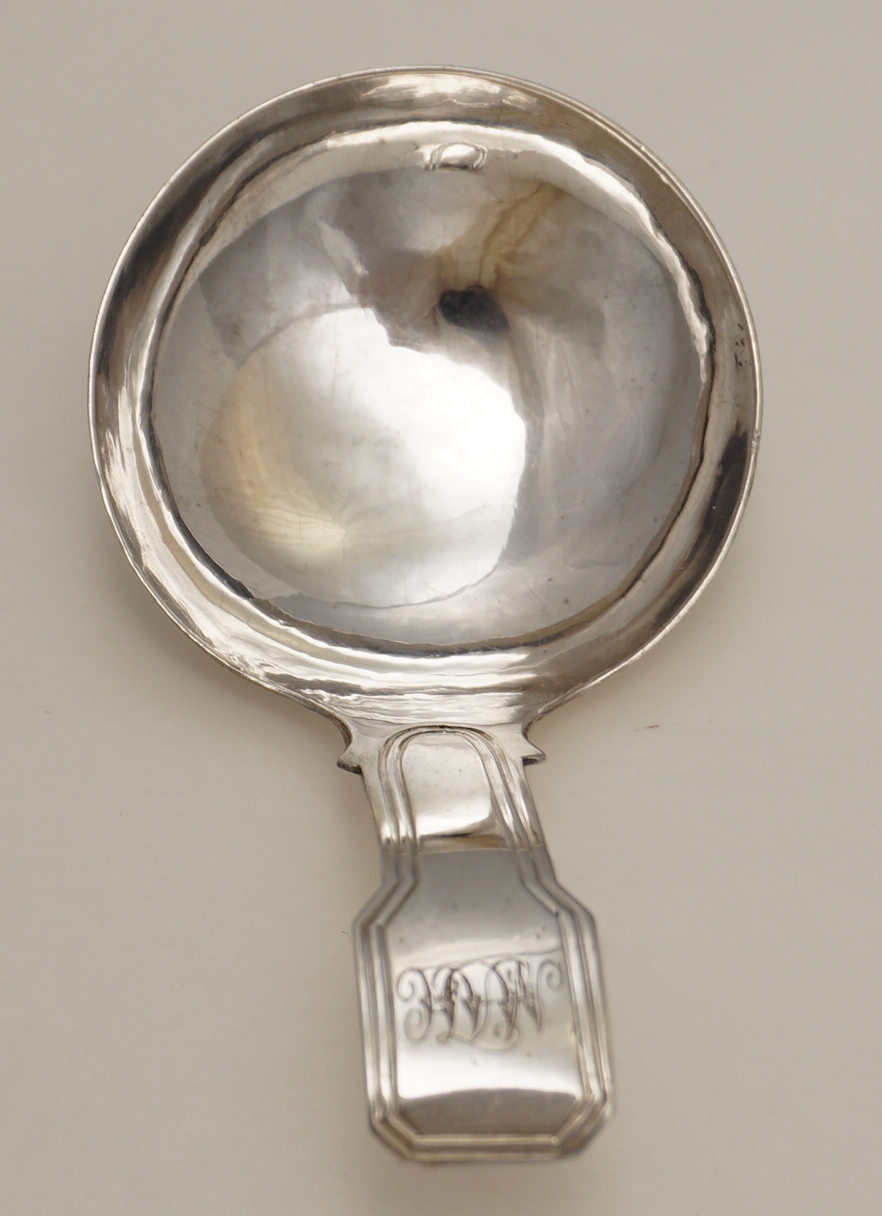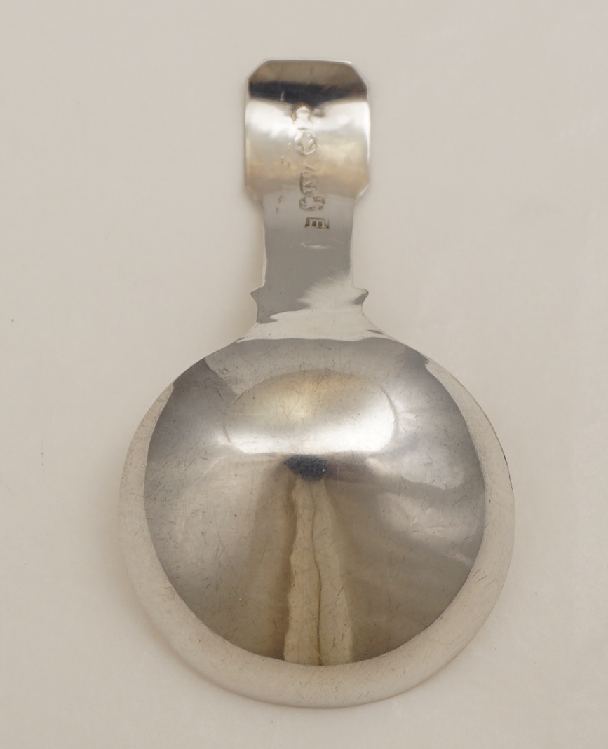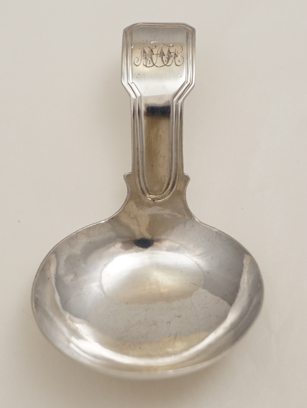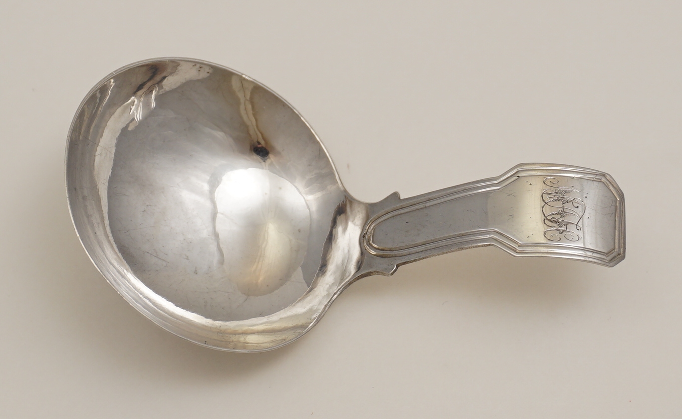 DESCRIPTION | Good antique English Georgian solid sterling silver Fiddle & Thread pattern tea caddy spoon with a frontal monogram engraving. |