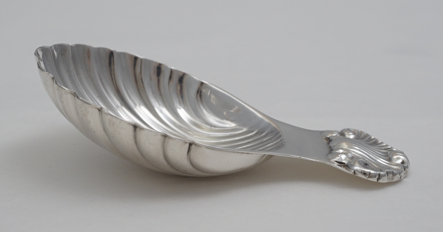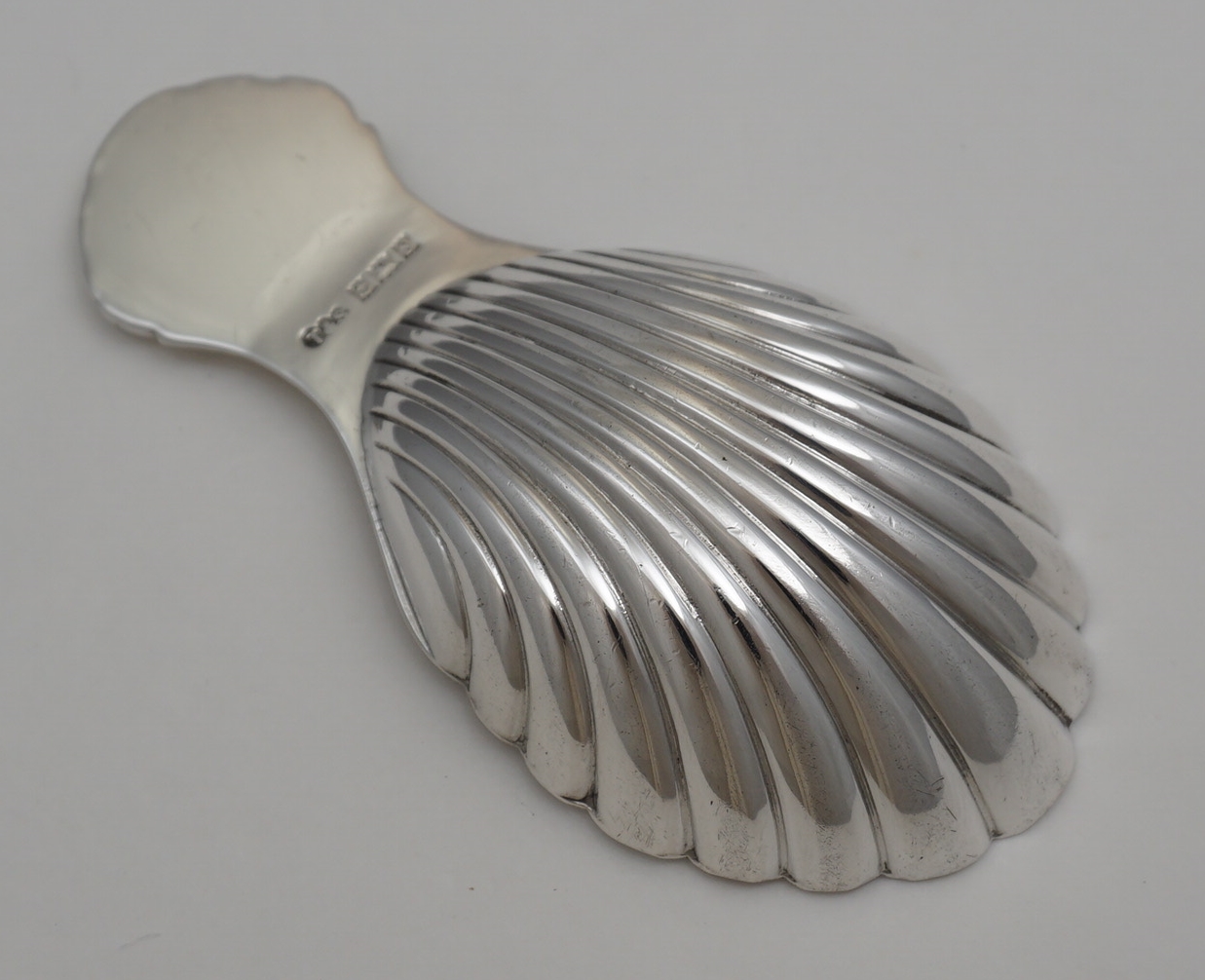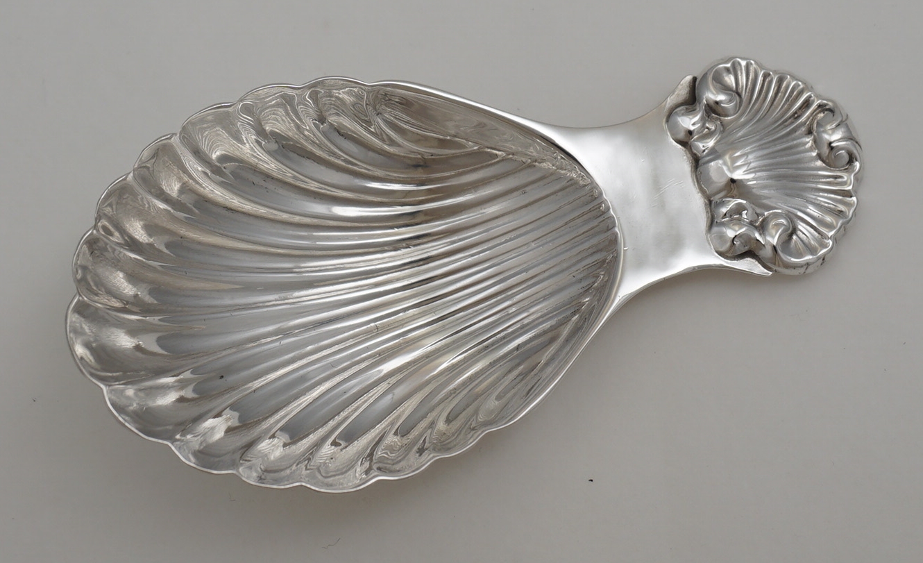 DESCRIPTION | Vintage English sterling silver tea caddy spoon with a shell bowl and rococo shell terminal. |