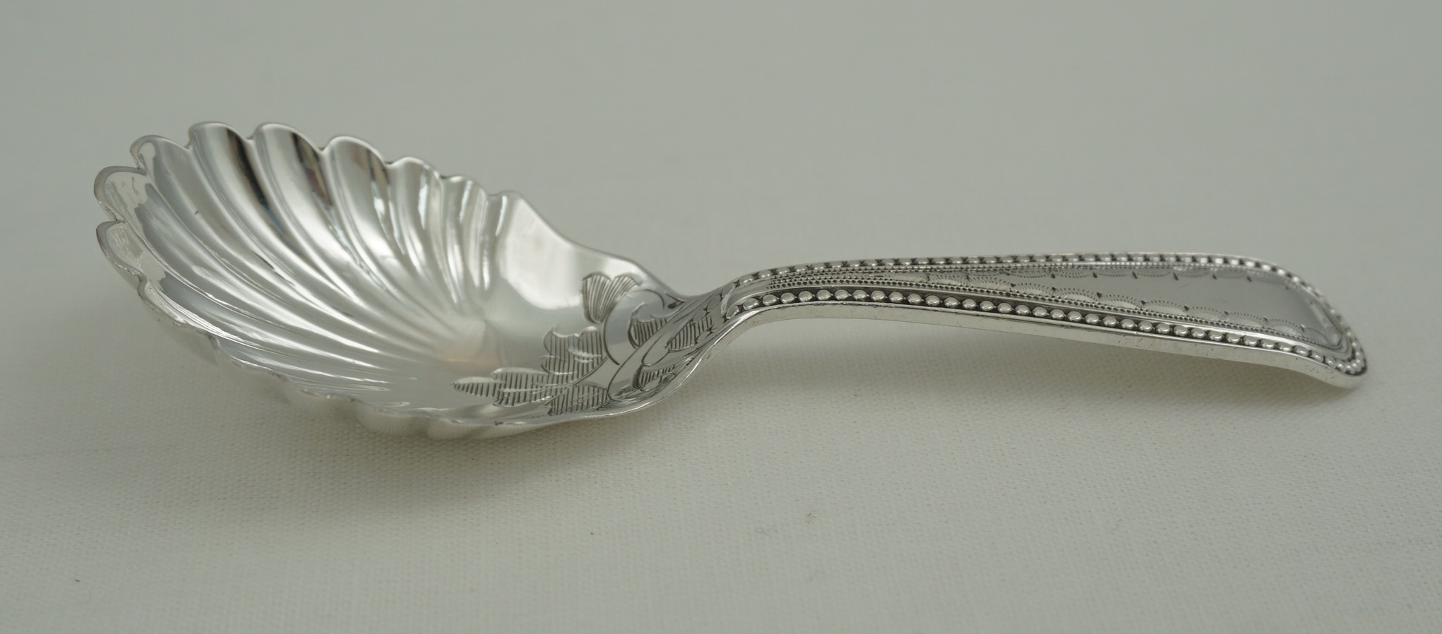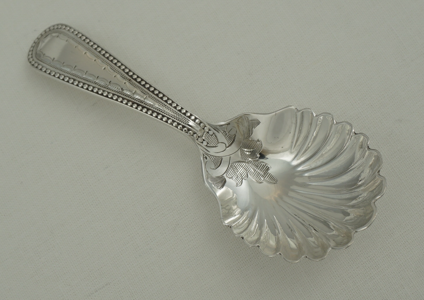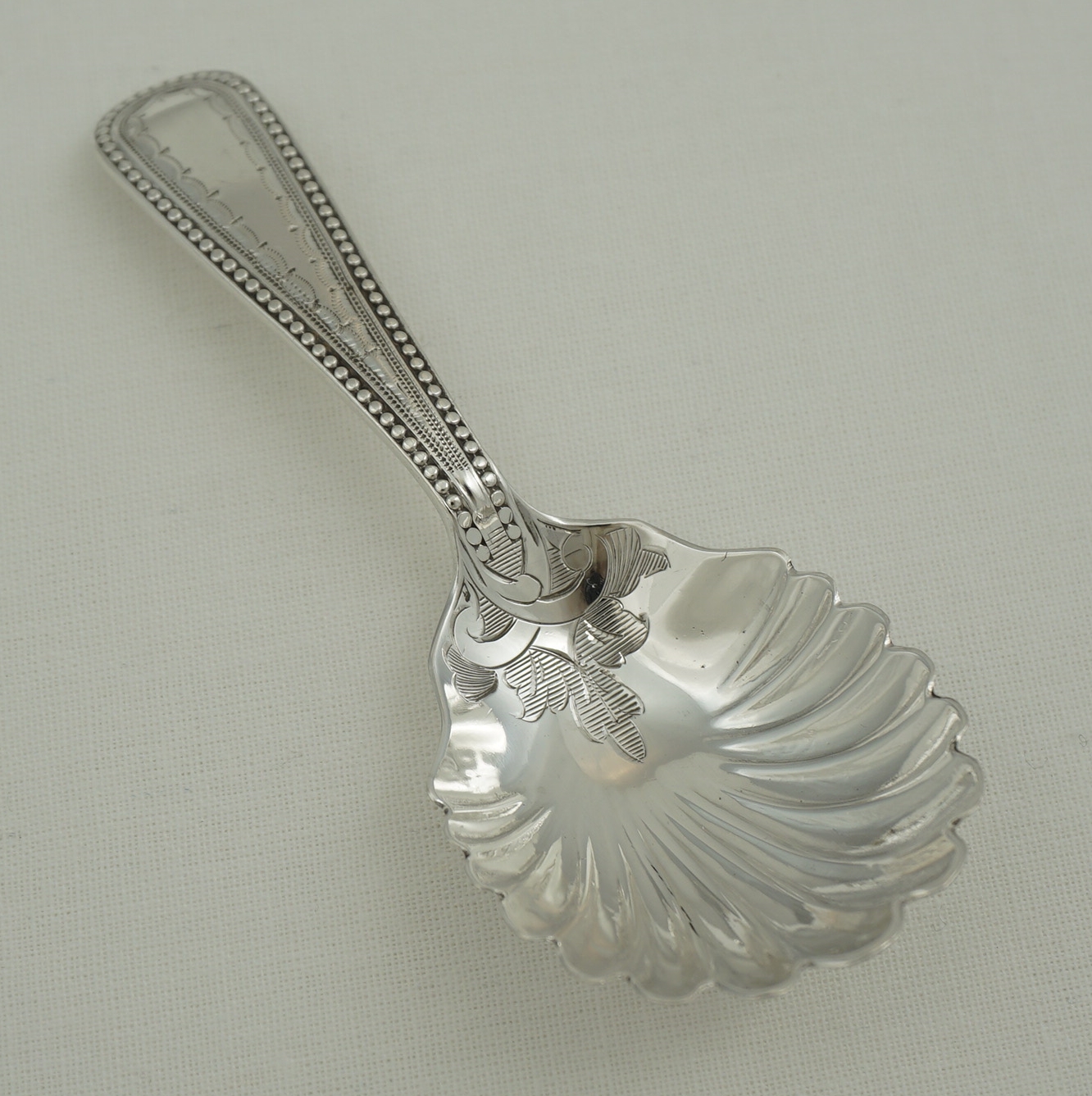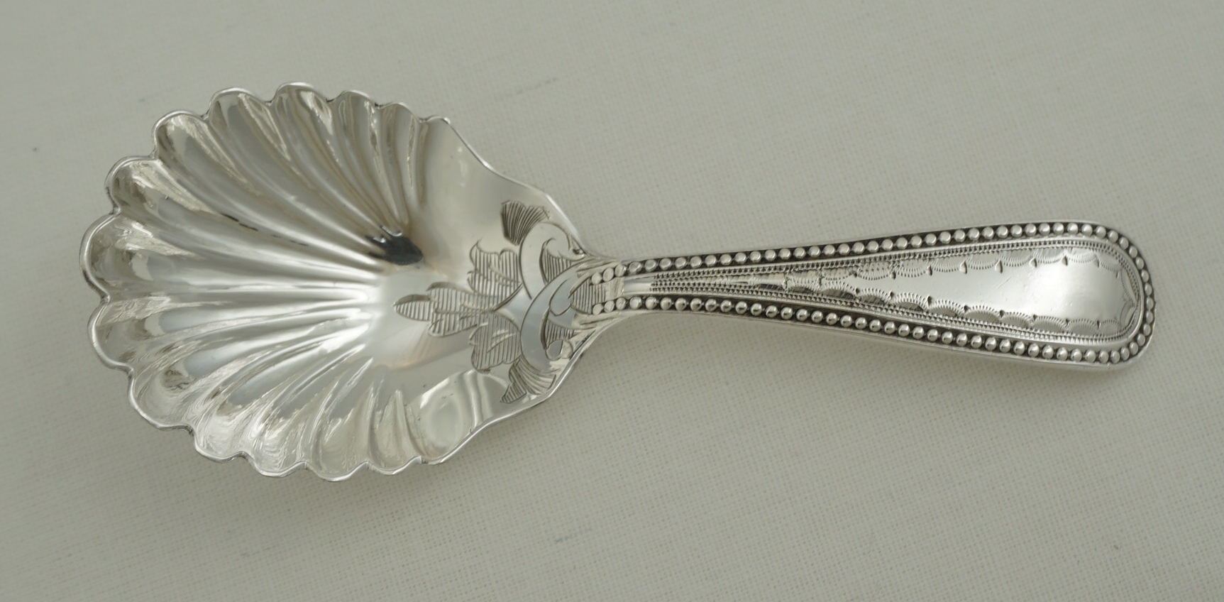 DESCRIPTION | High quality and scarce antique English Victorian solid sterling silver Old English Bead pattern caddy spoon with a shell bowl and engraved decoration. |
