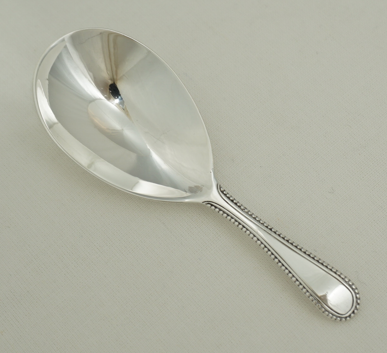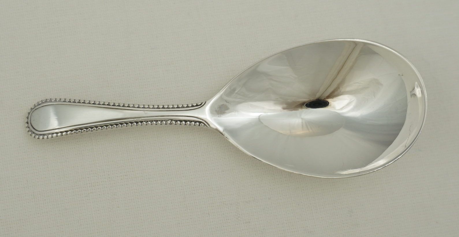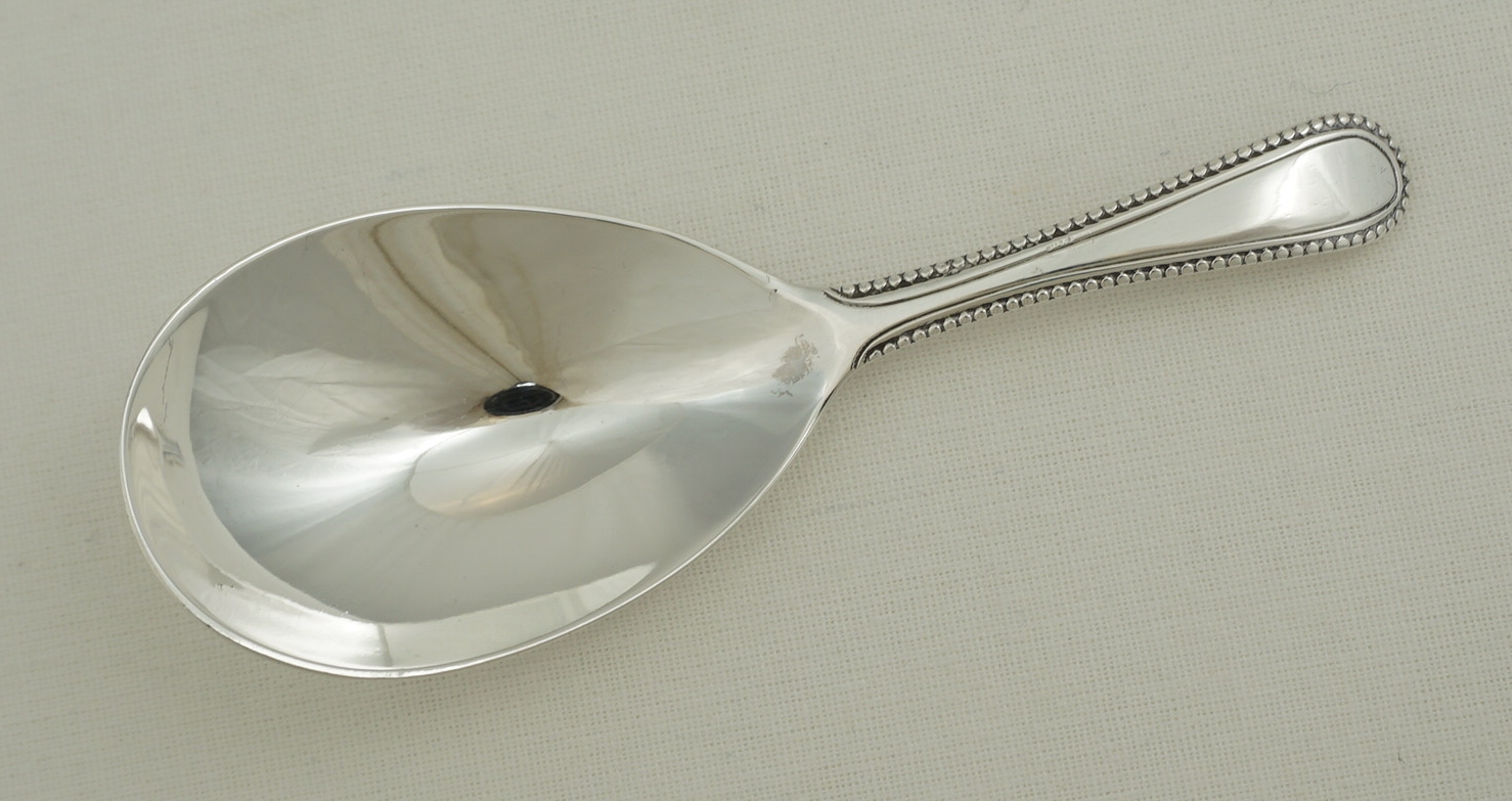 DESCRIPTION | Superb antique English Georgian solid sterling silver caddy spoon with a bead-edge decorated stem, no engraving or erasure, beautifully well-struck and preserved hallmarks. |