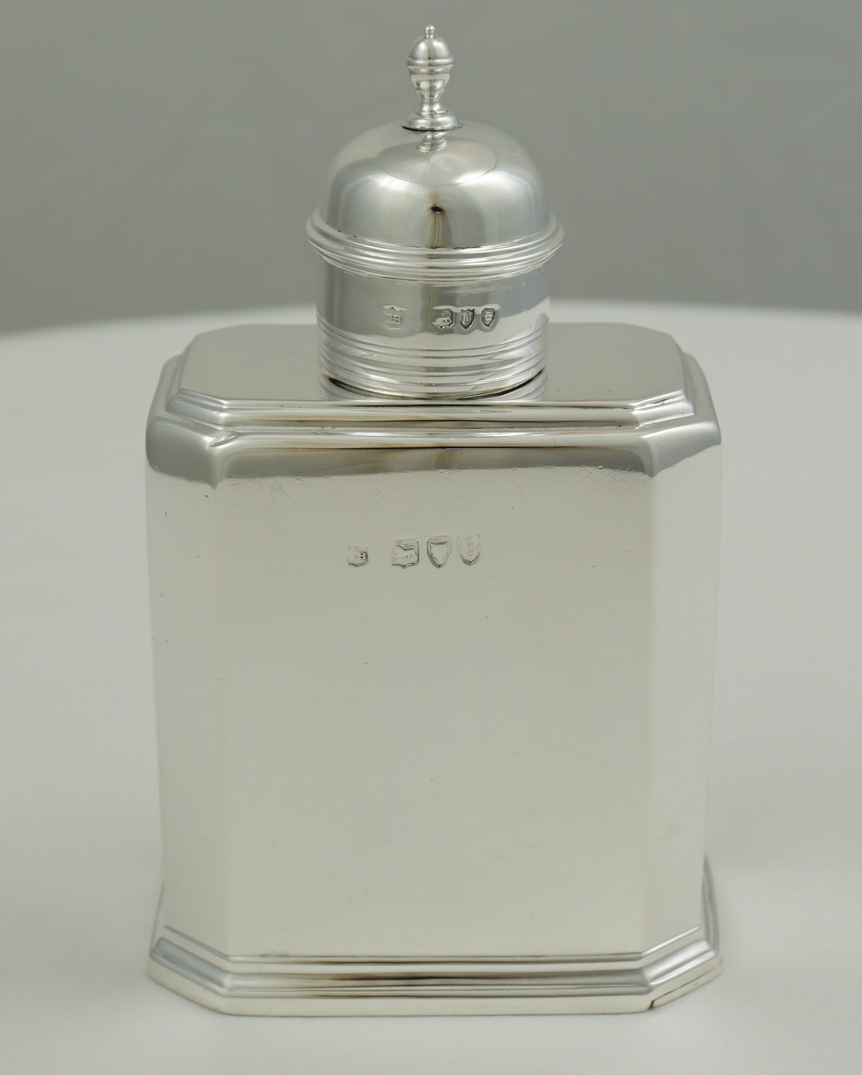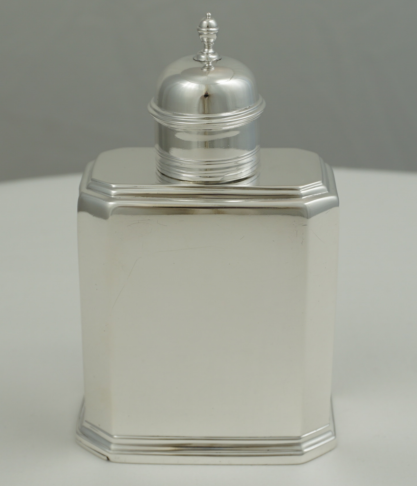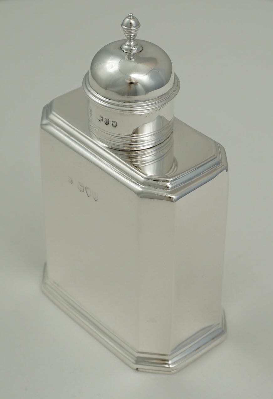 DESCRIPTION | High quality antique English Victorian solid silver faithful reproduction of an octaform Queen Anne (1702-14) tea caddy with pull off top and slide opening base. The original would have been of Britannia standard, this one is sterling standard. |