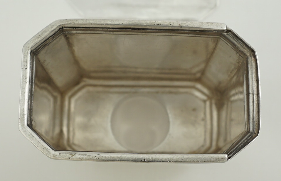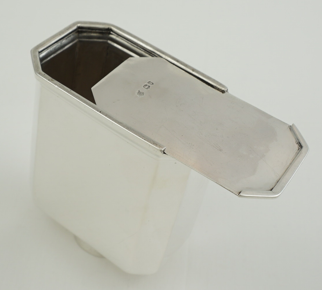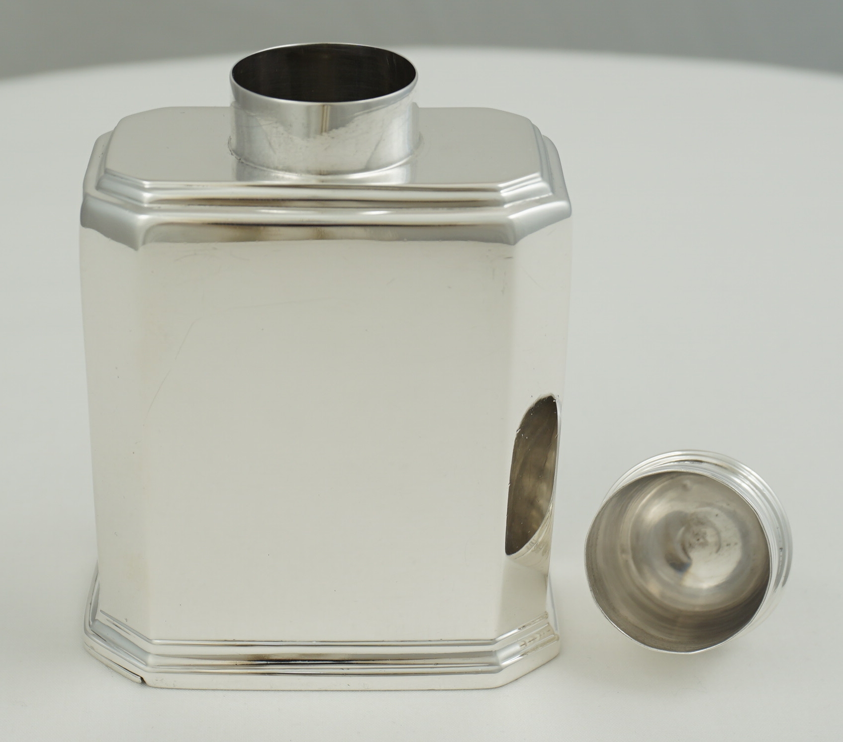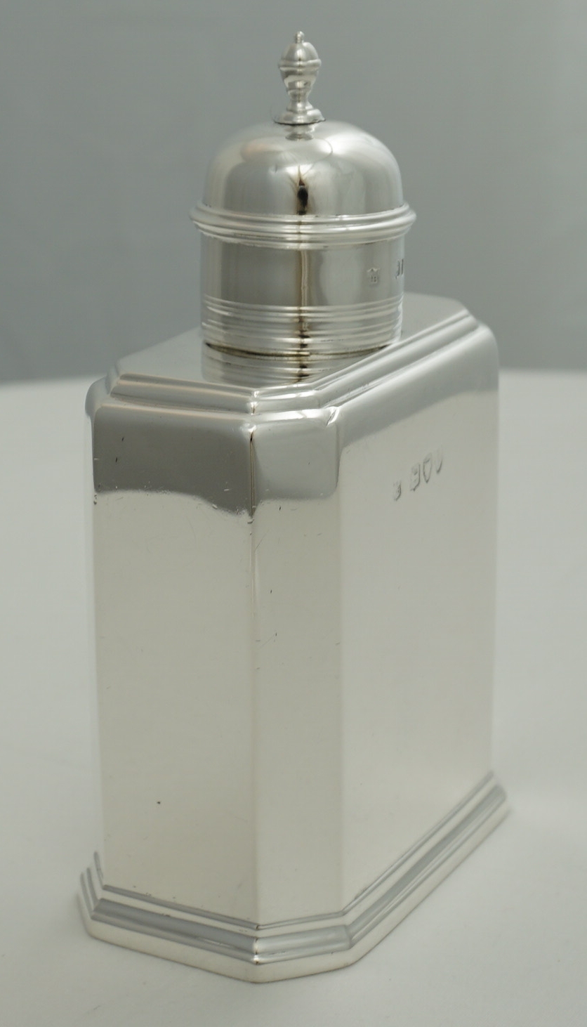 DESCRIPTION | High quality antique English Victorian solid silver faithful reproduction of an octaform Queen Anne (1702-14) tea caddy with pull off top and slide opening base. The original would have been of Britannia standard, this one is sterling standard. |