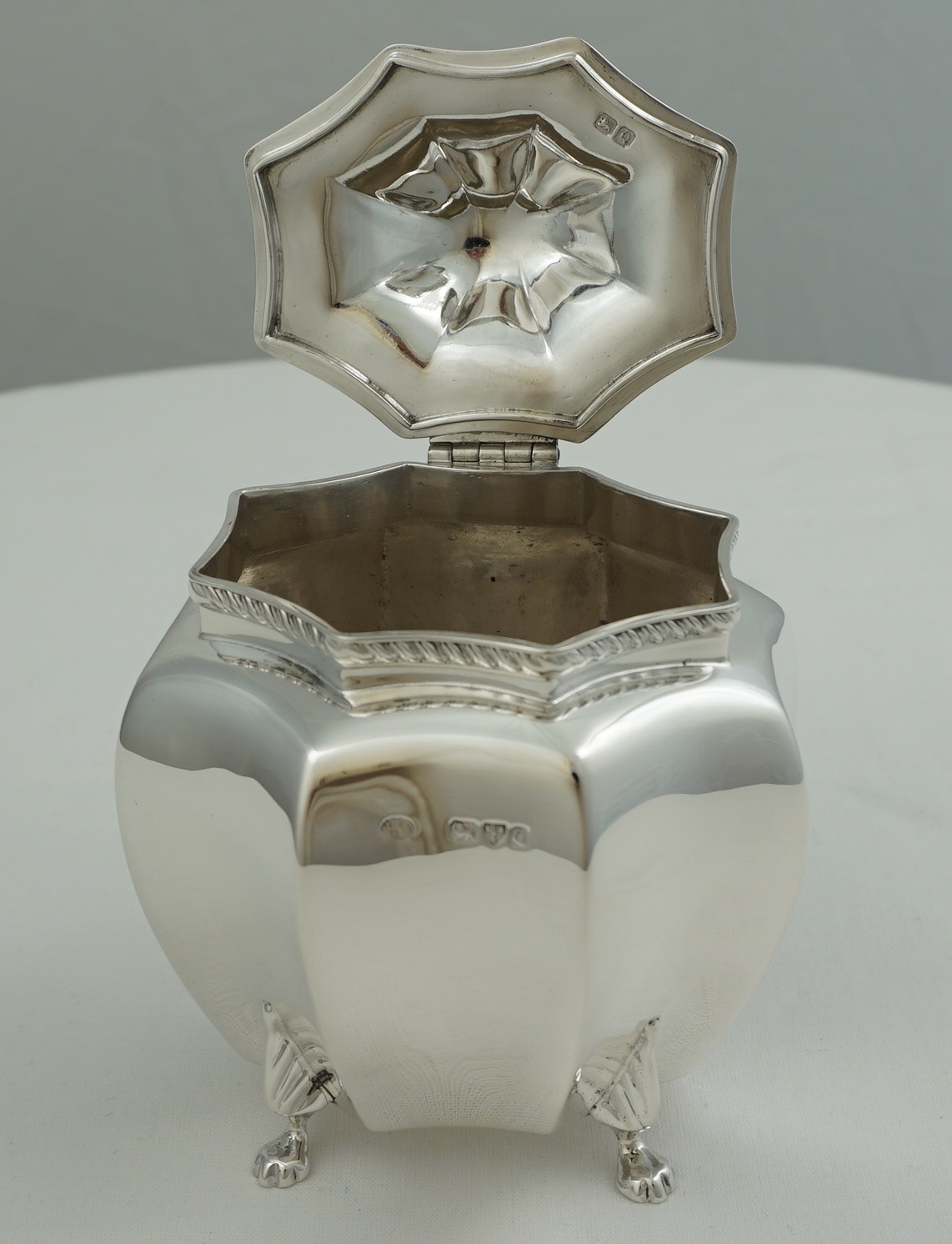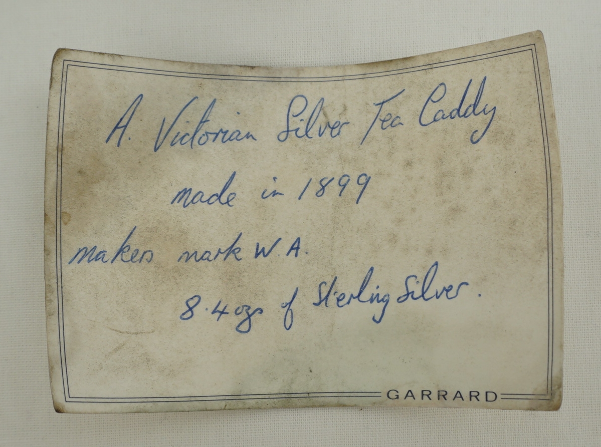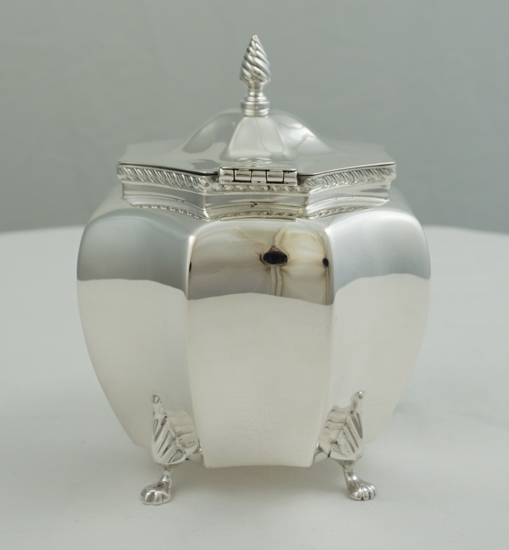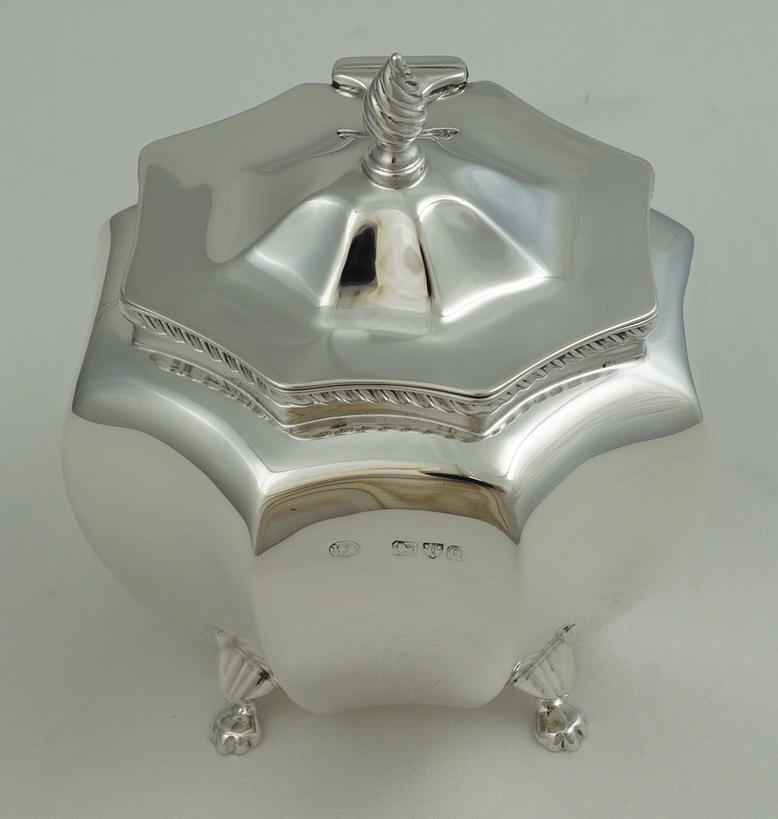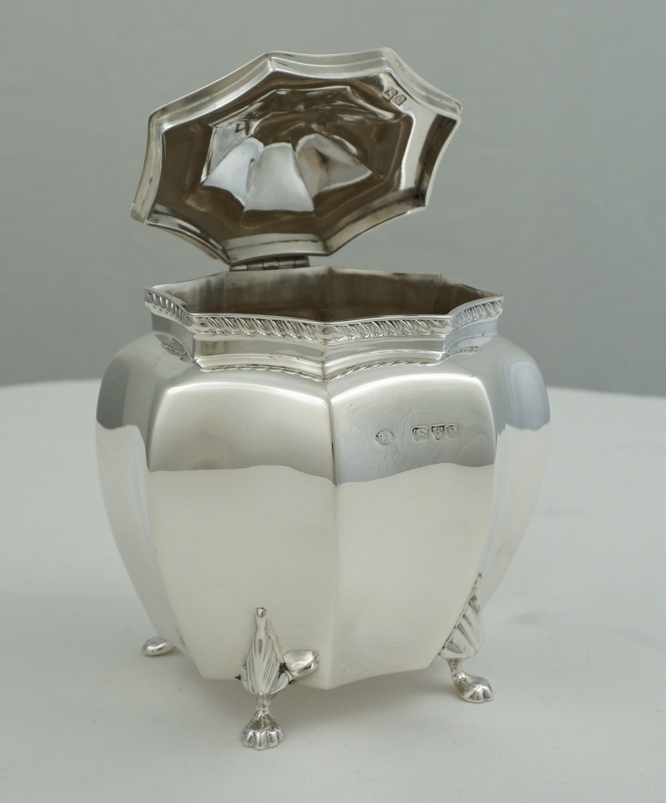 DESCRIPTION | High quality antique English Victorian solid sterling silver octaform tea caddy with writhen finial, gadroon rim decoration and cast paw feet. Each foot is joined mid-leg with the rear left a fractionally different design (see image 3). Could be a replacement but more likely the silversmith picked a foot from the wrong box and did not notice. The old Garrard card found inside details the tea caddy but is not a formal receipt so I suspect this item was bought as a gift and the Garrard's salesperson wrote the card for the benefit of the recipient. |