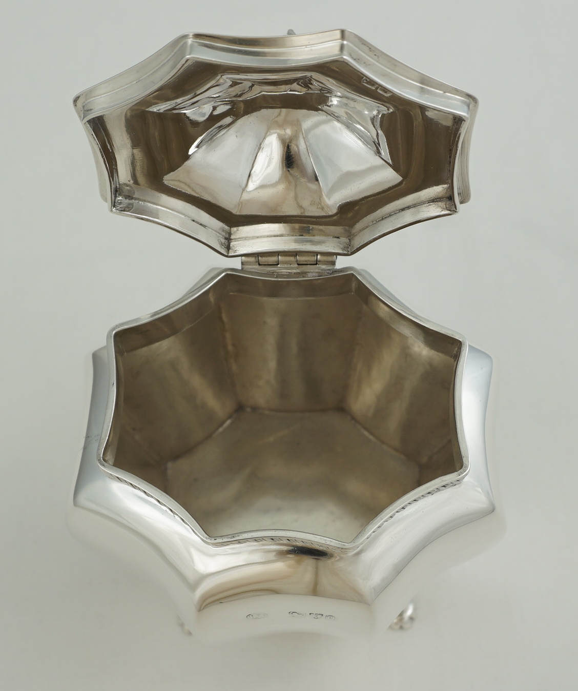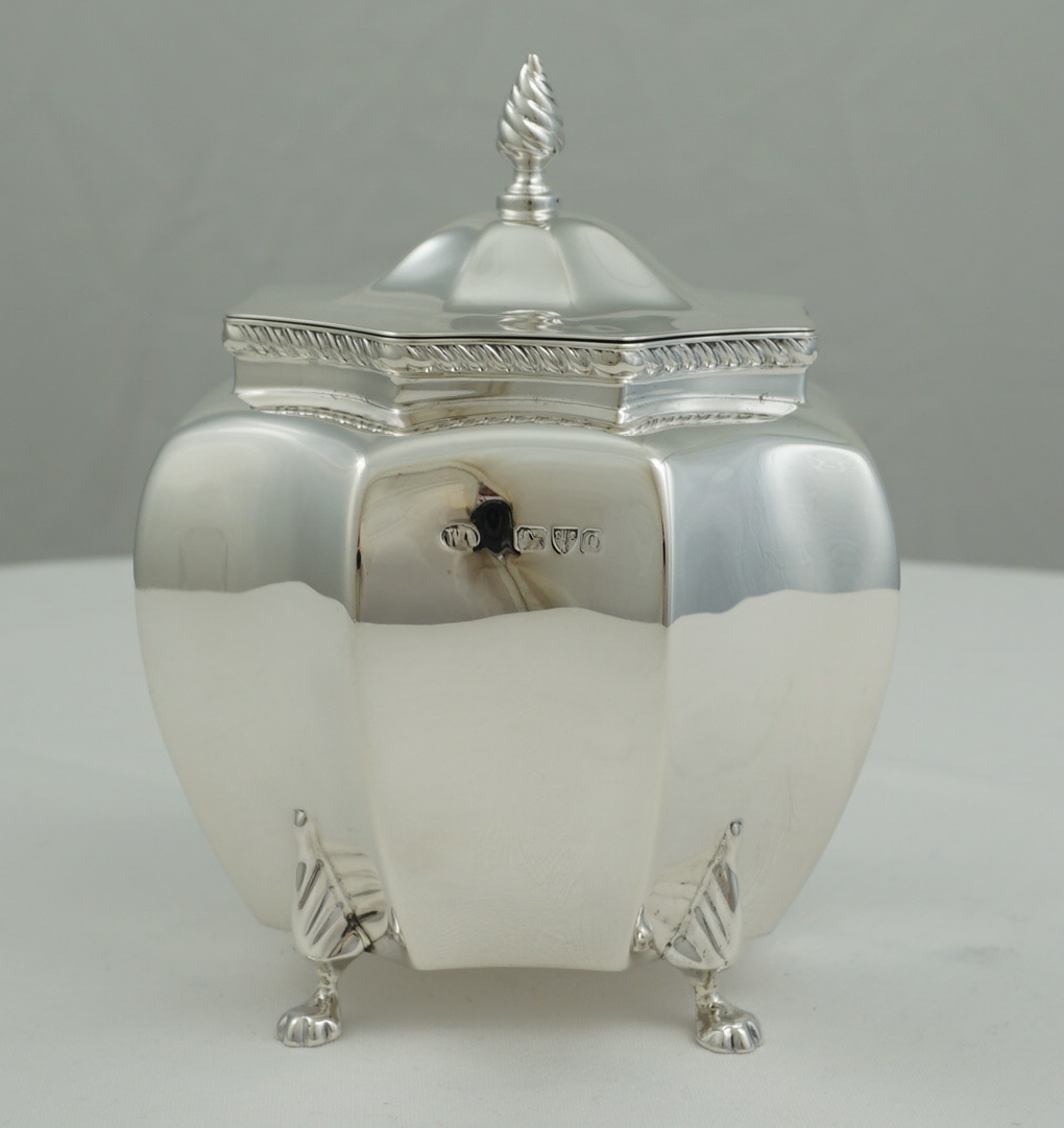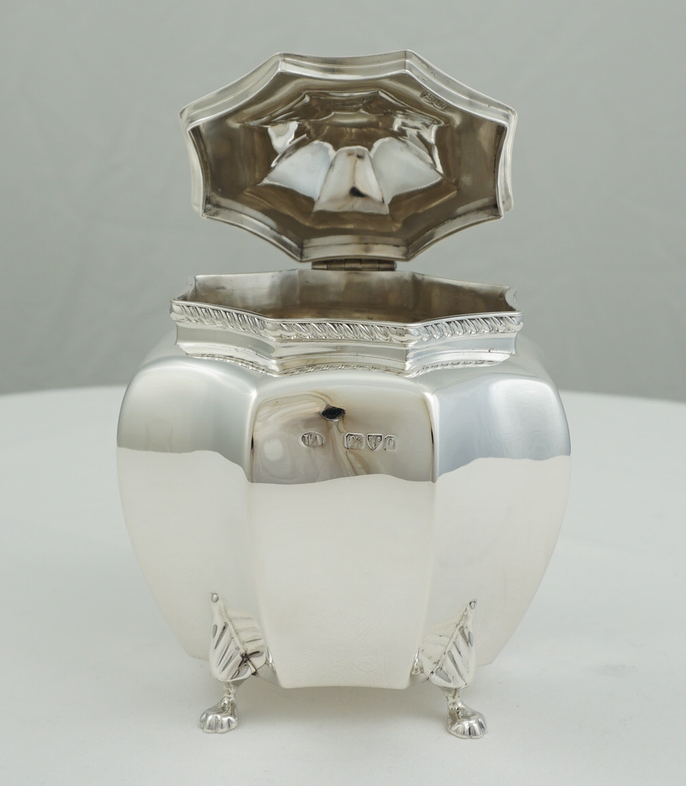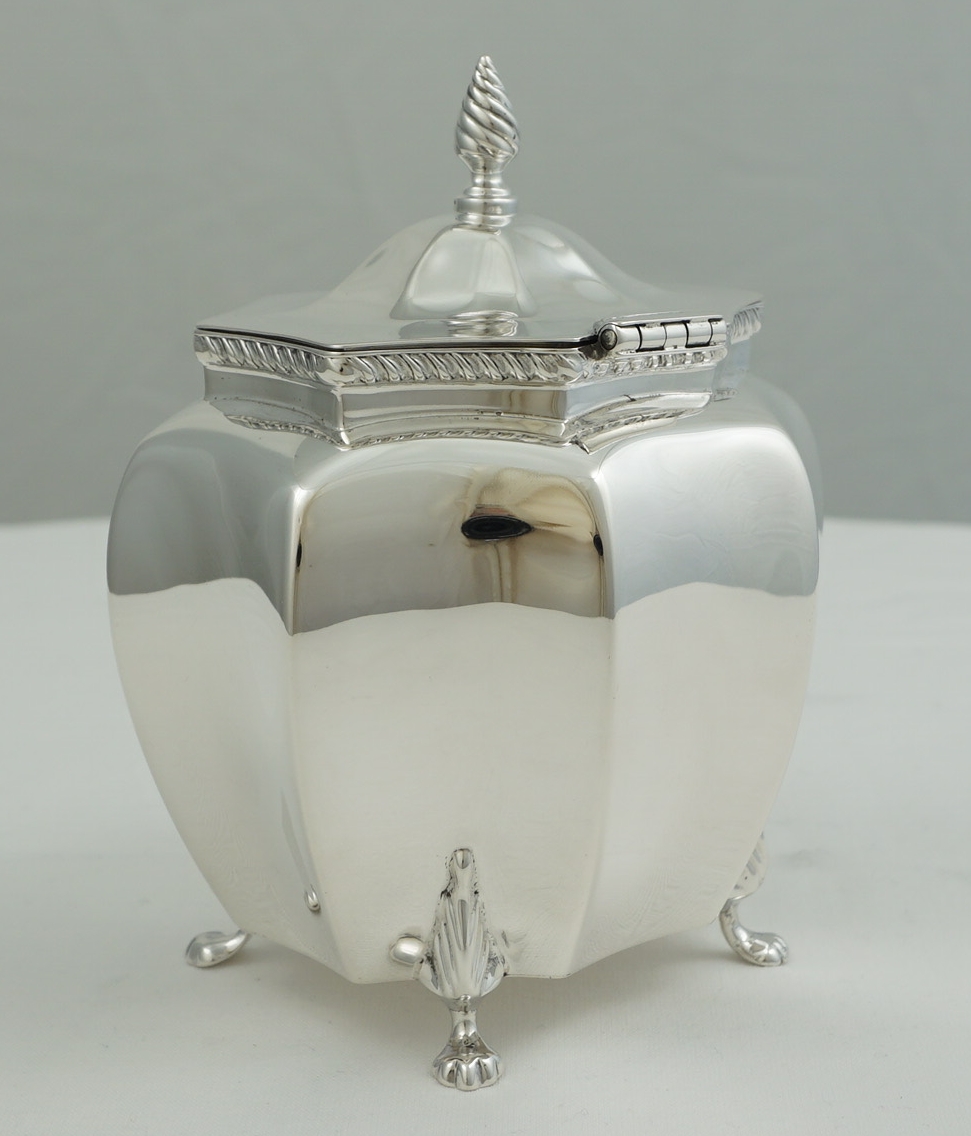 DESCRIPTION | High quality antique English Victorian solid sterling silver octaform tea caddy with writhen finial, gadroon rim decoration and cast paw feet. Each foot is joined mid-leg with the rear left a fractionally different design (see image 3). Could be a replacement but more likely the silversmith picked a foot from the wrong box and did not notice. The old Garrard card found inside details the tea caddy but is not a formal receipt so I suspect this item was bought as a gift and the Garrard's salesperson wrote the card for the benefit of the recipient. |