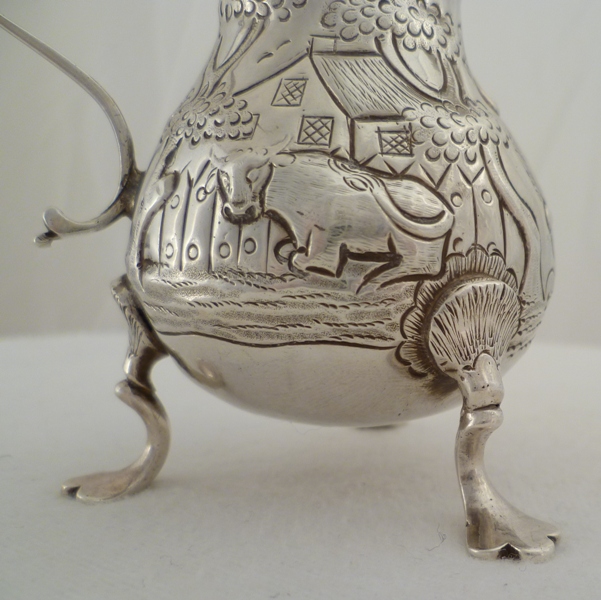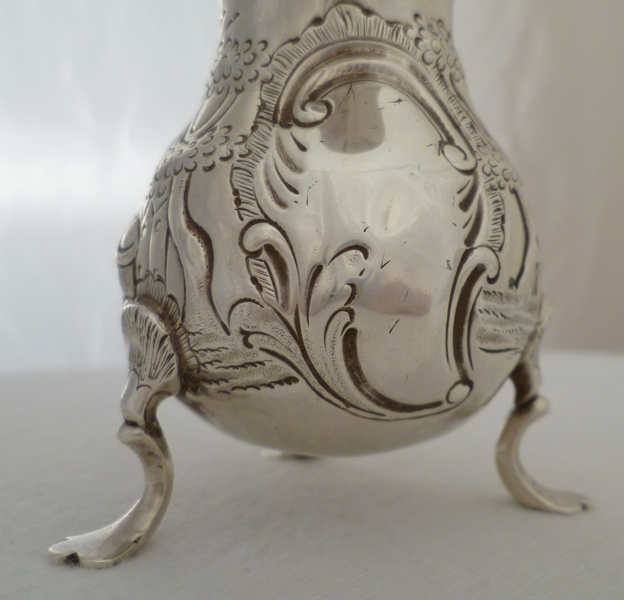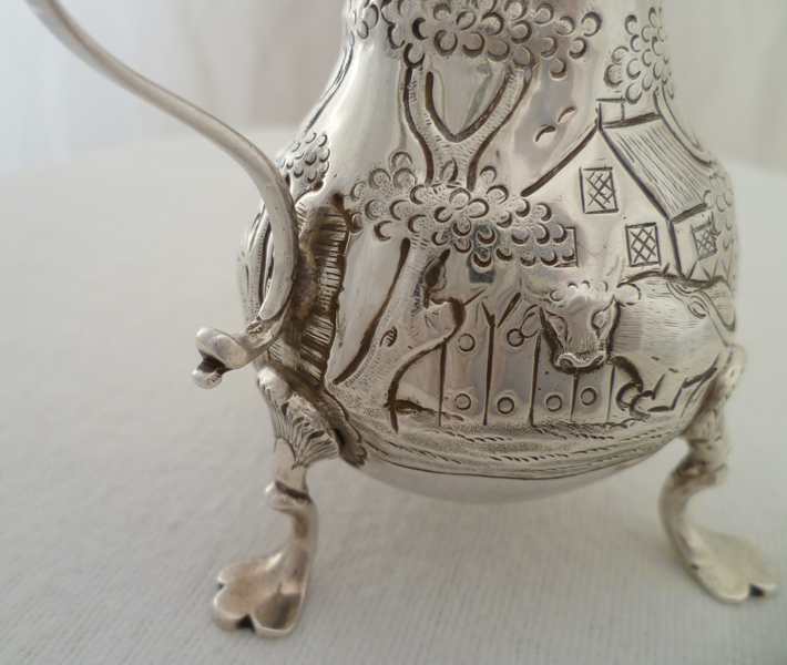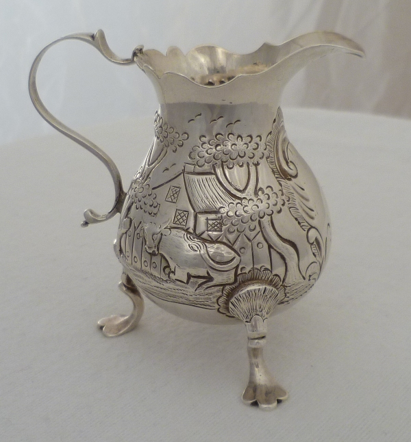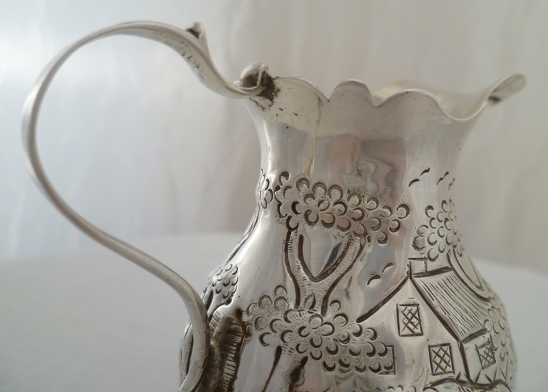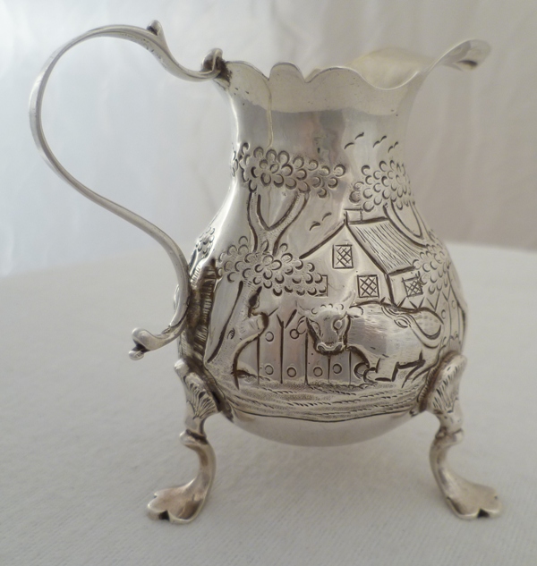 Georgian silver cream jug with embossed and engraved decoration and an erased cartouche. If I were to decorate a jug in this fashion I would do