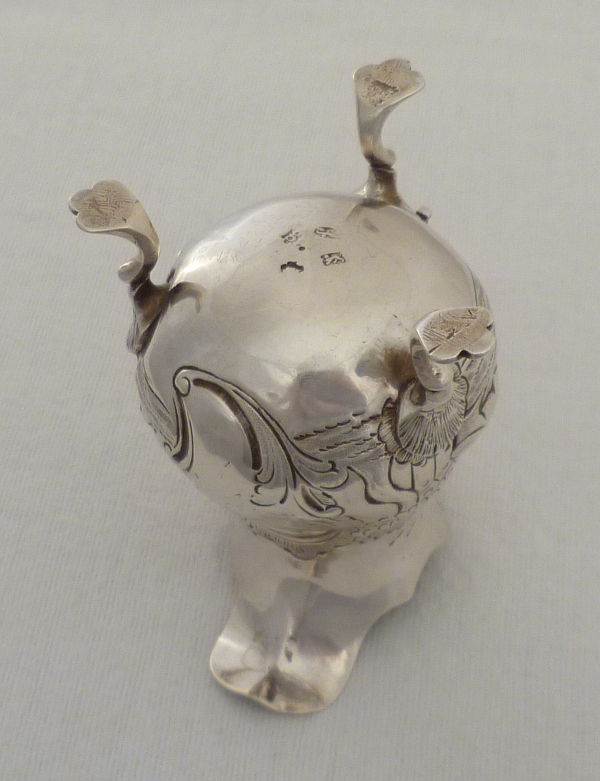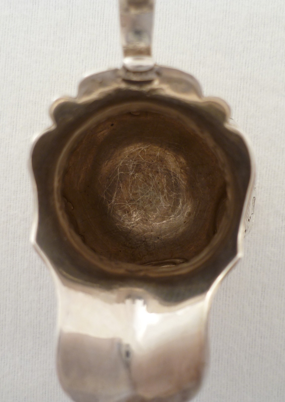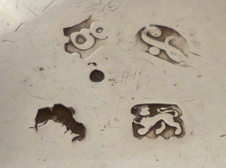 good example of thick silver throughout, several little bumps, one leg joint impressed, erased cartouche not thin and with traces of the engraving remaining around the edge. |