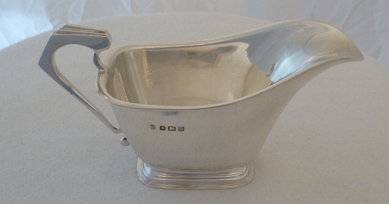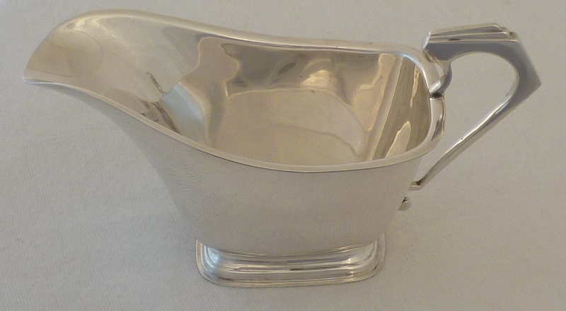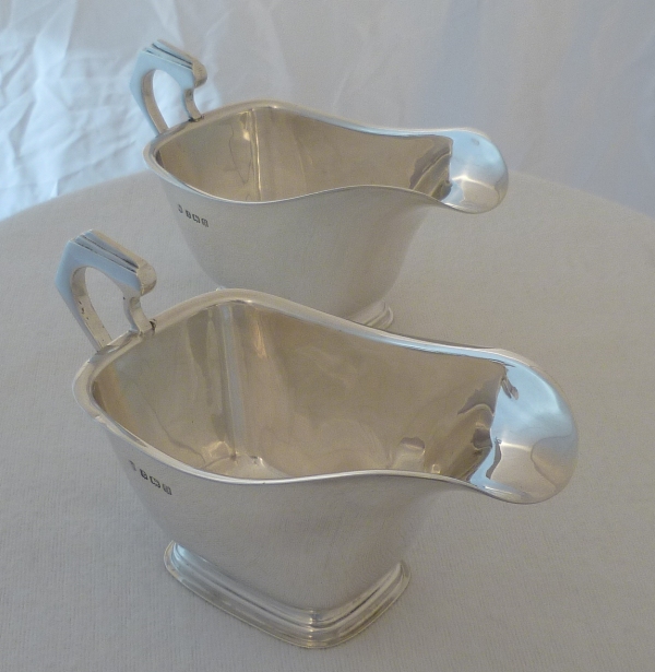 DESCRIPTION | Fine quality pair of small silver boats with stylish Art Deco handles. Thick gauge metal throughout so if warmed before use would help to keep the contents warm or cool if cooled first. In my opinion they are a bit too small for gravy so best suited to sauces, melted butter or cream. |