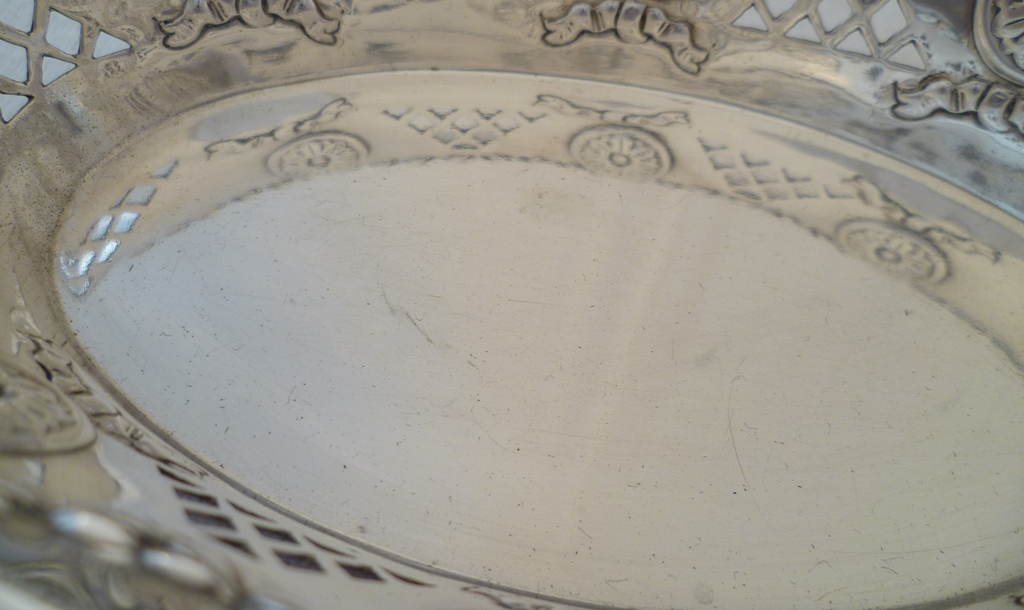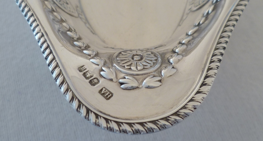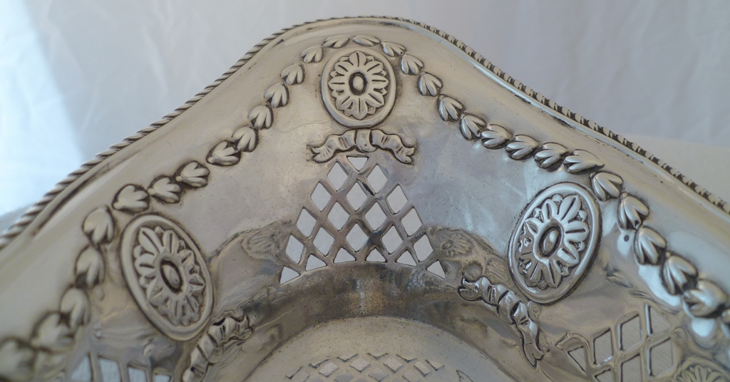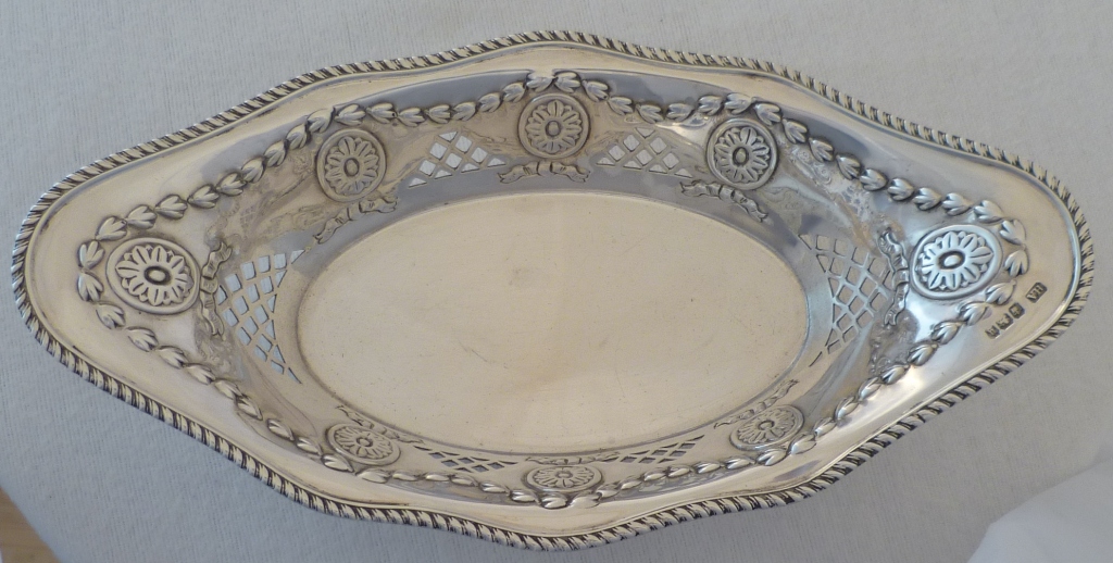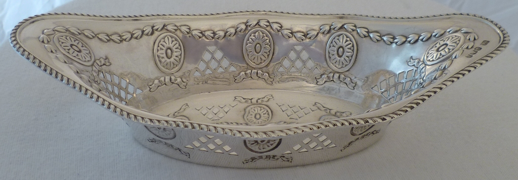 DESCRIPTION | Very good Victorian silver navette shaped bonbon or nut dish with a gadrooned top rim, pierced panel and roundel decoration, the silver of a thicker gauge than average for this type of dish.. |