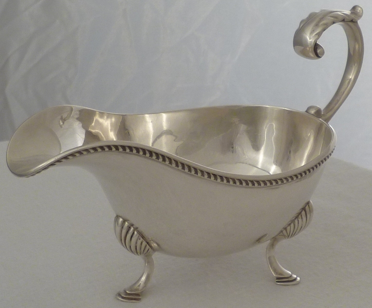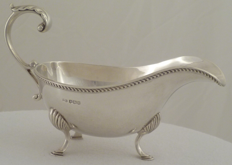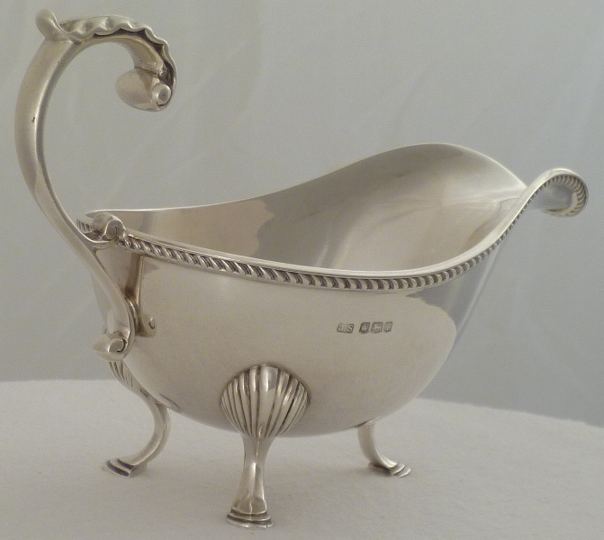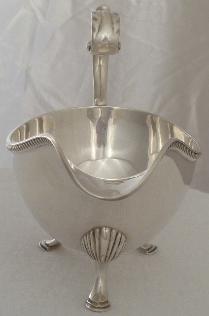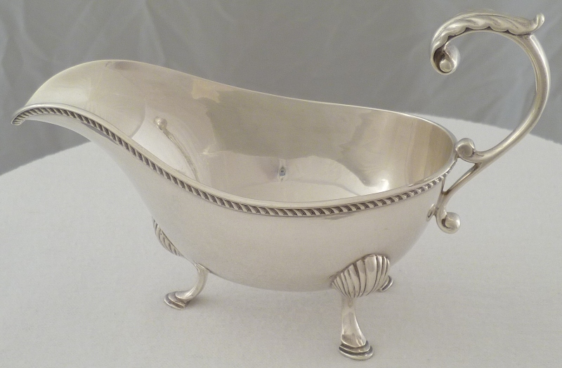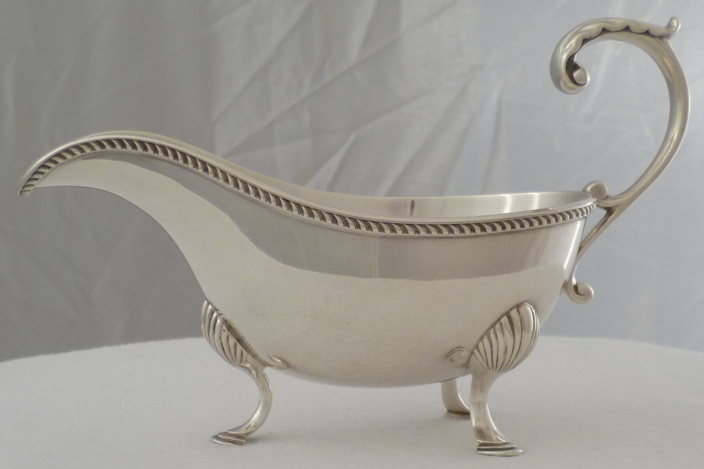 DESCRIPTION | Good silver sauce boat with a flying leaf capped scrolling handle, a gadroon decorated top rim and three shell capped pad feet. |