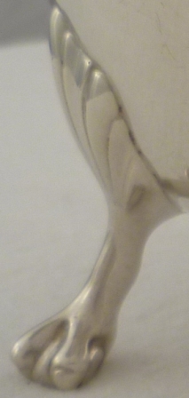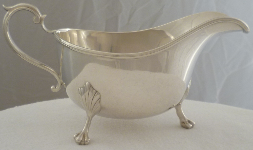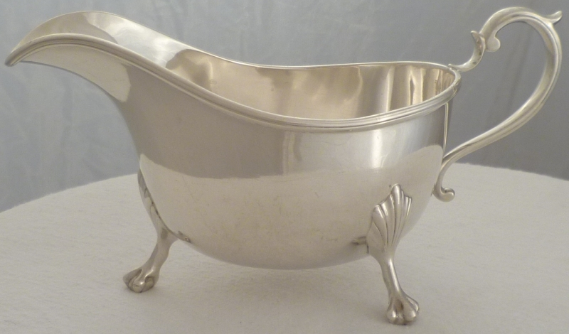 DESCRIPTION | Fine quality and robust silver sauce boat with a scroll handle, thread decorated top rim and three shell capped hock detailed legs on ball and claw feet. |