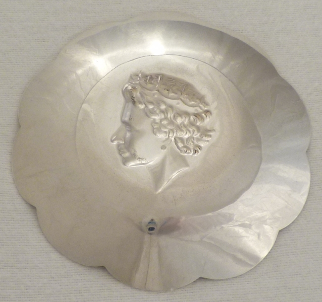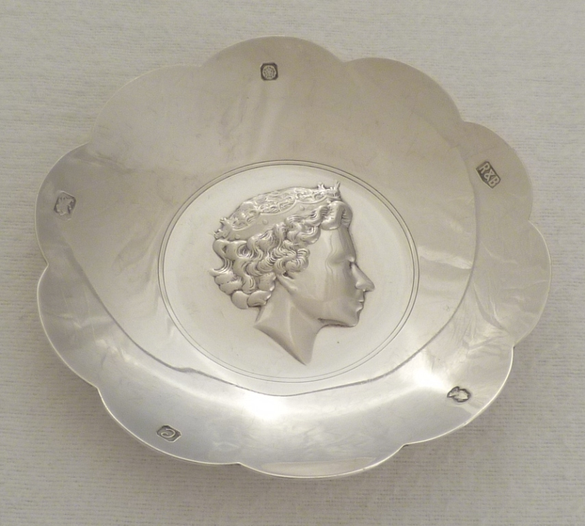DESCRIPTION | Silver dish embossed and engraved with the head of Queen Elizabeth II to mark her silver jubilee in 1977. |