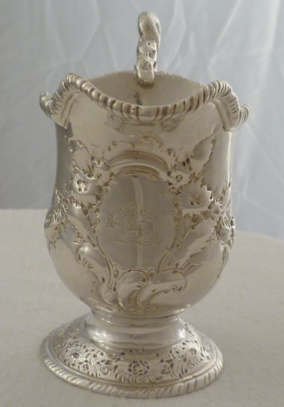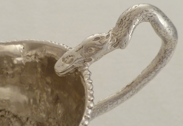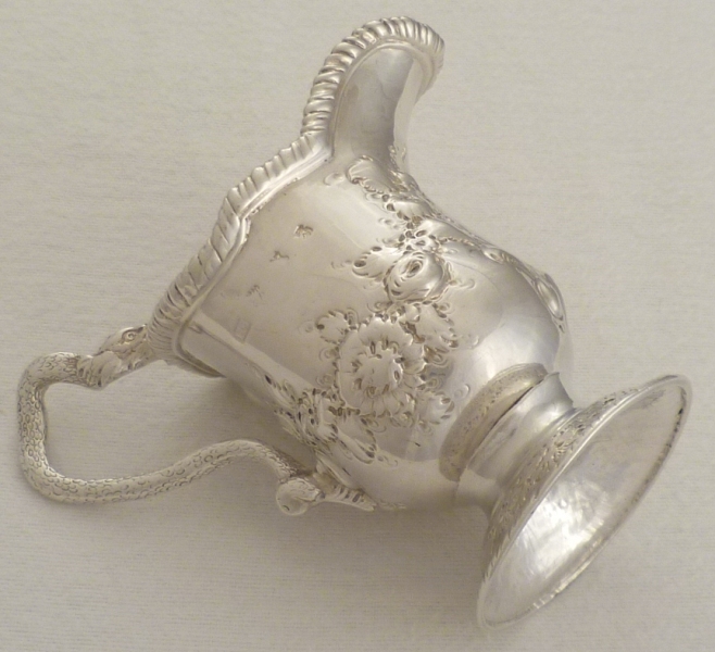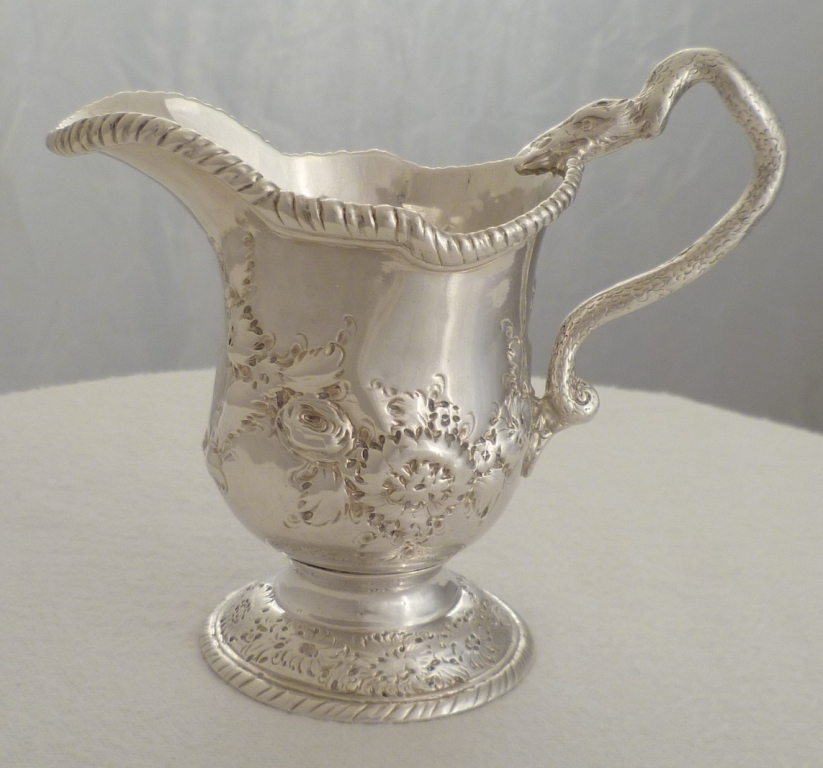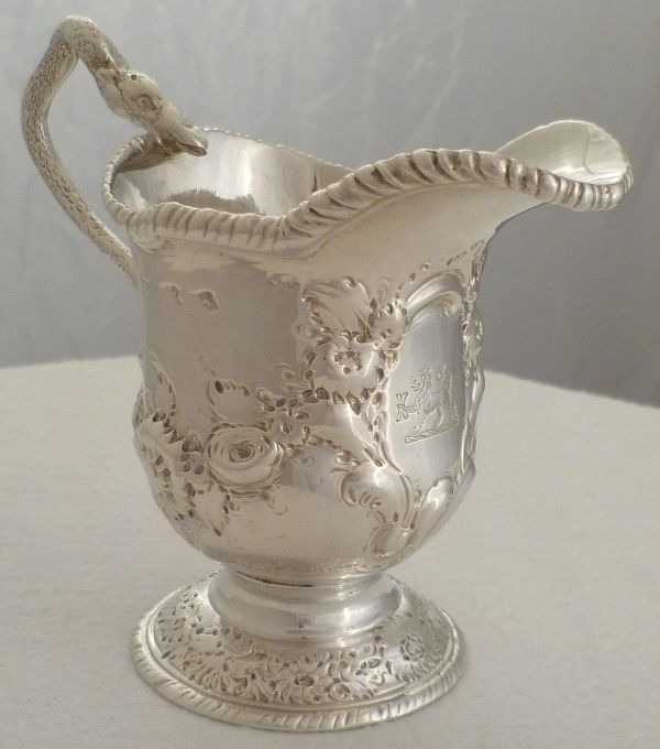 Superb and scarce Georgian silver cream jug with a cast silver handle and base and excessively thick silver throughout. The handle is cast as a wonderful serpent and the rococo cartouche has a crest engraving. As the crest