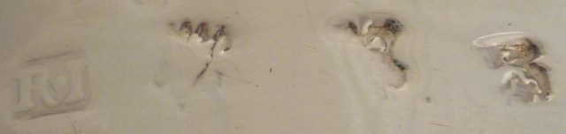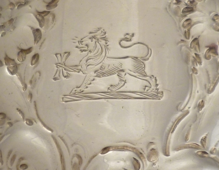 appears to be later than the jug I suspect an erasure although the silver shows no thinning. |