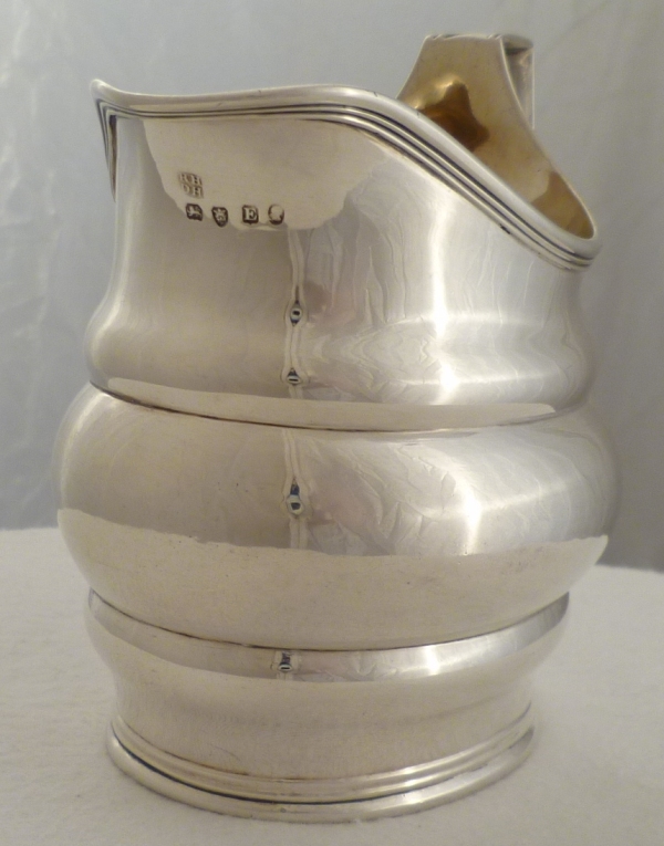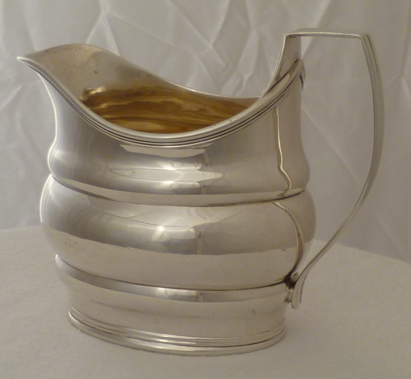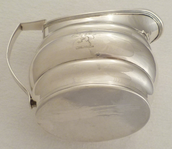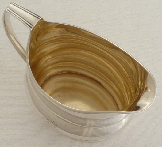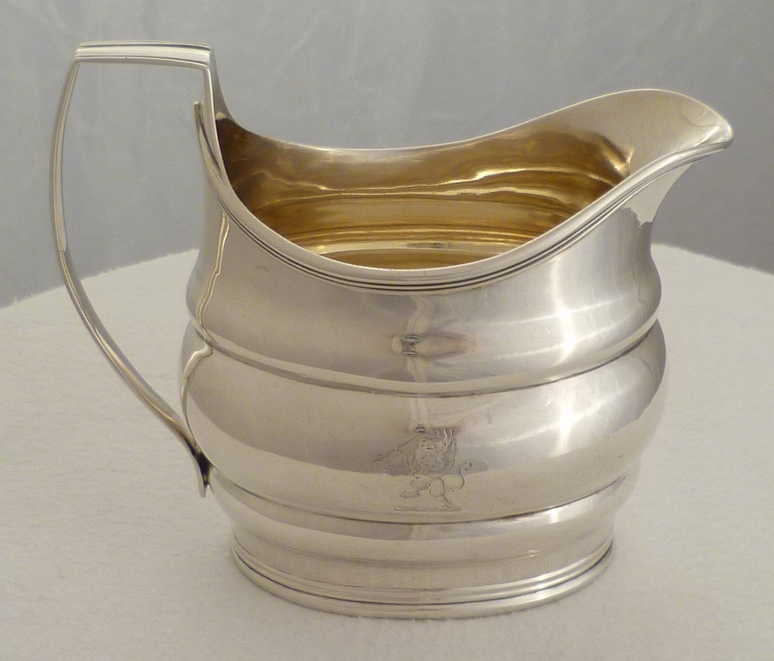 DESCRIPTION | Good sized Georgian silver cream or milk jug with a gilded interior and crest engraving to one side. |