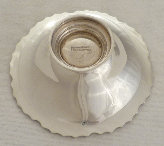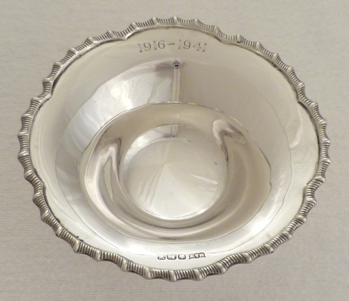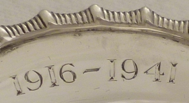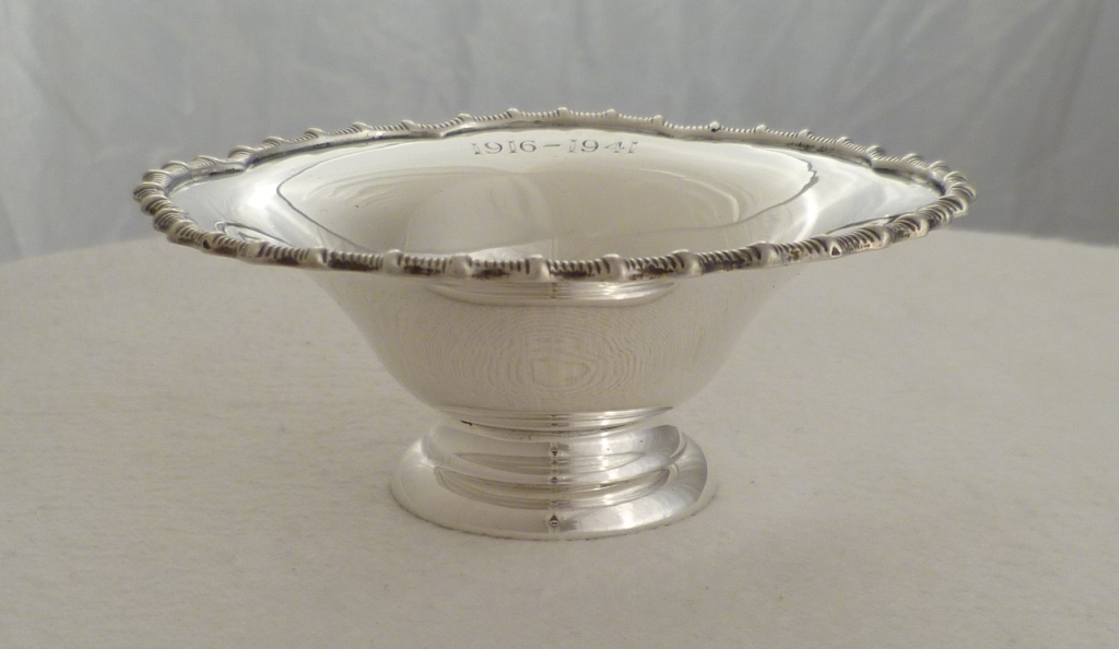 DESCRIPTION | Little silver pedestal dish with a fancy gadroon decorated top rim and inscribed 1916-1941. |