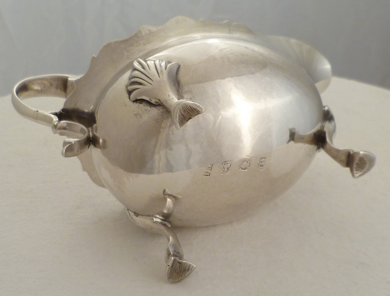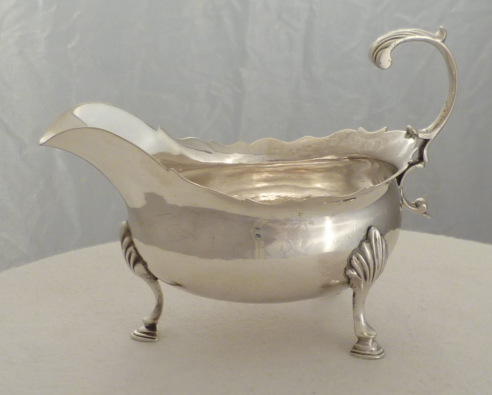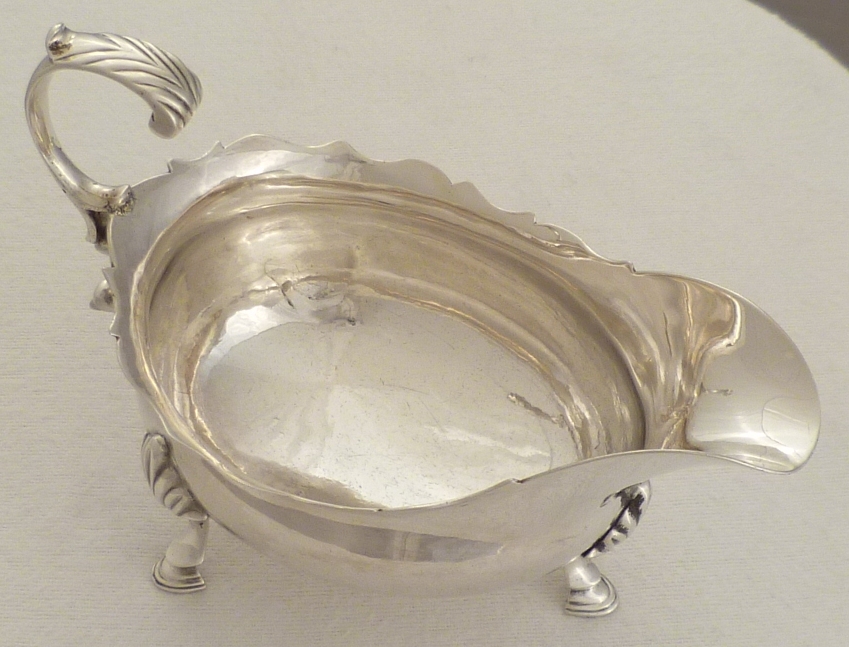 Good Georgian silver sauce boat with flying leaf capped C scroll handle, shell capped hoof feet, no engraving and exceptionally clear hallmarks. |