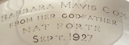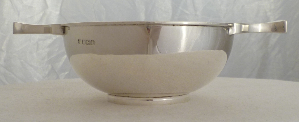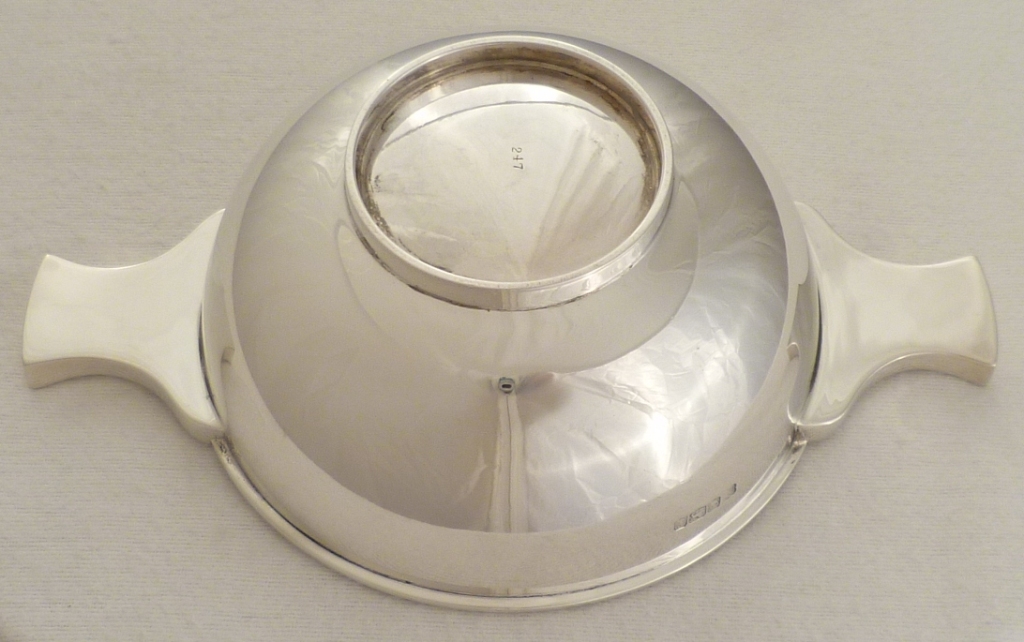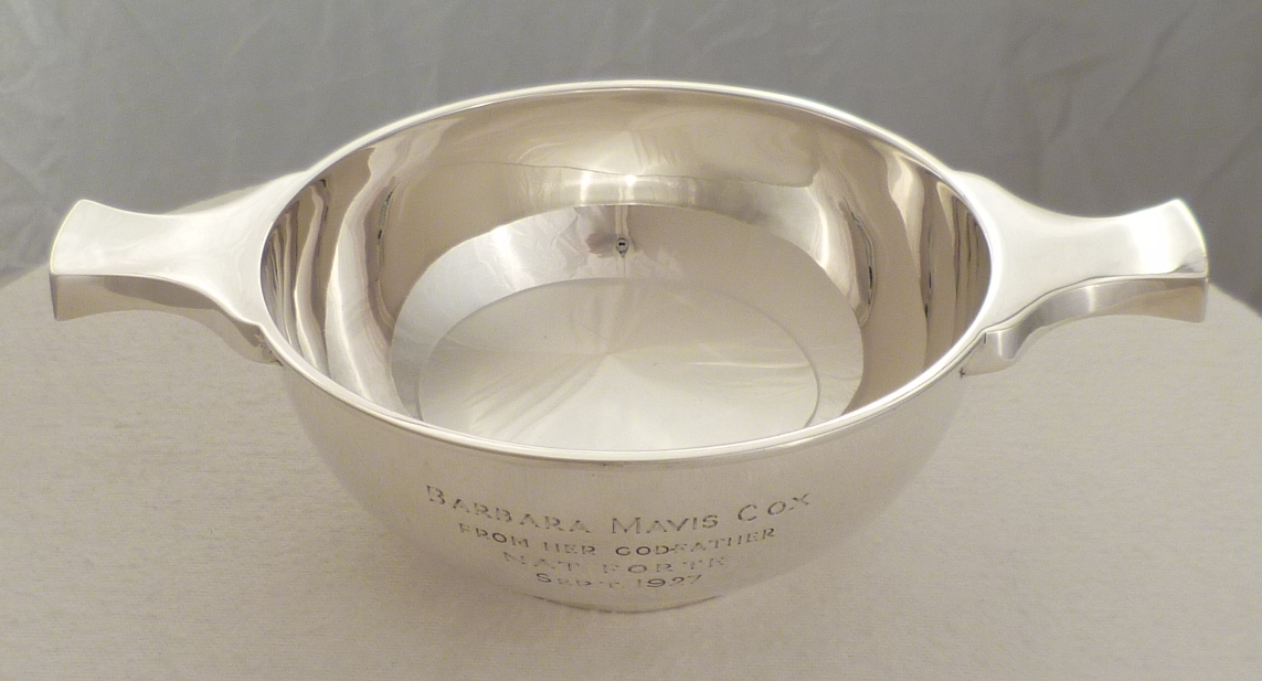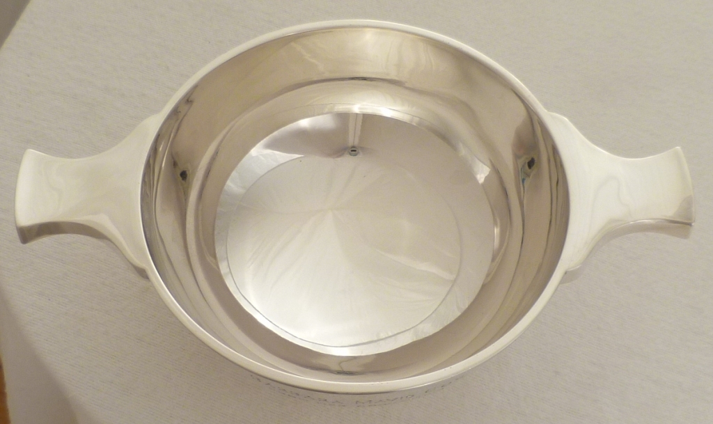 DESCRIPTION | Larger silver quaich with a presentation inscription. A quaich is a Scottish drinking vessel and these larger ones were intended to the passed around. The small examples are for personal use. The shaped lug handles enabled the item to be tied to a cord hung from your belt as the kilt is not famous for pockets. From the nature of the inscription this one appears to have been presented as a porringer or child's bowl. |