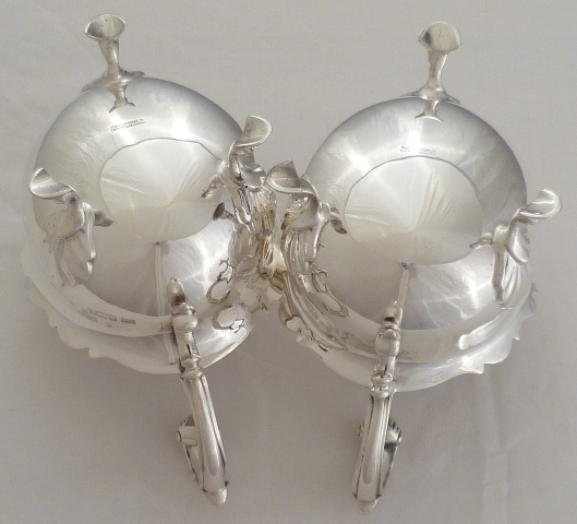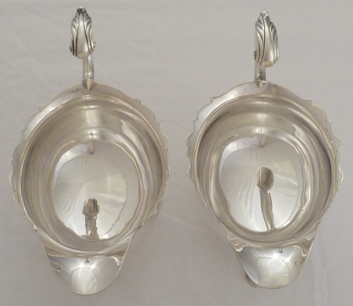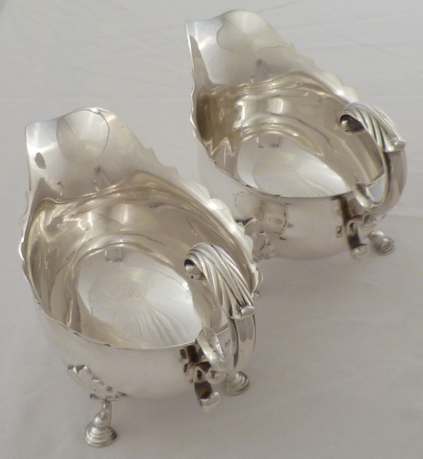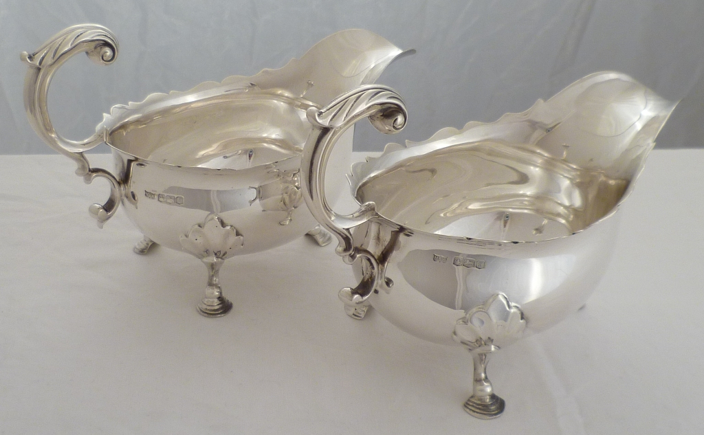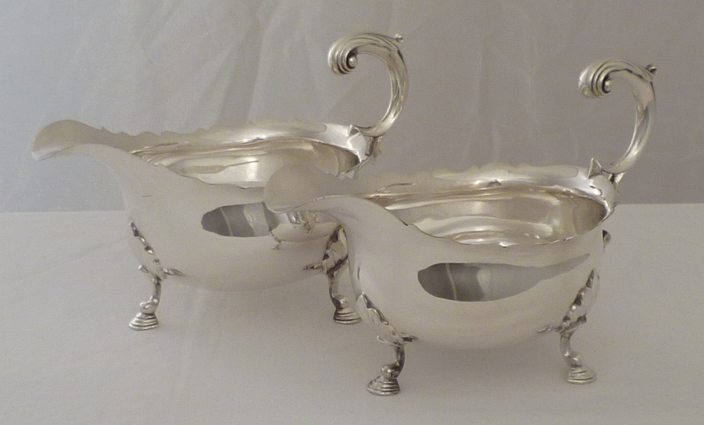 DESCRIPTION | Pair of good quality and generously proportioned silver sauce boats with shell capped hoof feet and flying leaf capped scrolling handles. |