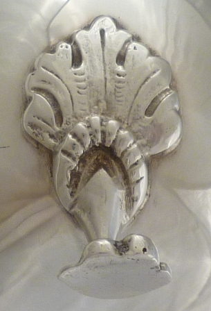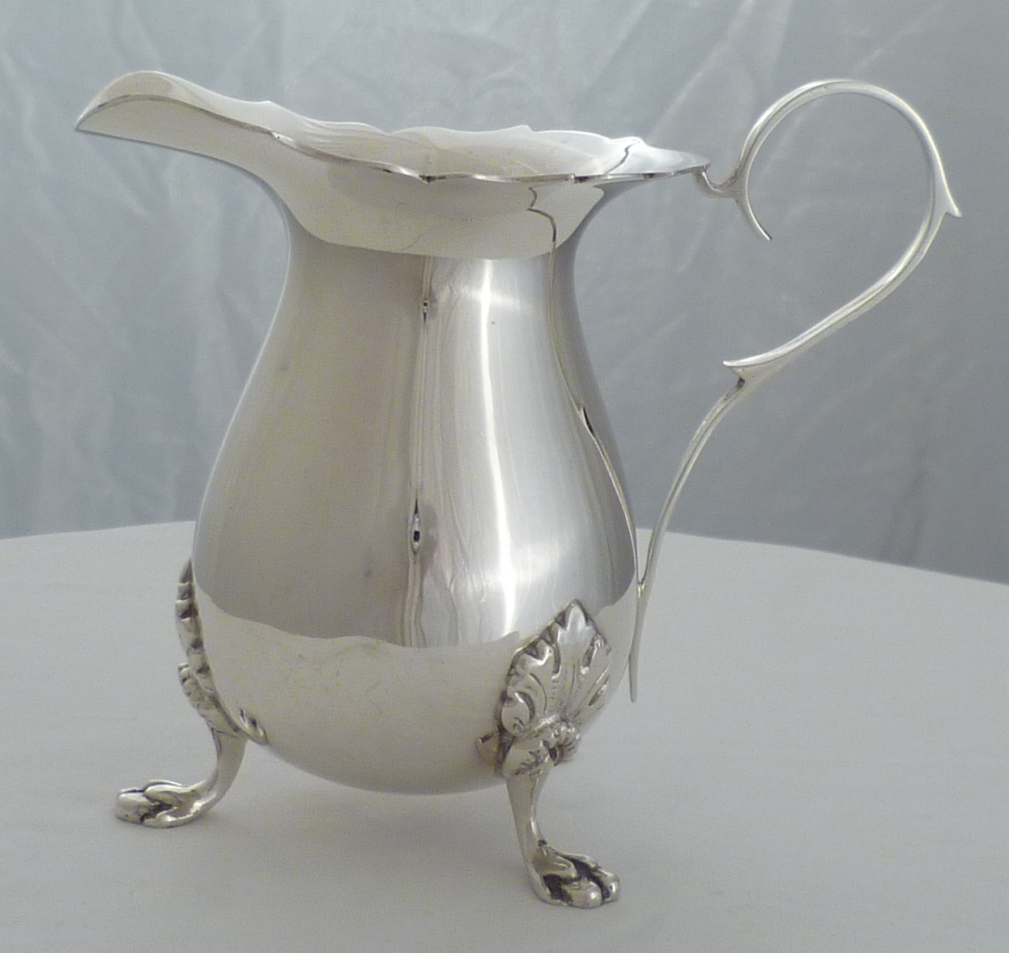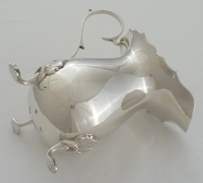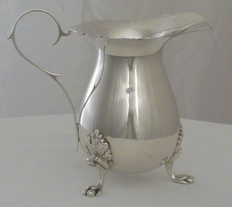 DESCRIPTION | Nice quality silver baluster tripod cream jug with leaf capped paw feet, scrolling handle and a flared wavy rim. |