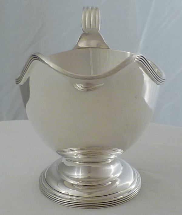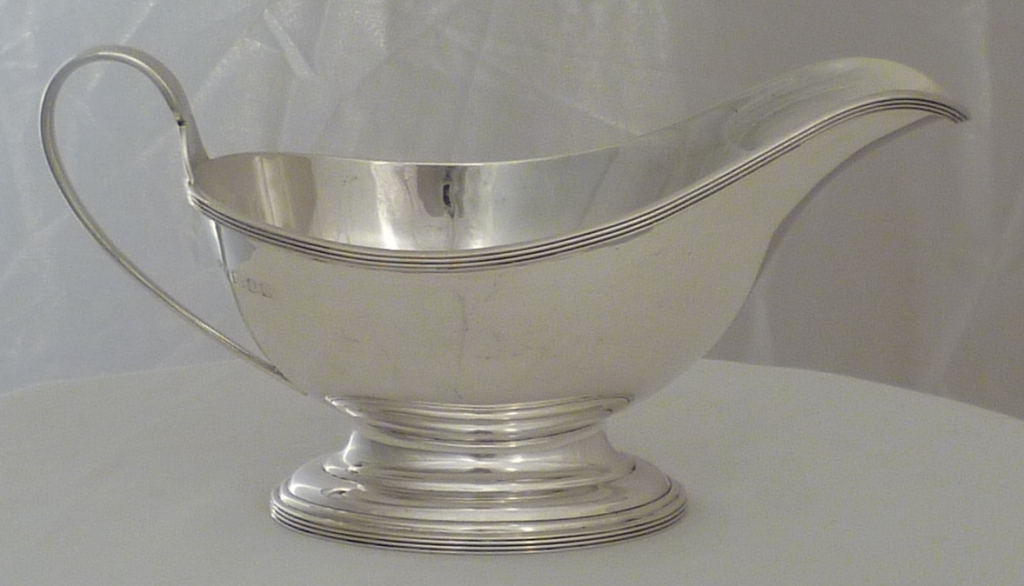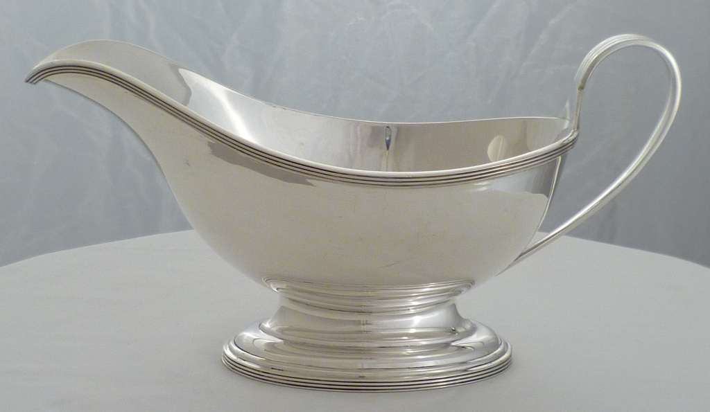 DESCRIPTION | Elegant and fine quality silver sauce boat on a oval pedestal base and with a thread decorated borders and handle. |
