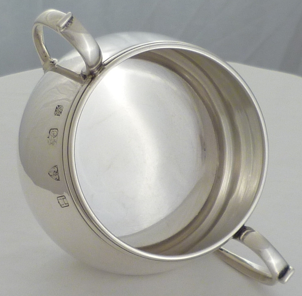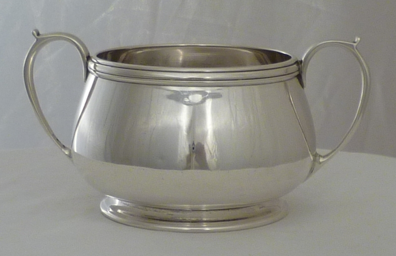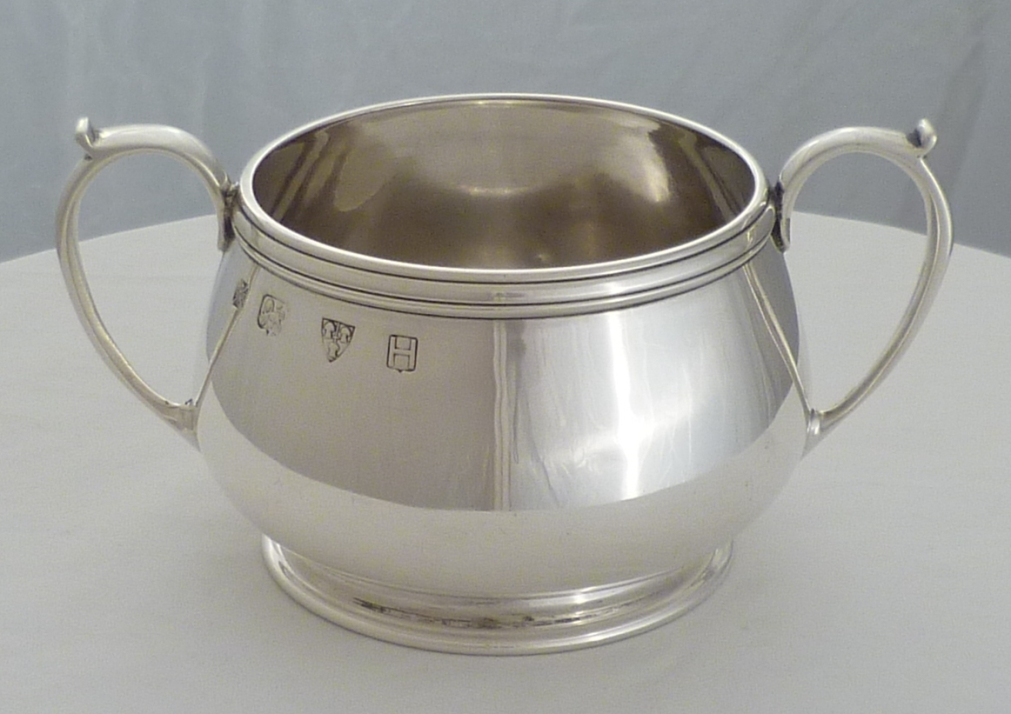 DESCRIPTION | Surprisingly heavy silver two handled circular sugar bowl on a ring foot. |